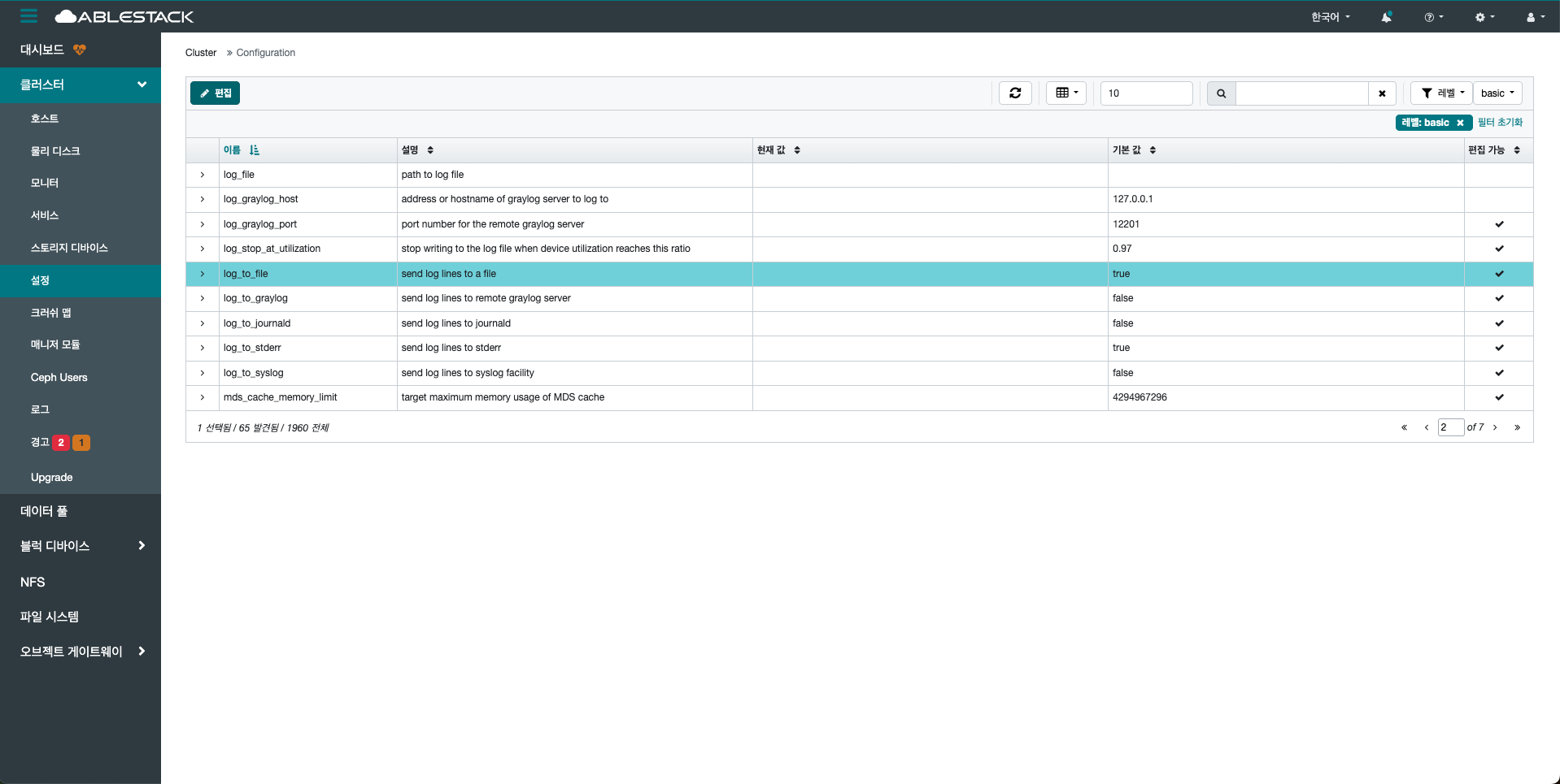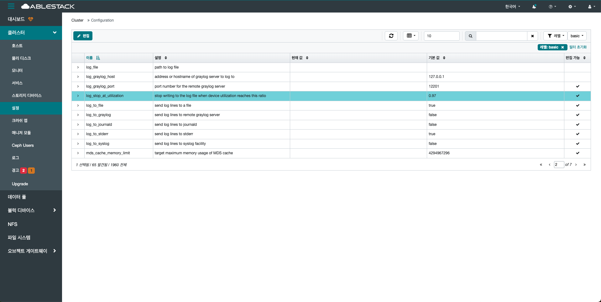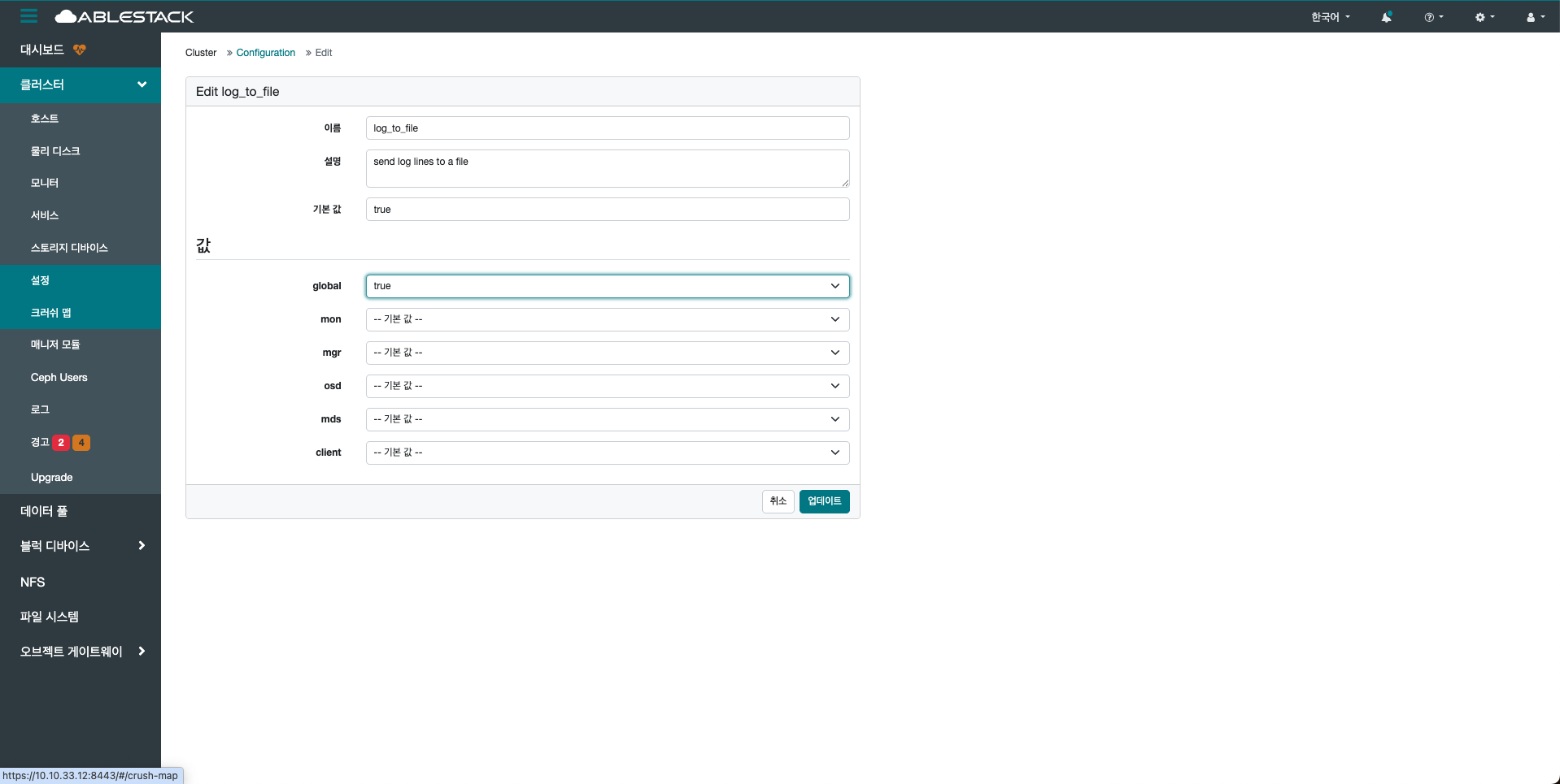 이 메뉴에서는 모니터(MON), OSD, MDS, RGW 등 주요 데몬들의 설정 항목들을 세부적으로 확인할 수 있으며, 설정 변경은 클러스터의 동작 방식에 직접적인 영향을 미칩니다. 또한 설정은 데몬 단위 또는 전체 클러스터 단위로 적용할 수 있어, 유연한 구성 변경이 가능합니다.