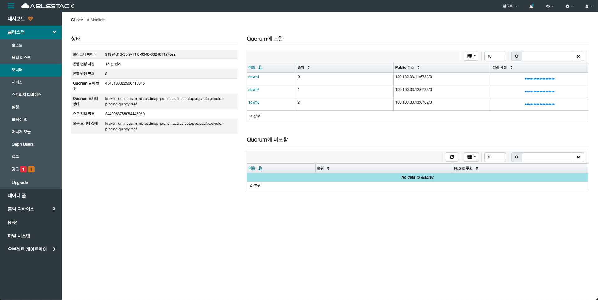 본 페이지에서는 각 MON의 이름, IP 주소, 상태, 리더 여부 등을 확인할 수 있으며, 클러스터 전반의 정상 동작 여부를 판단하는데 활용됩니다. MON이 불안정할 경우 클러스터 전체가 영향을 받을 수 있으므로, 지속적인 모니터링이 필요합니다.