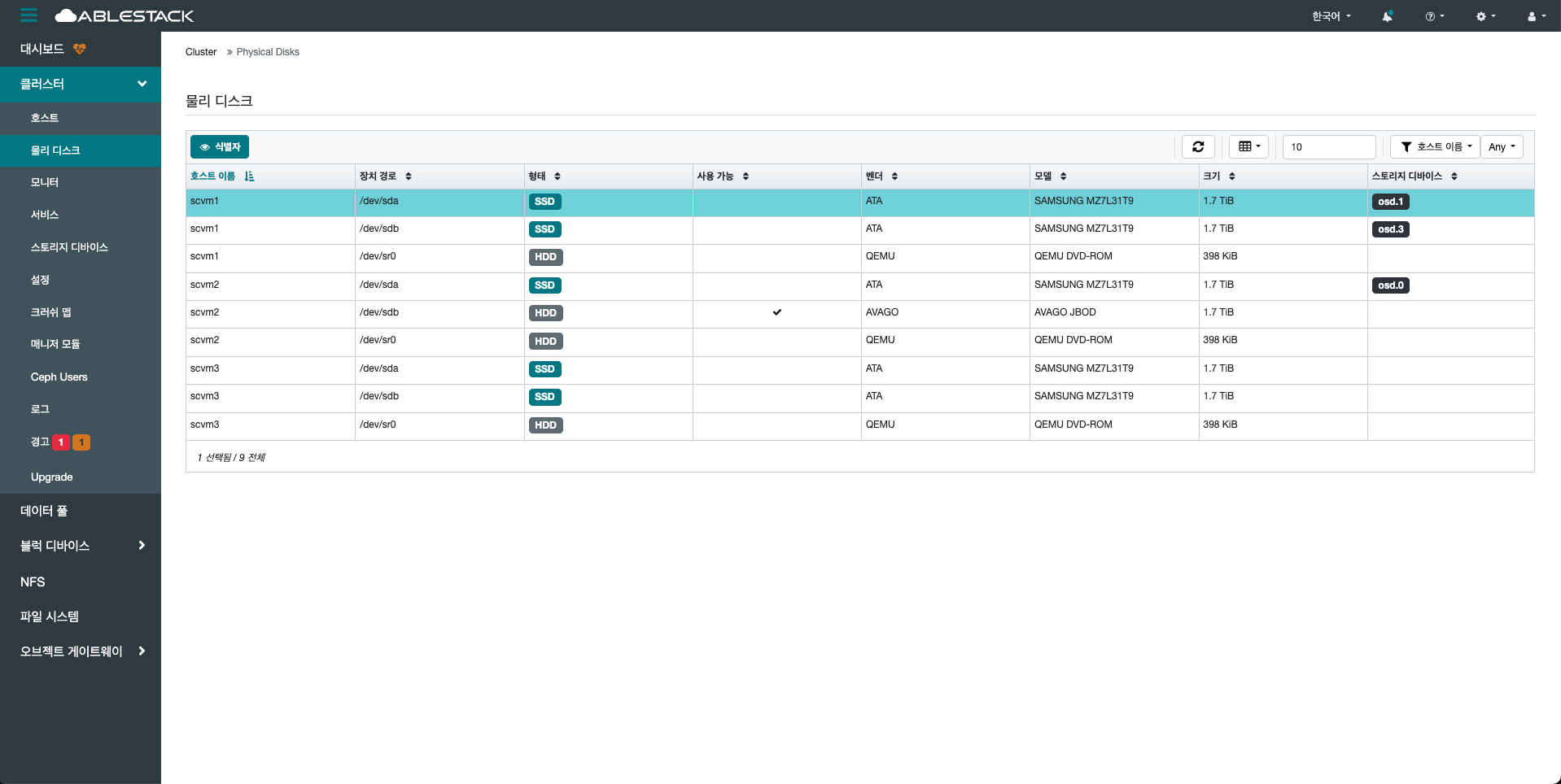 데이터를 실제로 저장하는 메뉴입니다. 각 디스크는 OSD(Object Storage Daemon)와 연결되어, 데이터를 분산 저장하고 복제하는 데 사용됩니다. 하나의 호스트에는 여러 개의 디스크가 연결될 수 있으며, 이를 통해 고가용성과 확장성을 제공합니다.