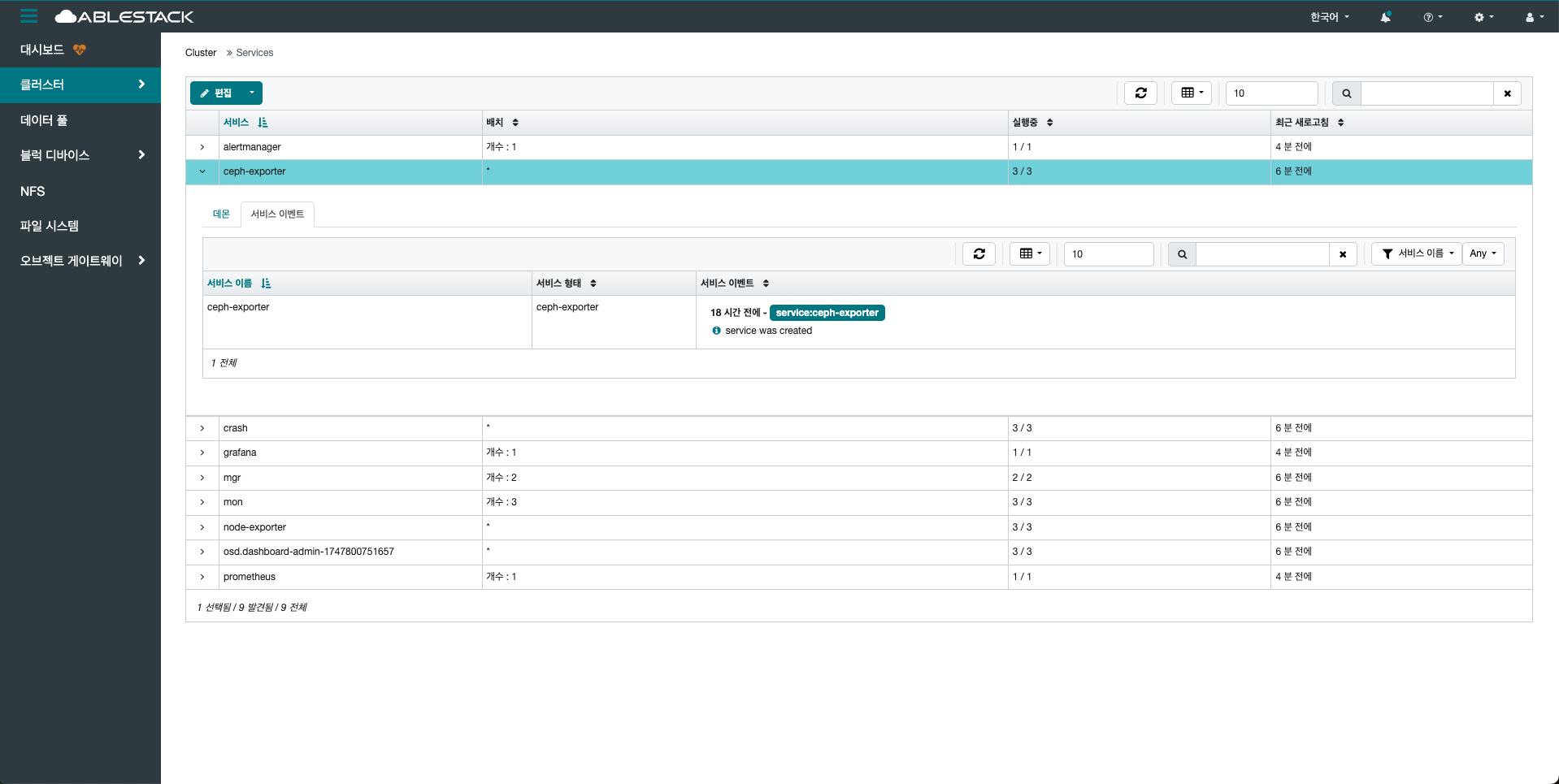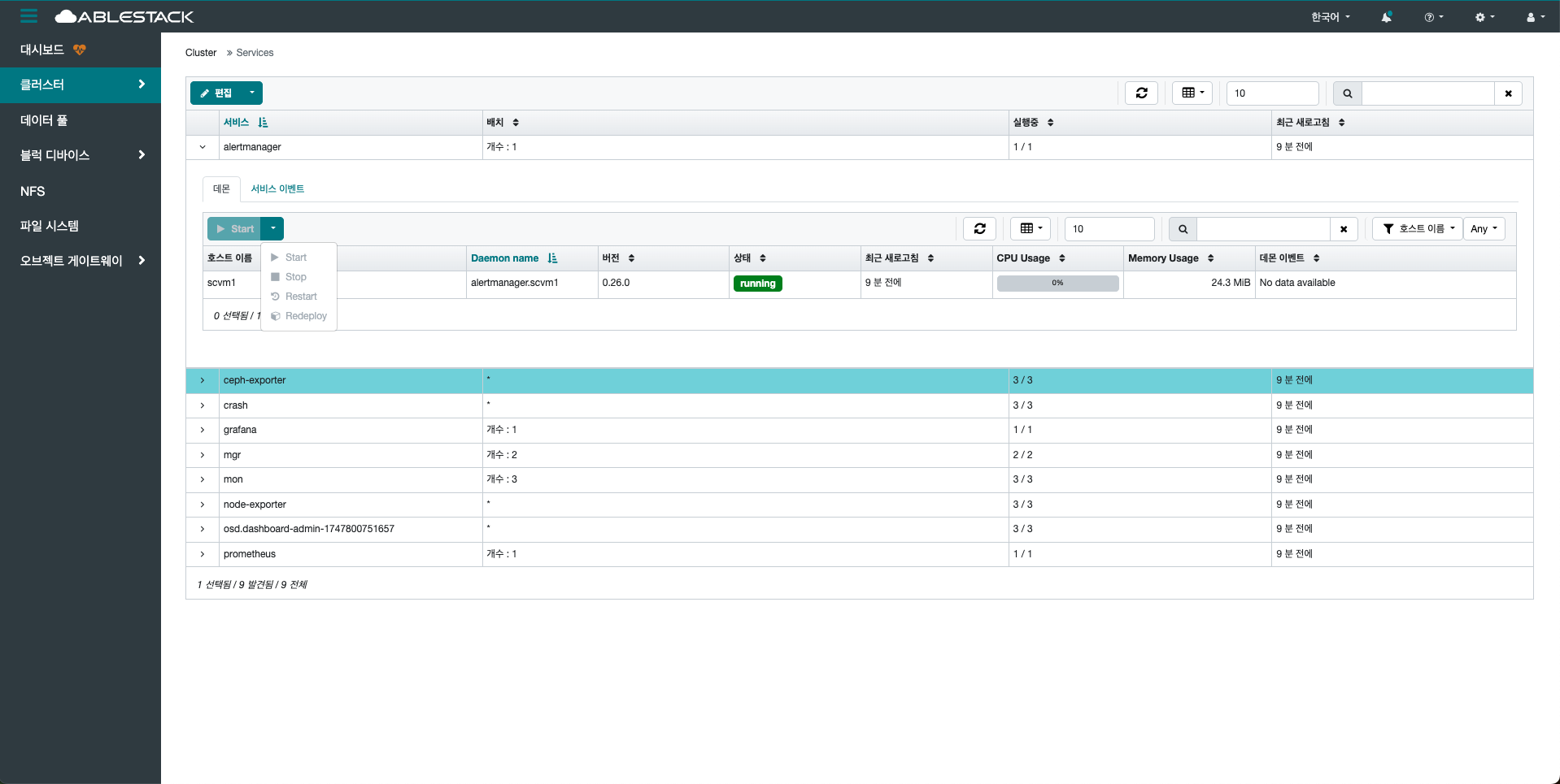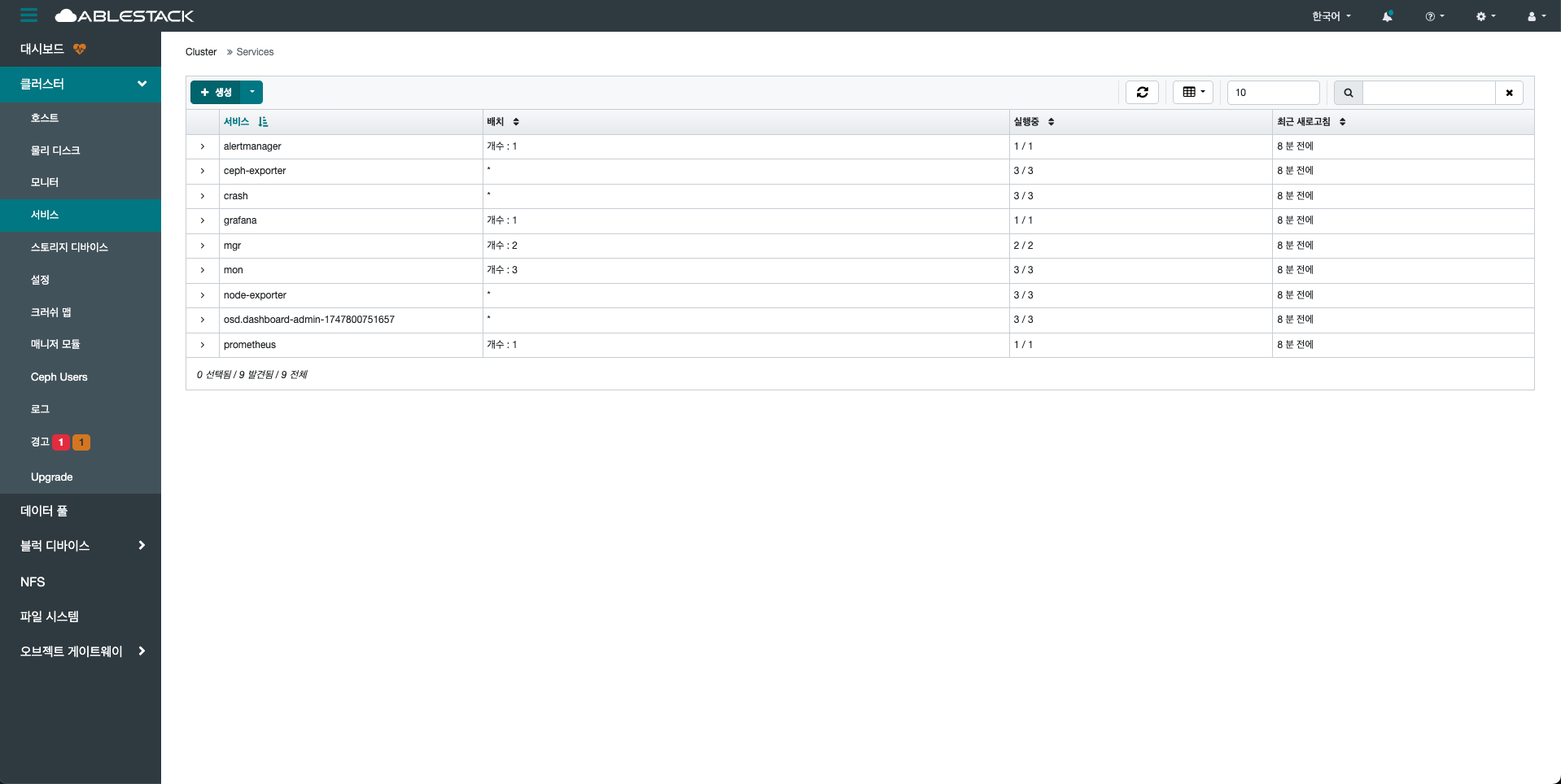 클러스터 내에서 실행 중인 모든 서비스(데몬)의 상태를 종합적으로 확인할 수 있는 영역입니다.