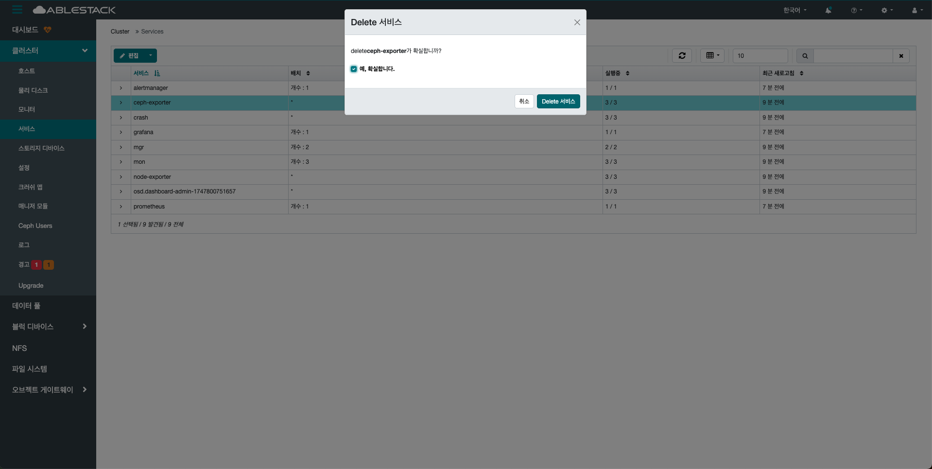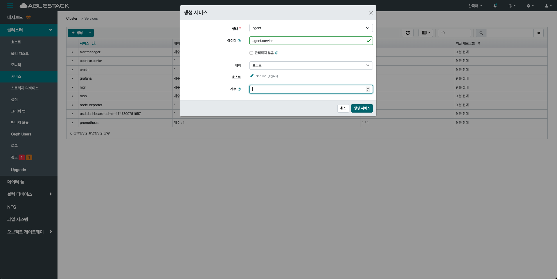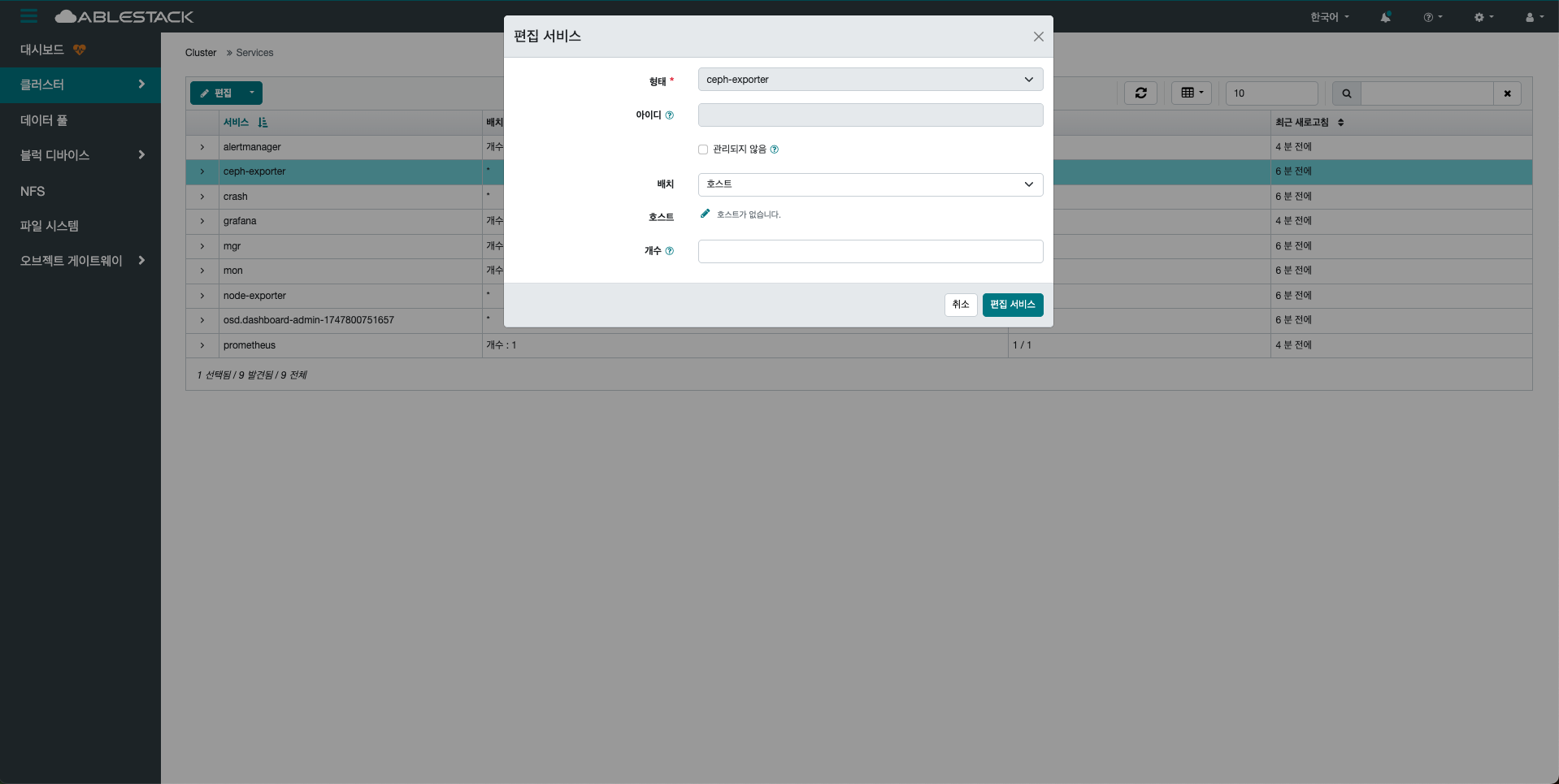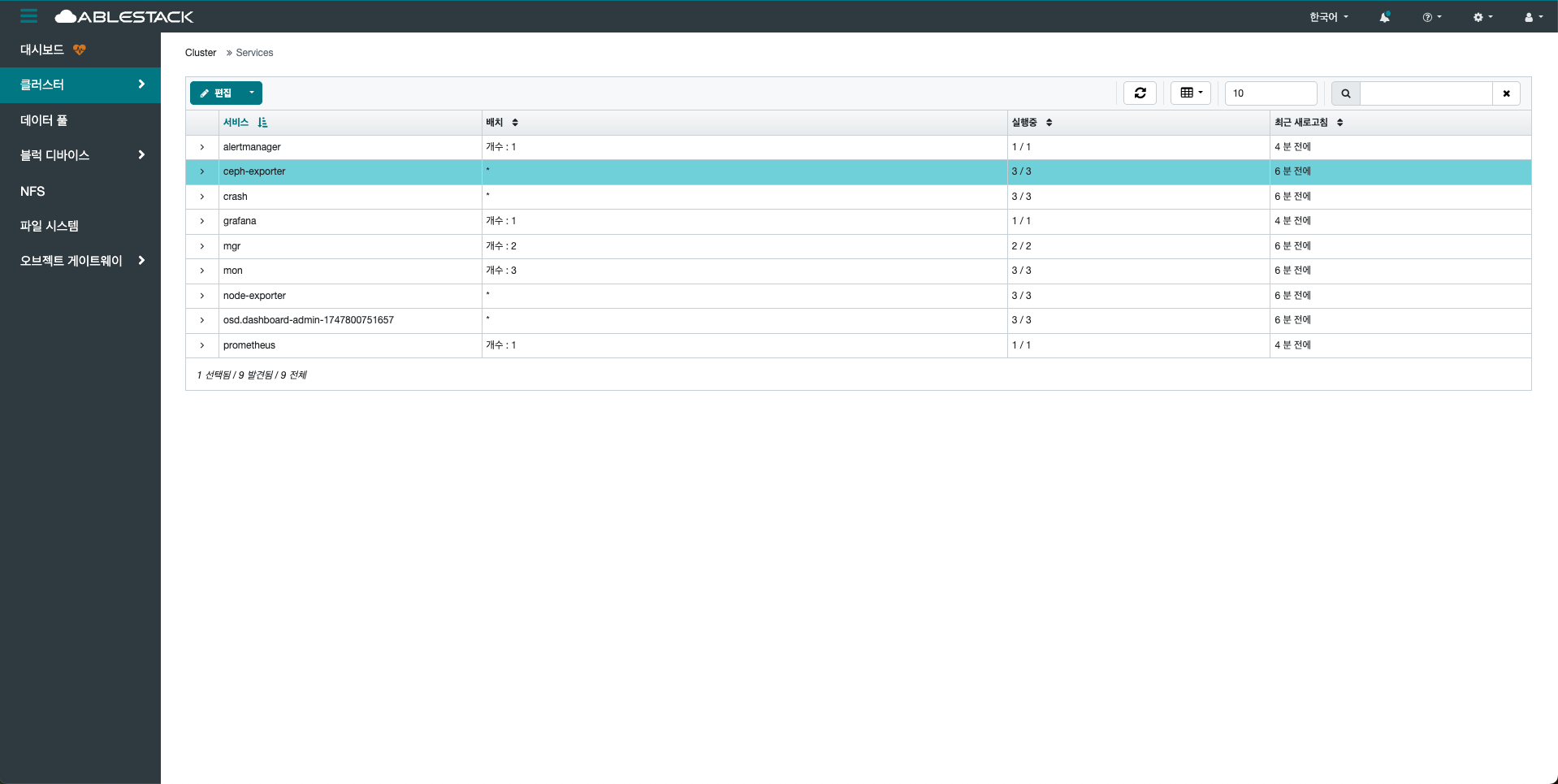 클러스터 내에서 실행 중인 모든 서비스(데몬)의 상태를 종합적으로 확인할 수 있는 영역입니다.