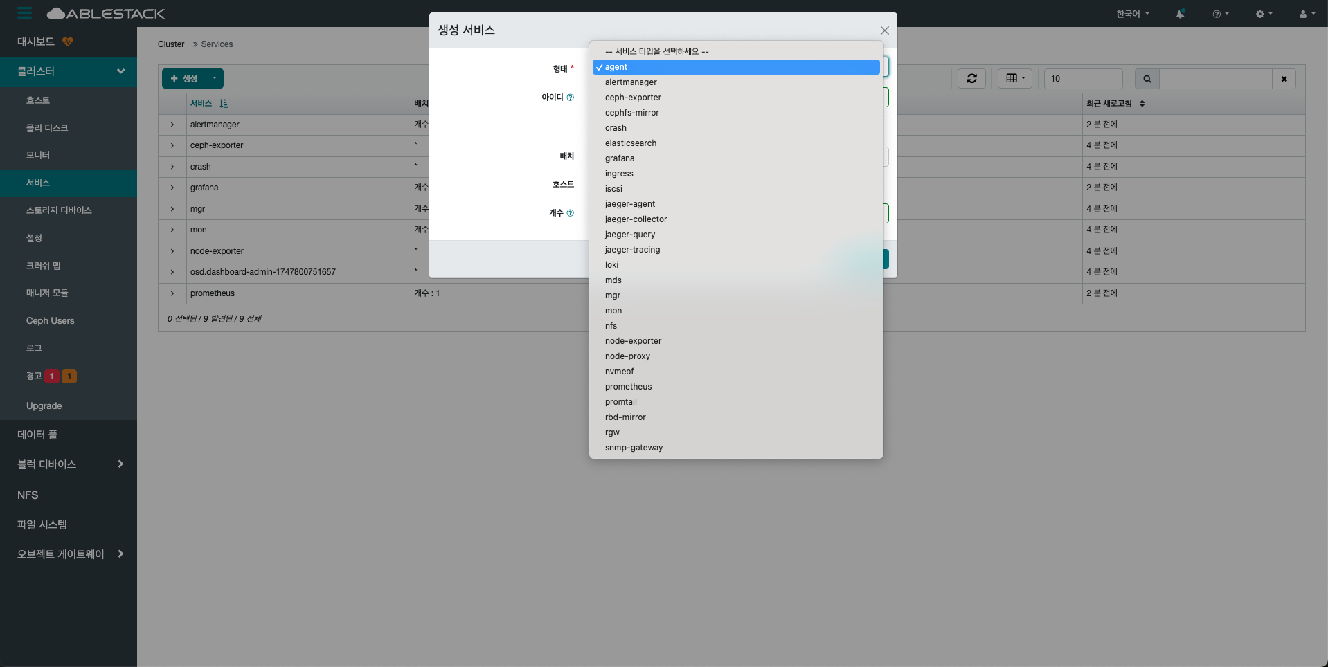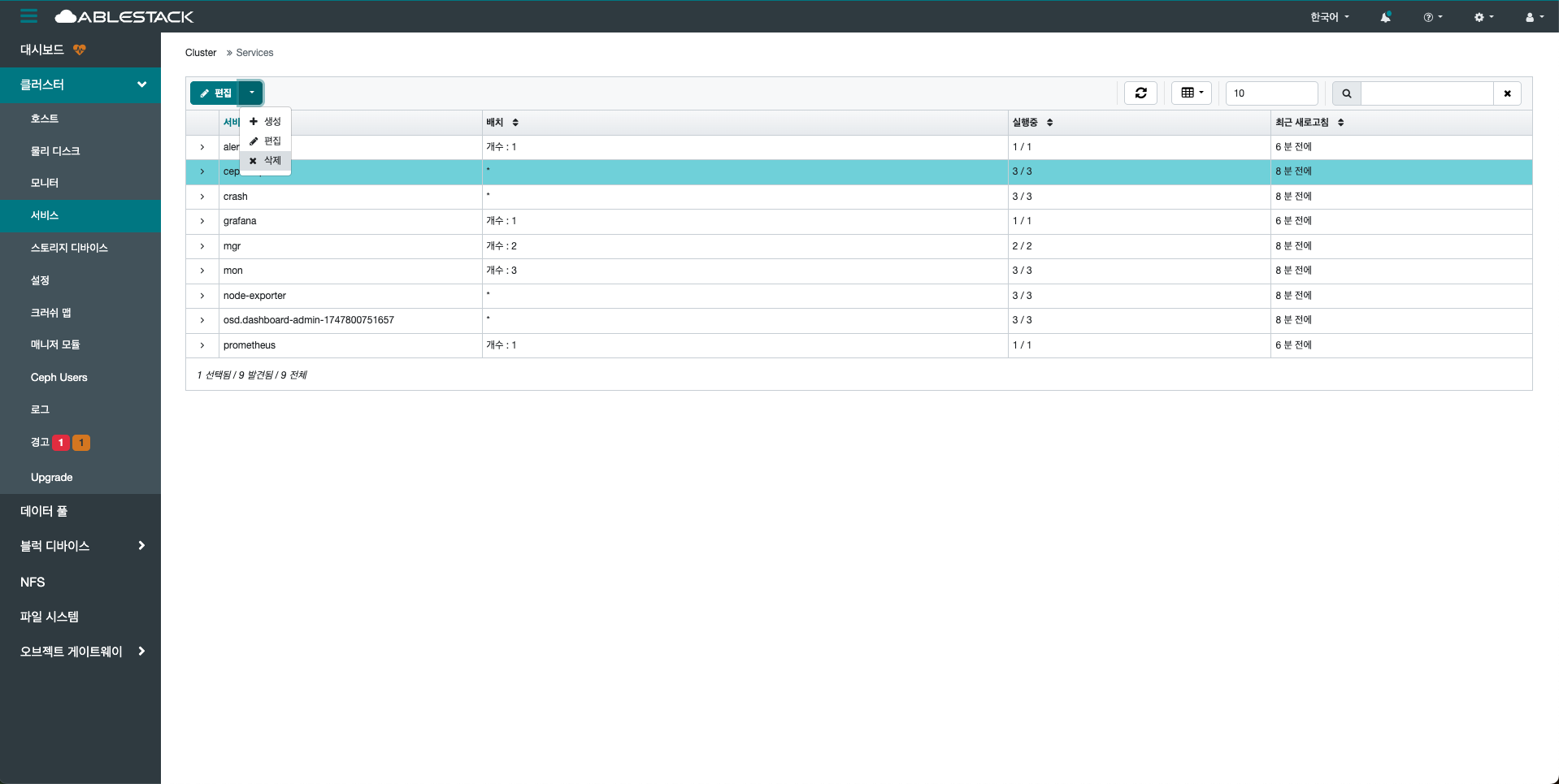 이 메뉴를 통해 MON(Monitor), OSD(Object Storage Daemon), MGR(Manager), MDS(Metadata Server), RGW(RADOS Gateway) 등 다양한 구성 요소들의 상태, 호스트 정보, 버전, 상태 코드 등을 확인할 수 있습니다.