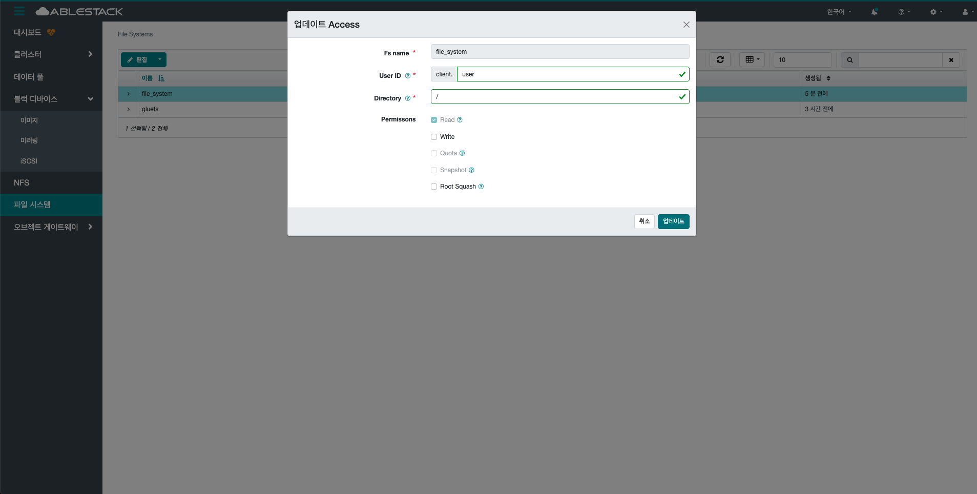 선택한 File System의 접근 정보를 변경합니다.