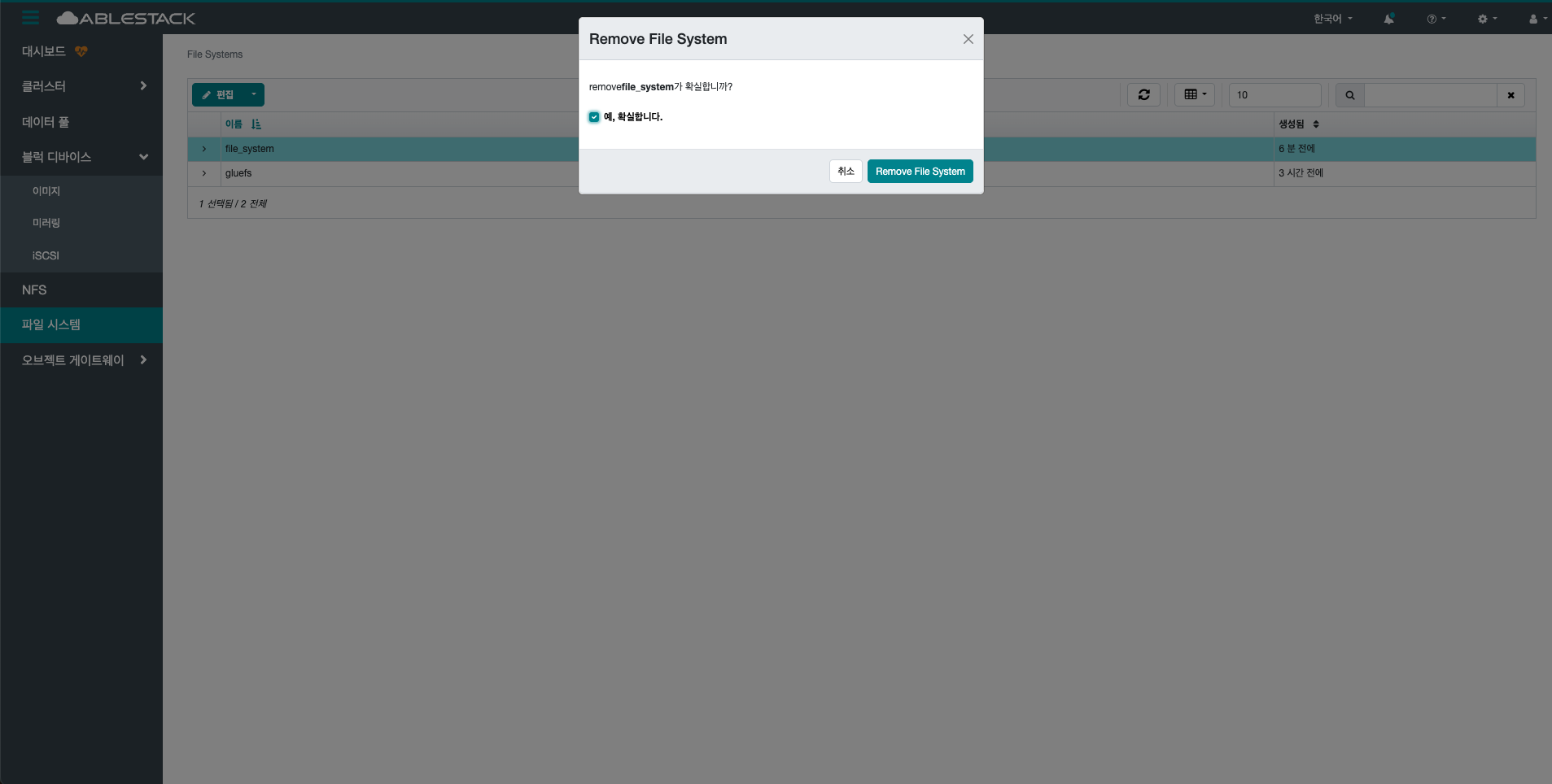 - 제거 버튼을 클릭하여 Remove File System 화면을 호출합니다.