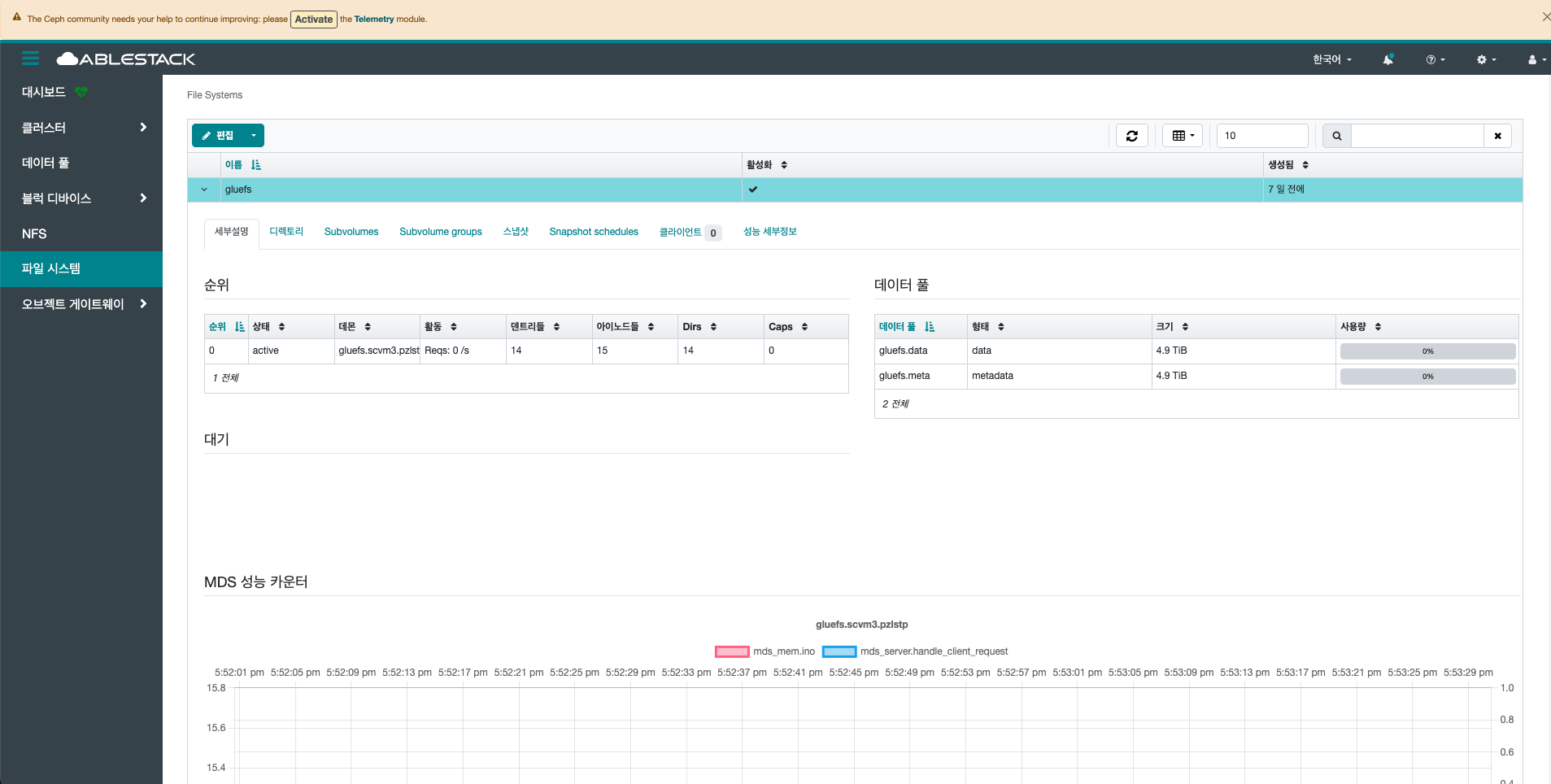 파일 시스템은 Glue에서 제공하는 POSIX 호환 분산 파일 시스템으로, 메타데이터 서버가 파일과 디렉터리를 관리하고 데이터는 RADOS에 저장됩니다. 확장성과 안정성이 뛰어나 다양한 대규모 환경에서 활용됩니다.