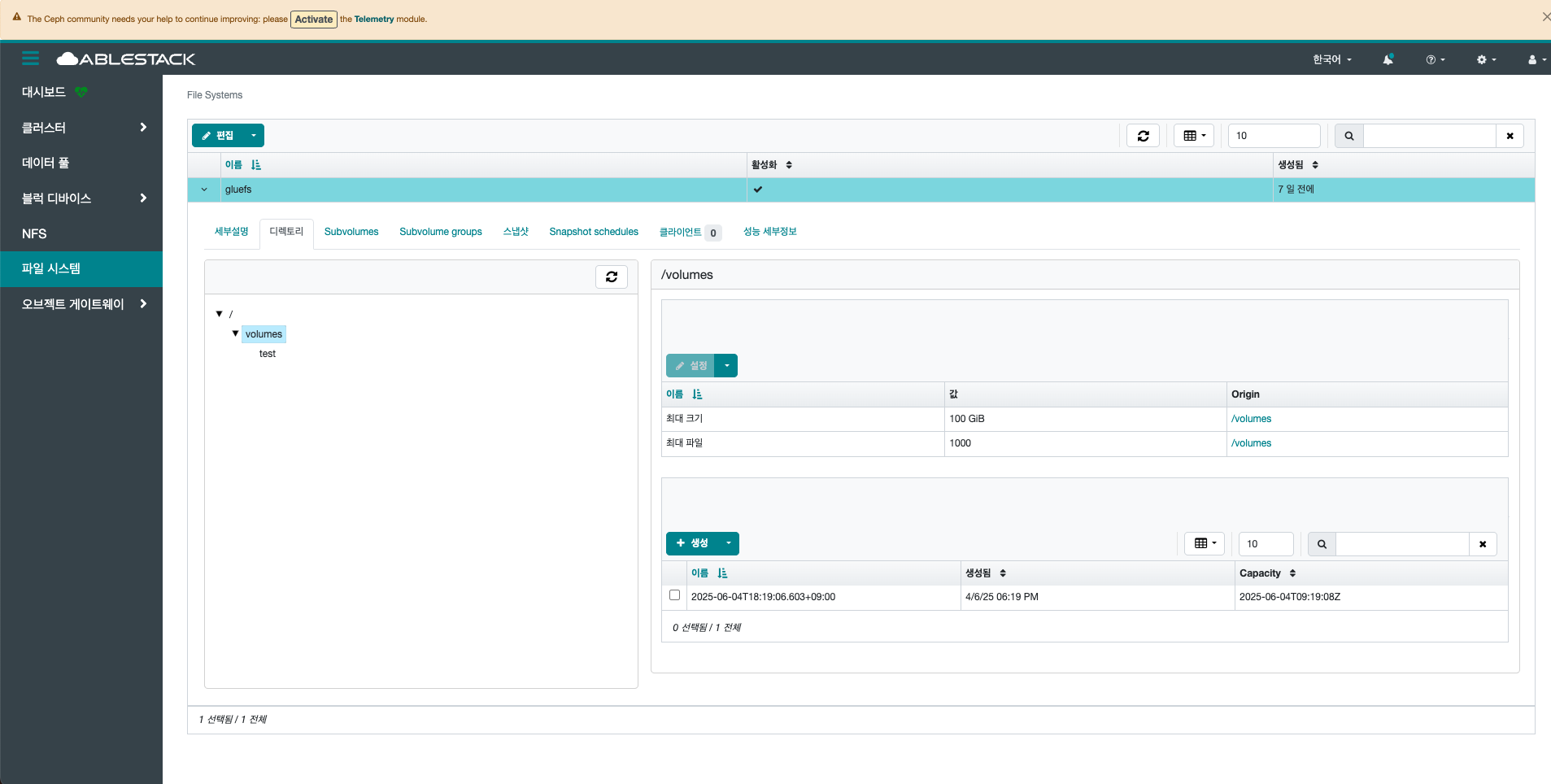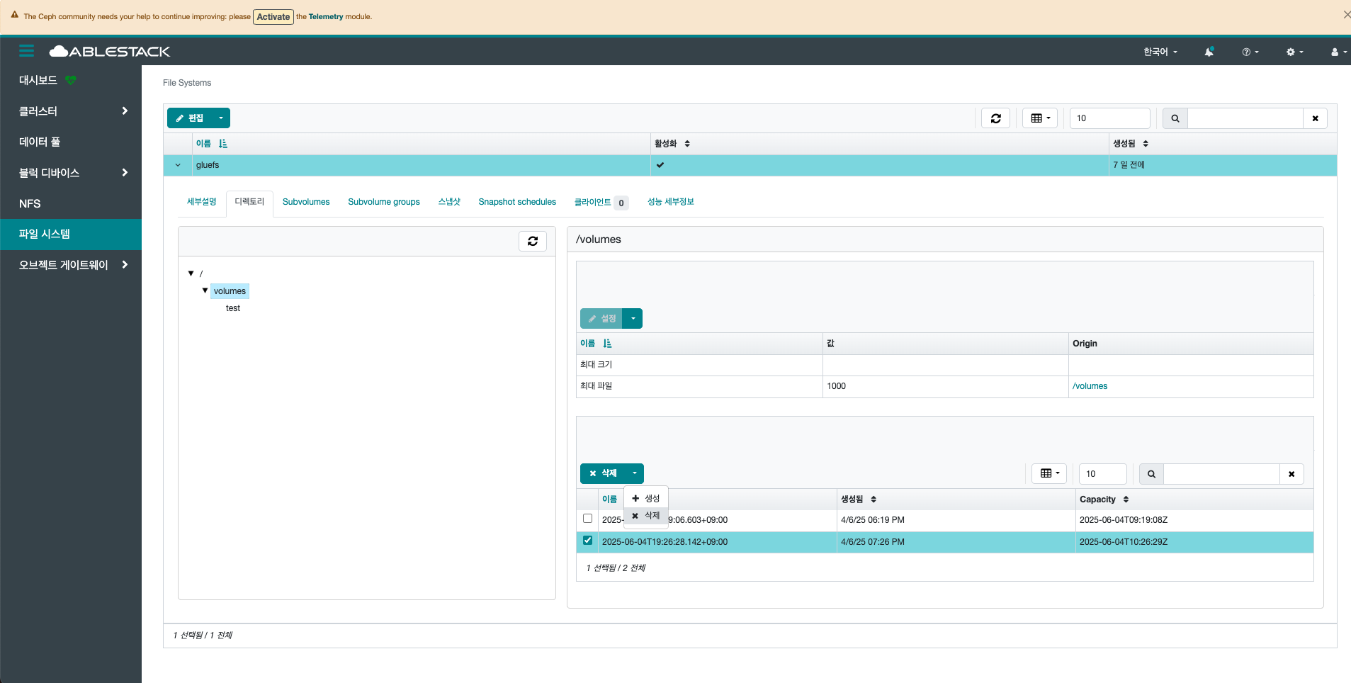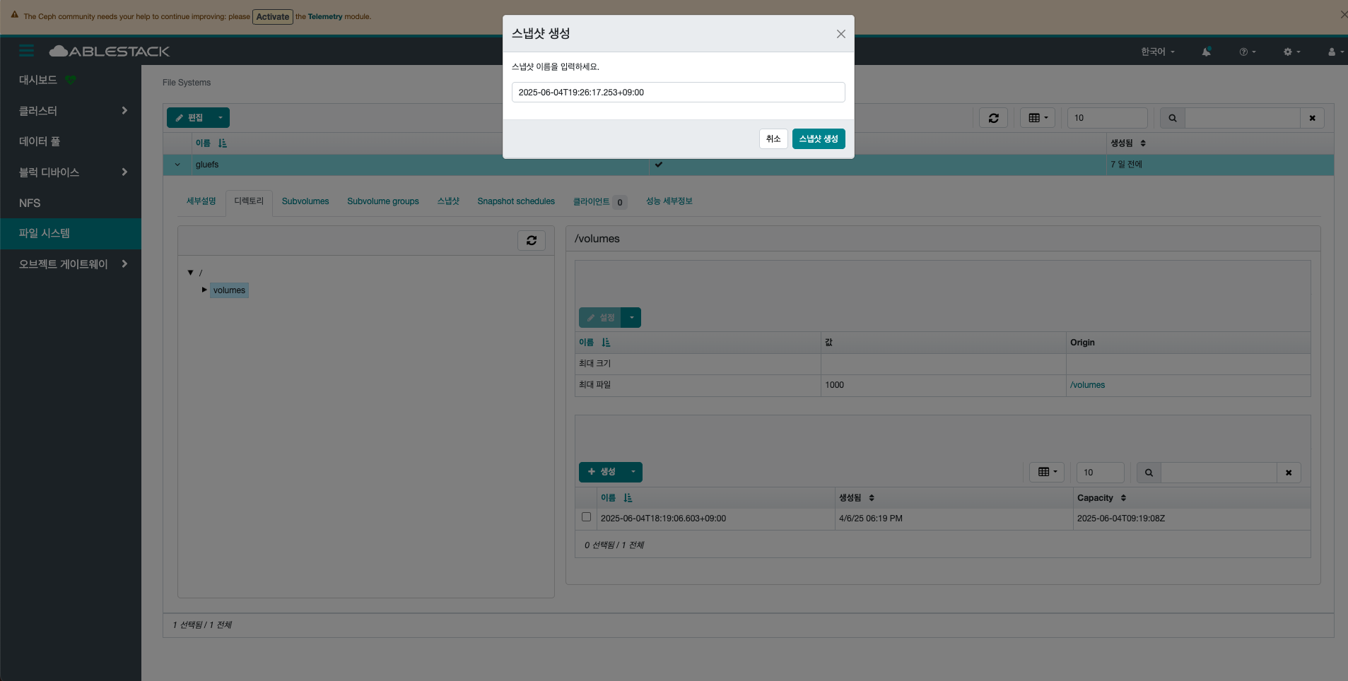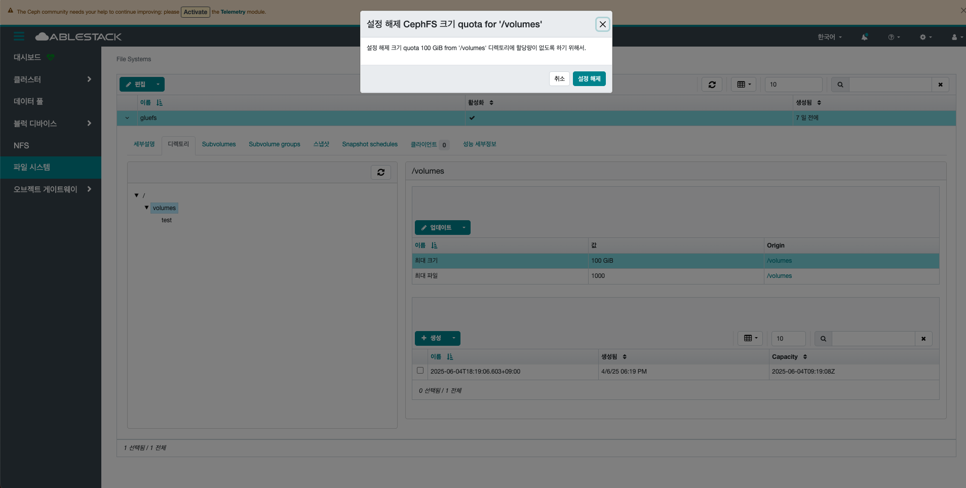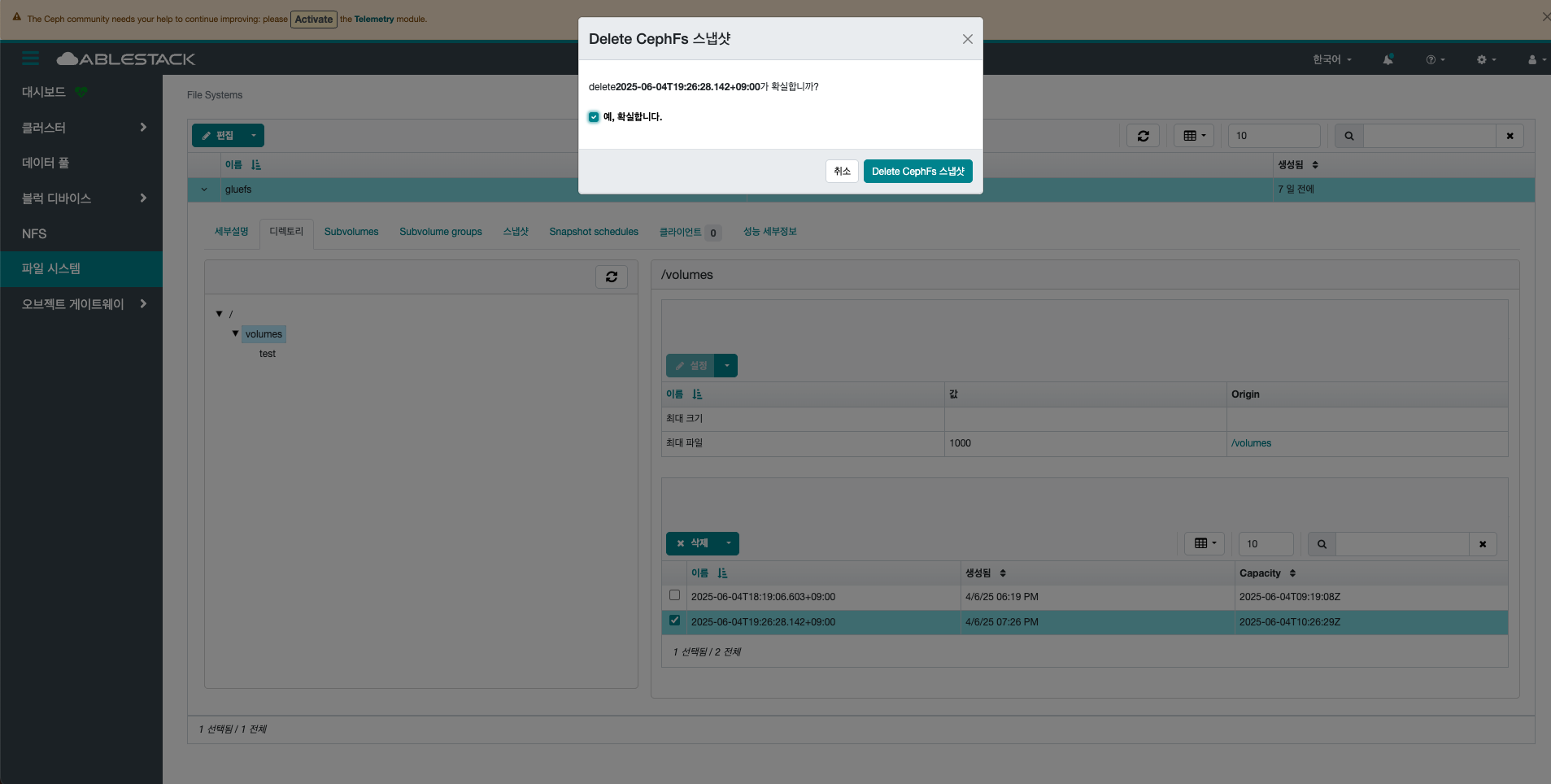 - Delete CephFs 스냅샷 버튼을 클릭하여 스냅샷을 삭제합니다.