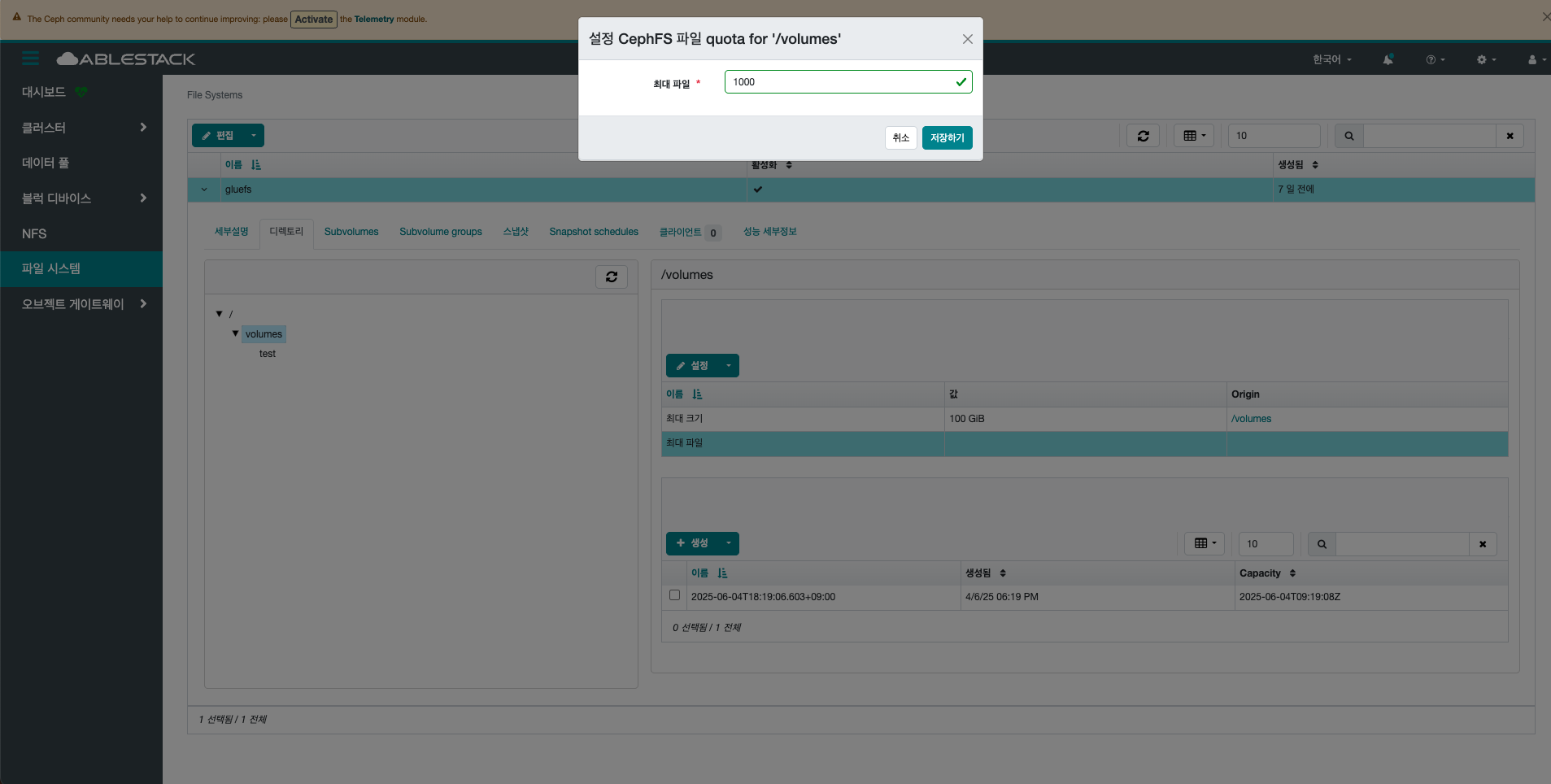 File System 디렉토리의 최대 파일 수 업데이트를 위한 항목을 입력합니다.
