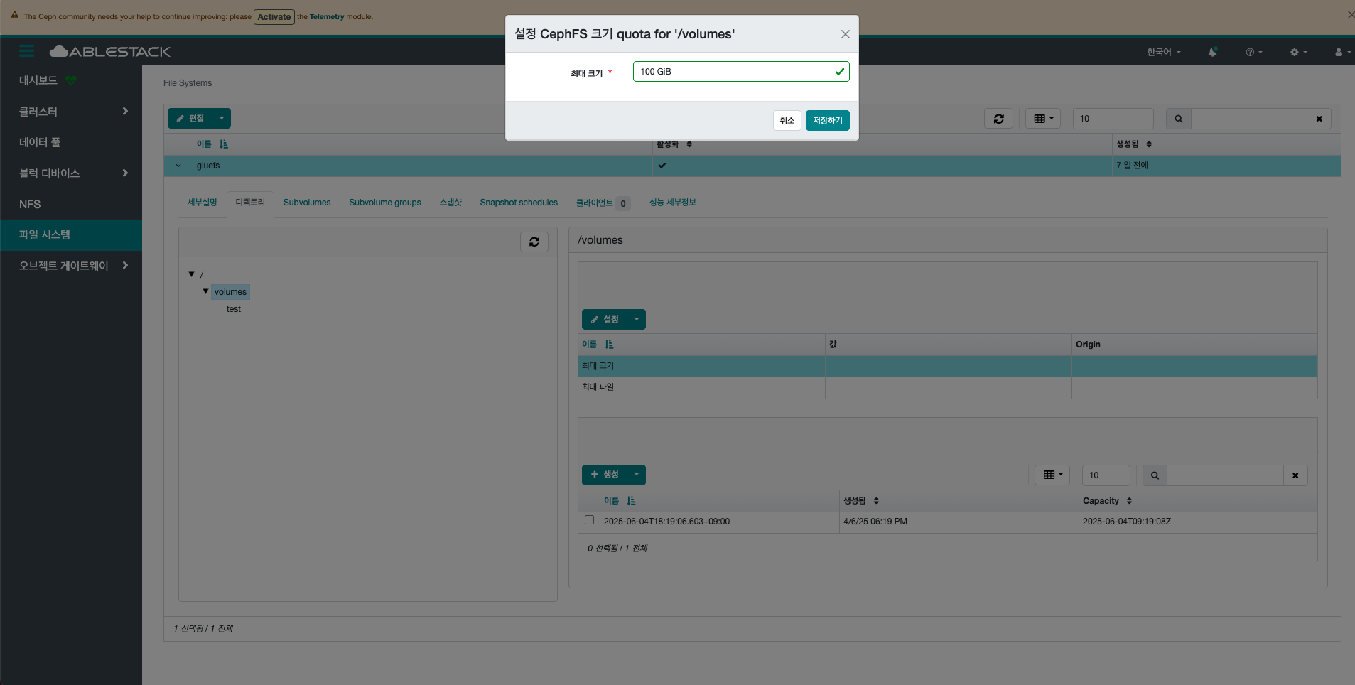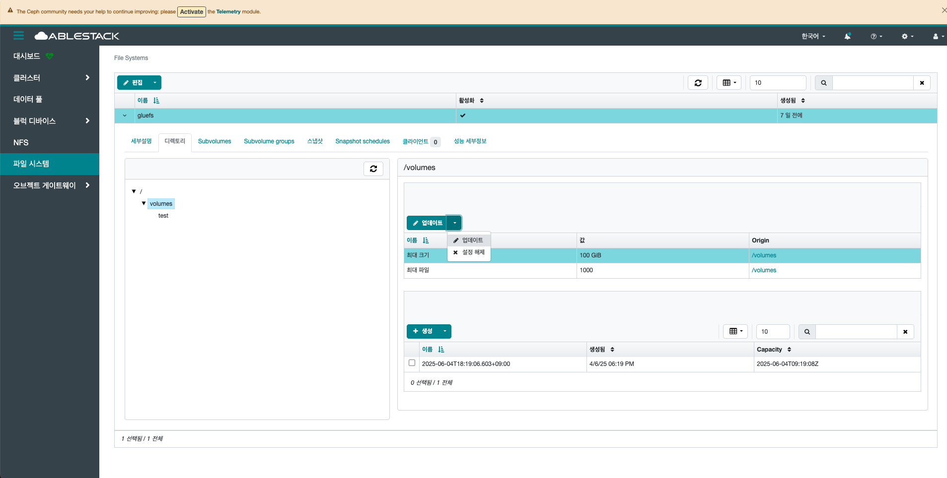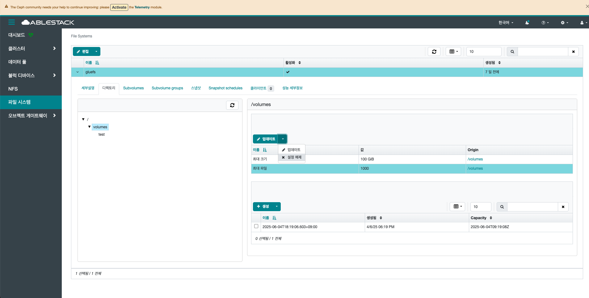 선택한 File System의 디렉토리의 최대 크기를 업데이트합니다.