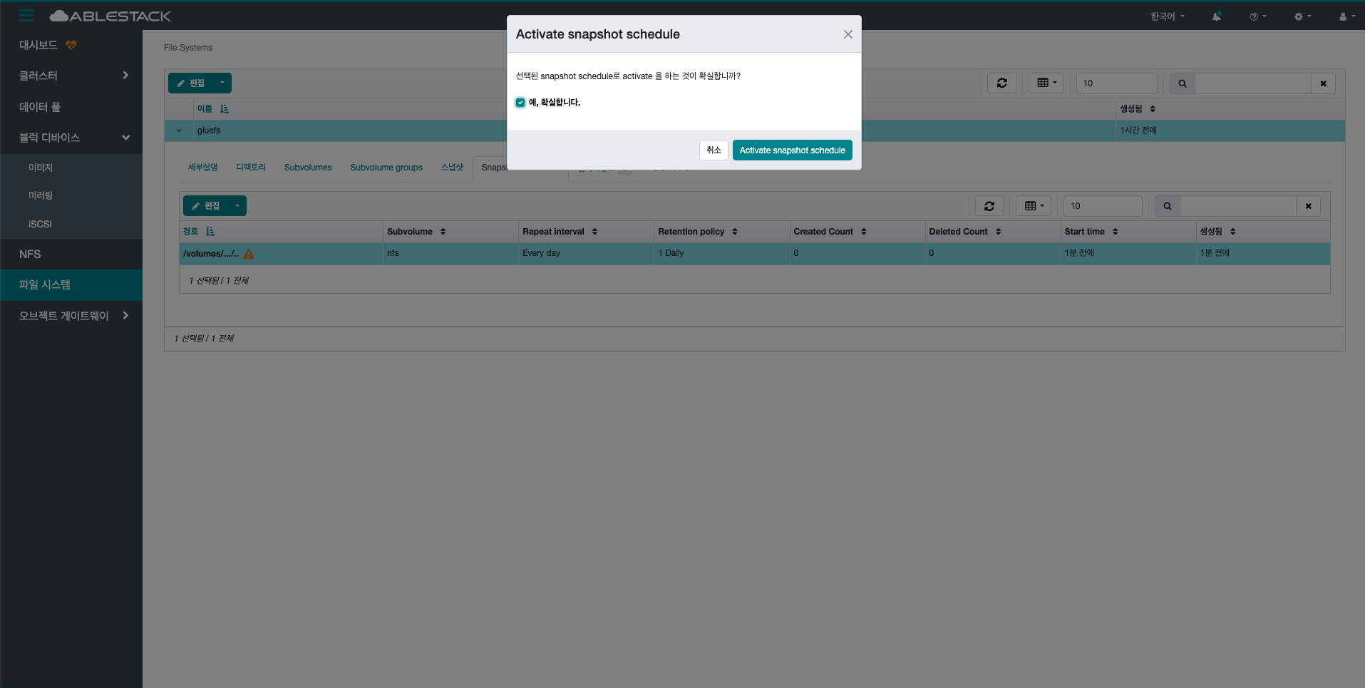 선택한 snapshot schedule을 활성화 합니다.