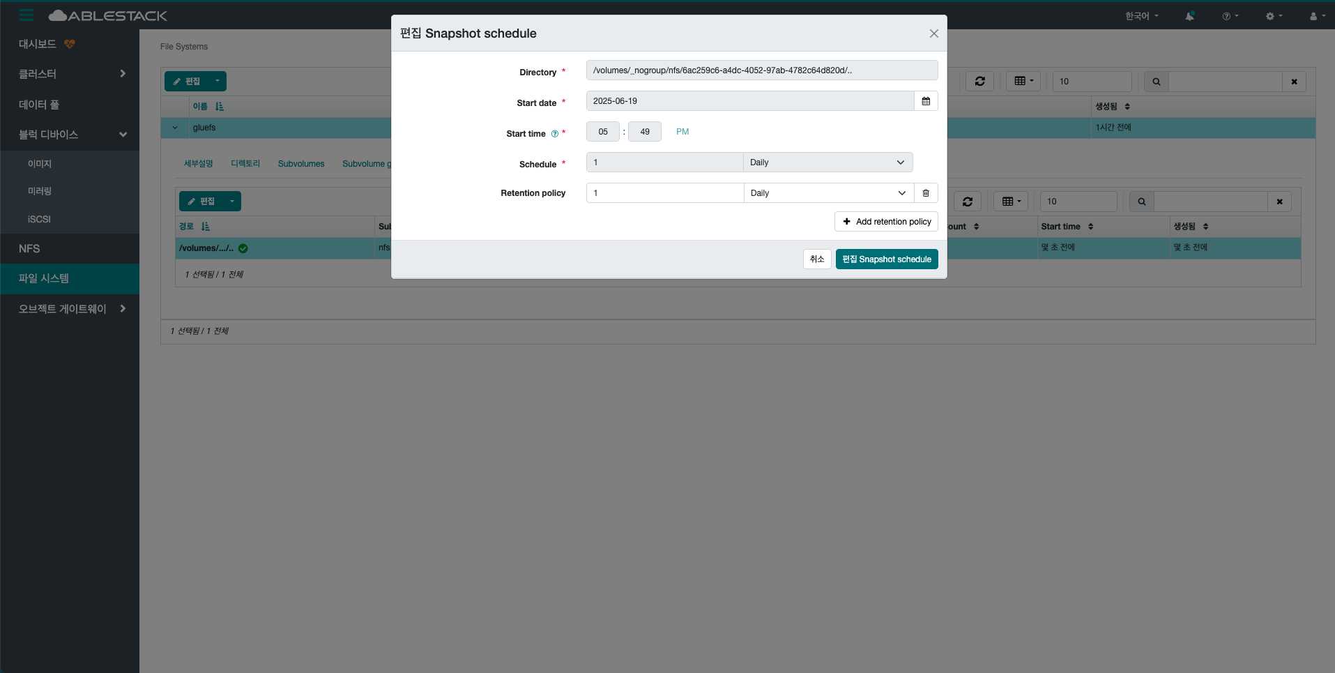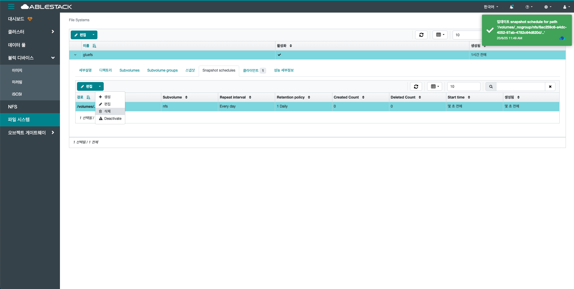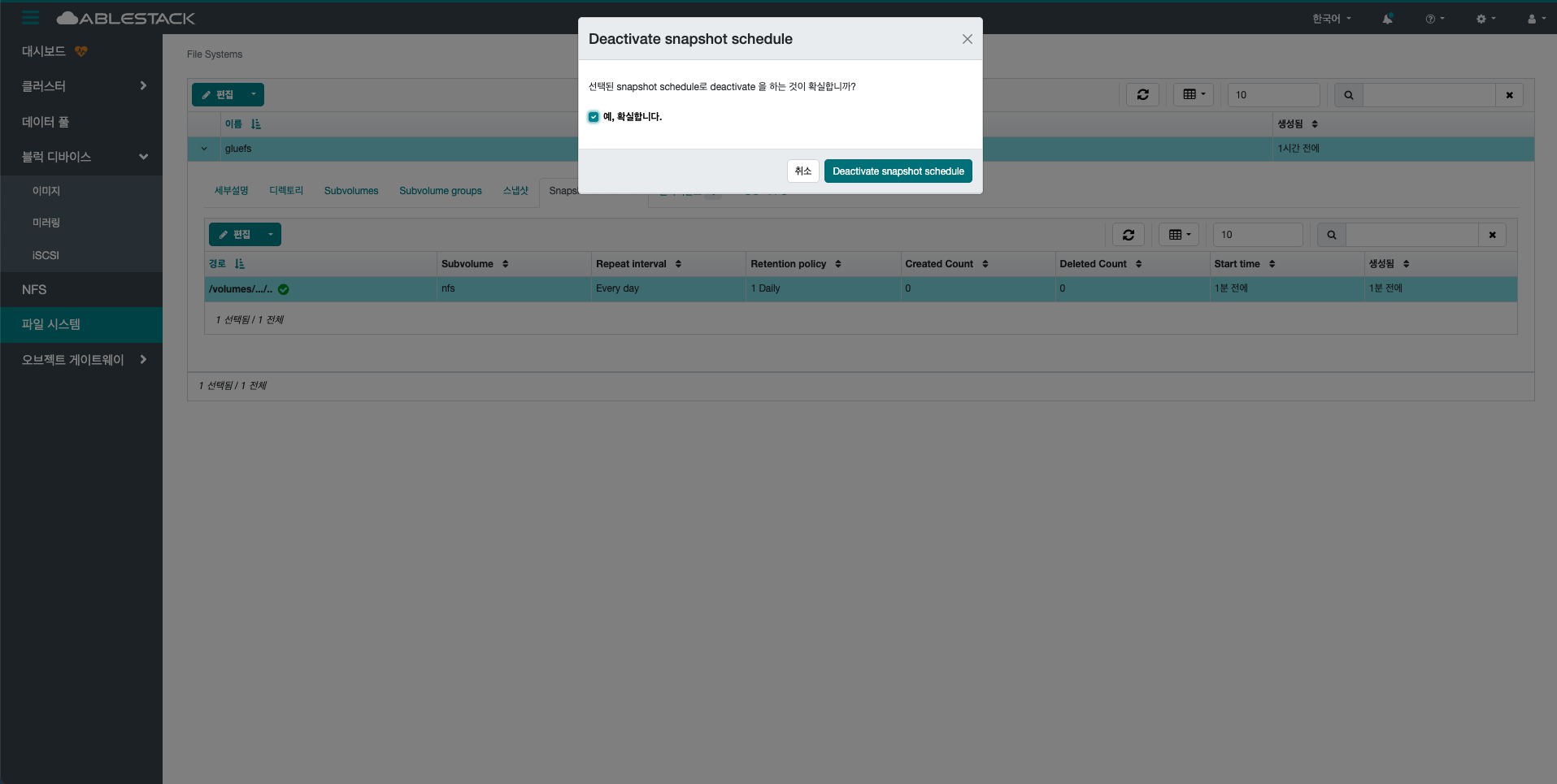 선택한 File System의 디렉토리의 스냅샷을 삭제합니다.