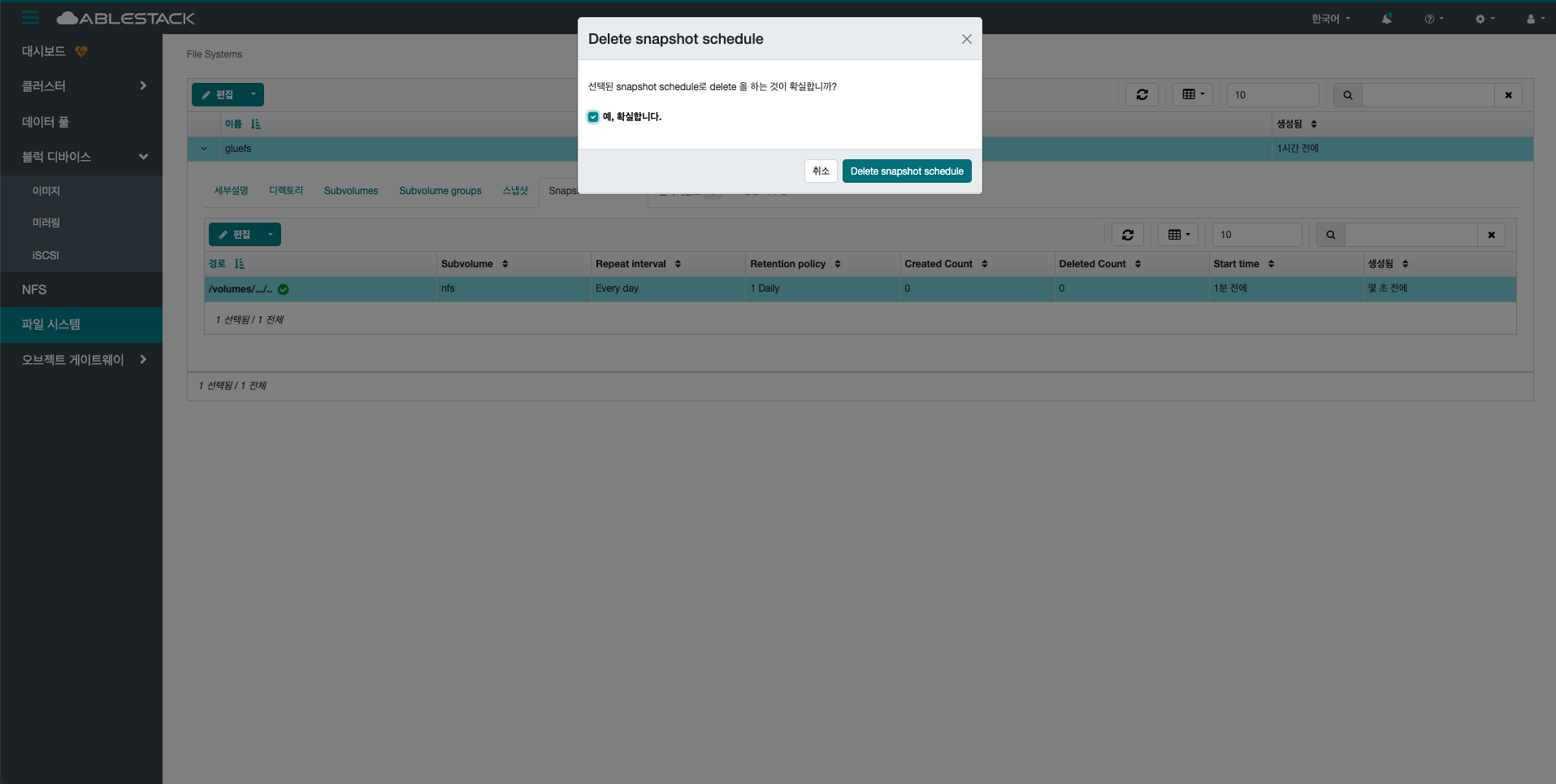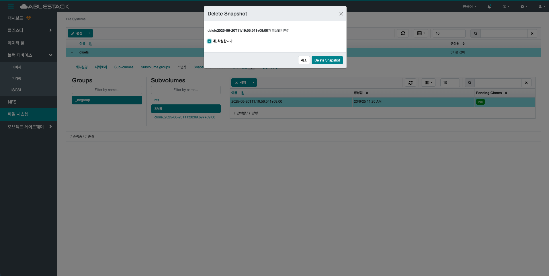 - 삭제 삭제 버튼을 클릭하여 Delete CephFs 스냅샷 팝업을 호출합니다.