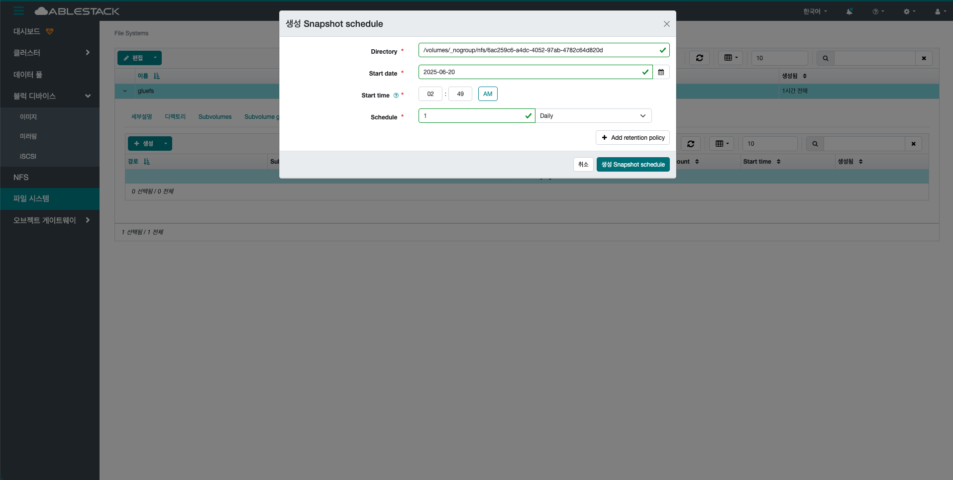 File System 디렉토리의 스냅샷 생성 항목을 입력합니다.