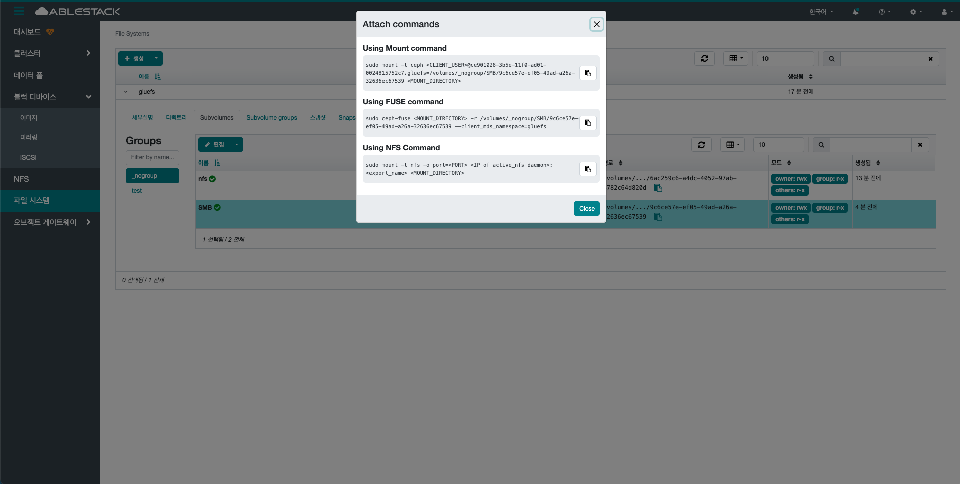 - 목록에서 마운트 방법을 확인할 File System을 선택합니다.