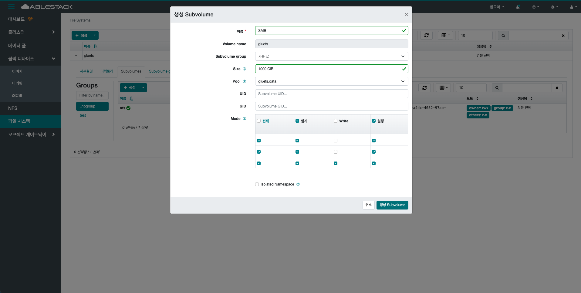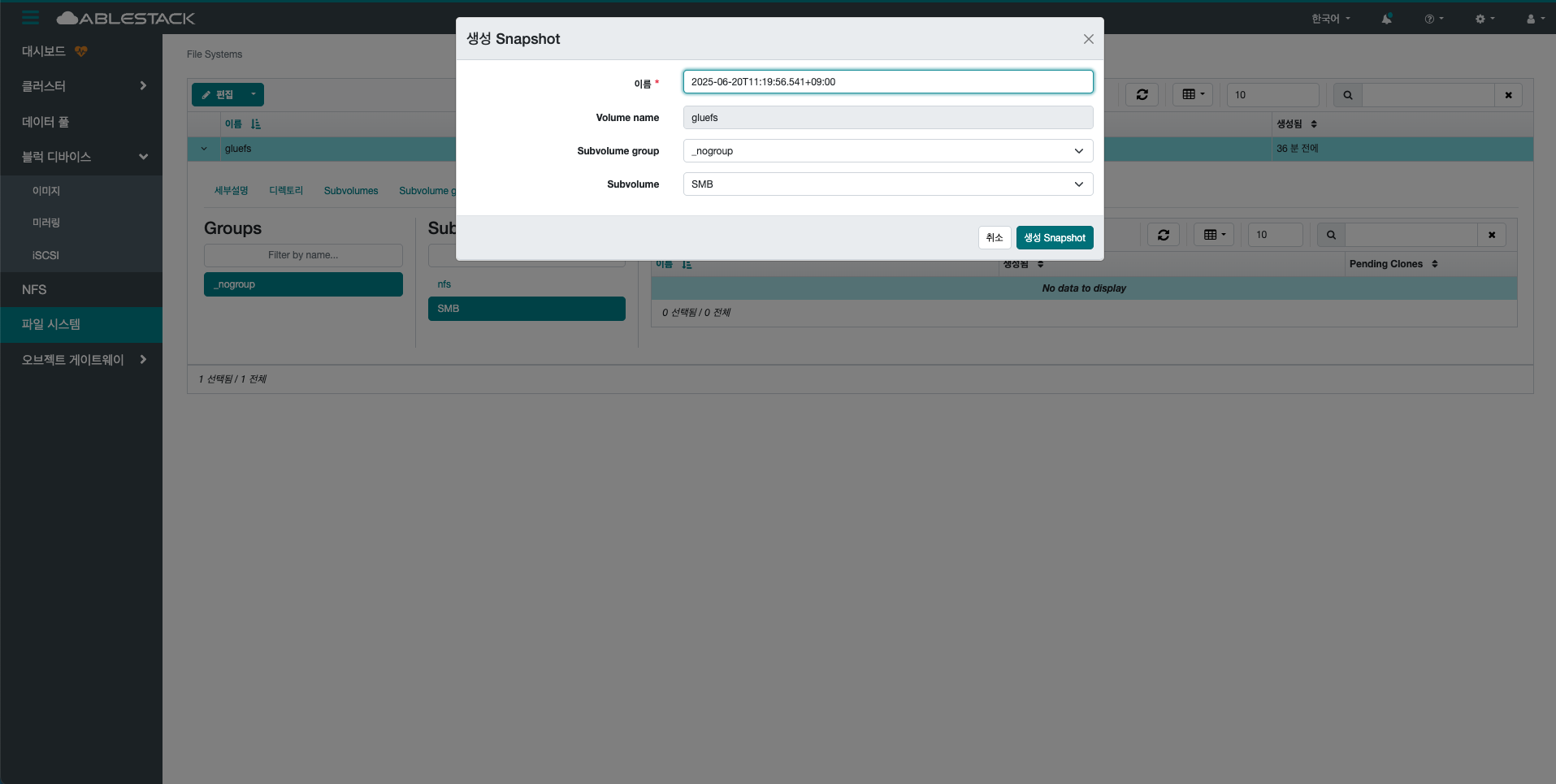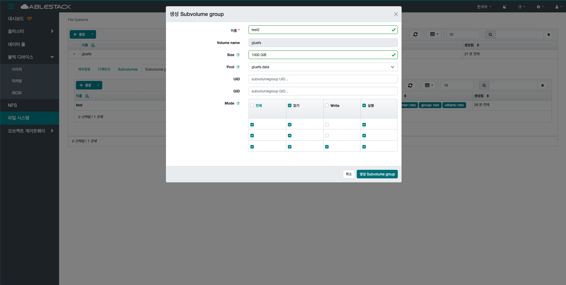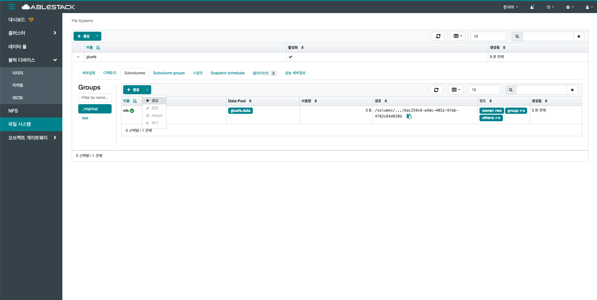 생성 버튼을 클릭 하여 생성 Subvolume group 화면을 호출합니다.