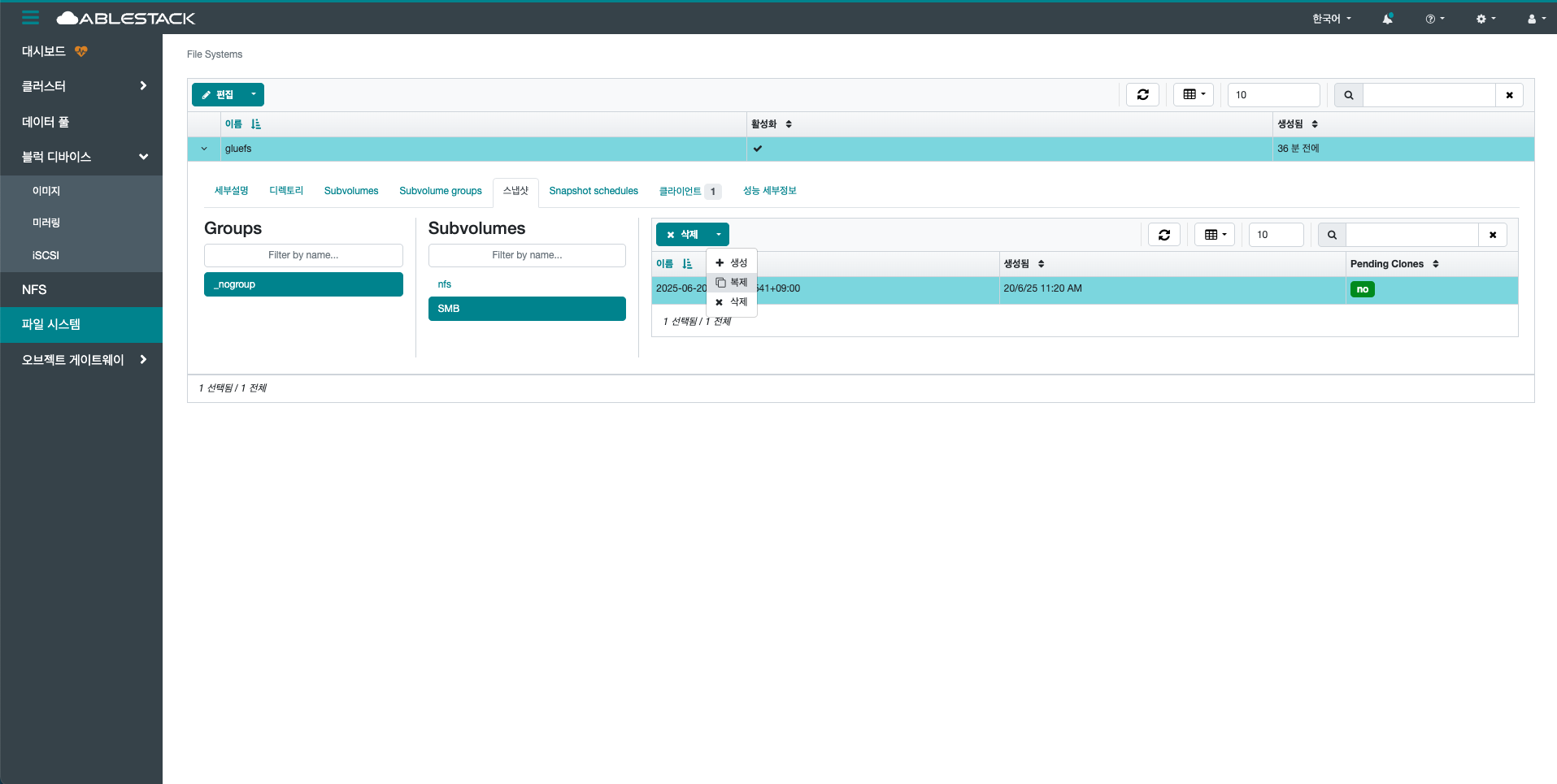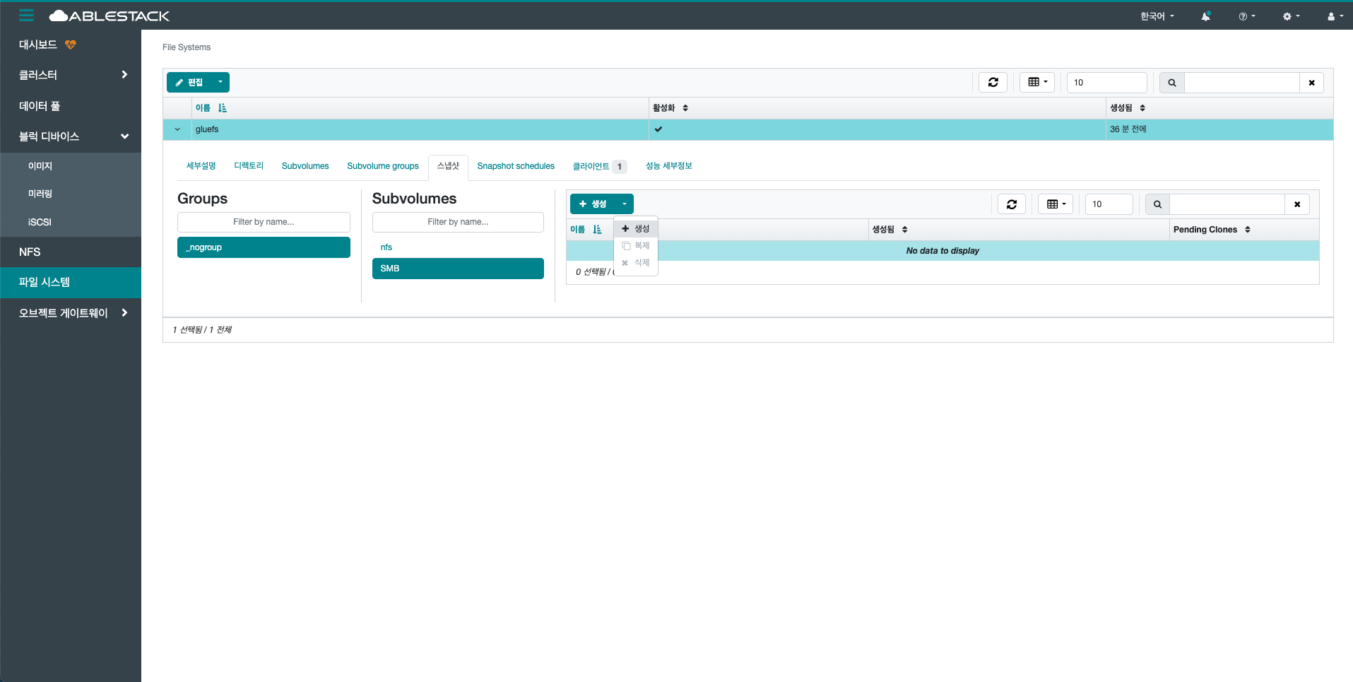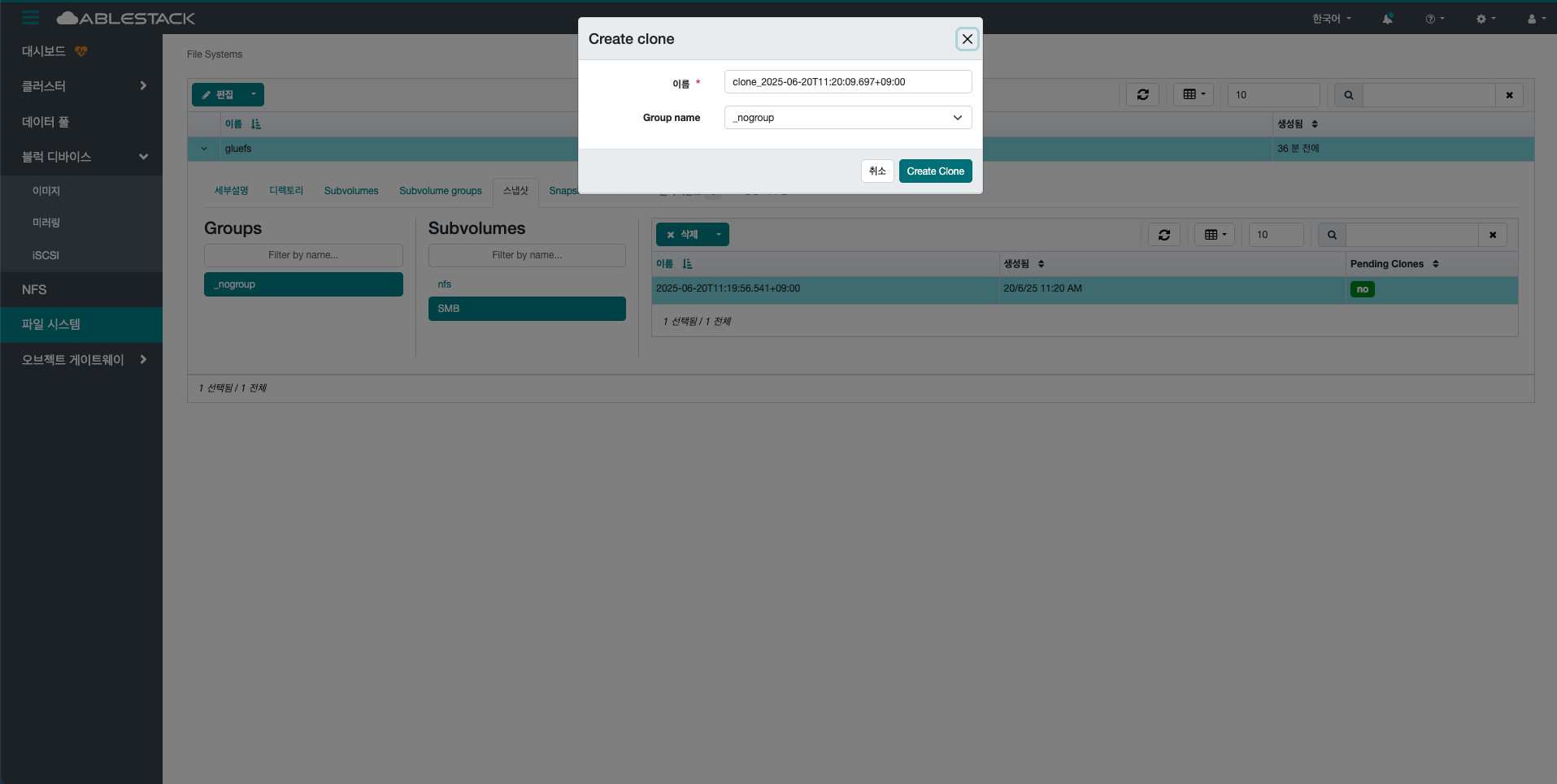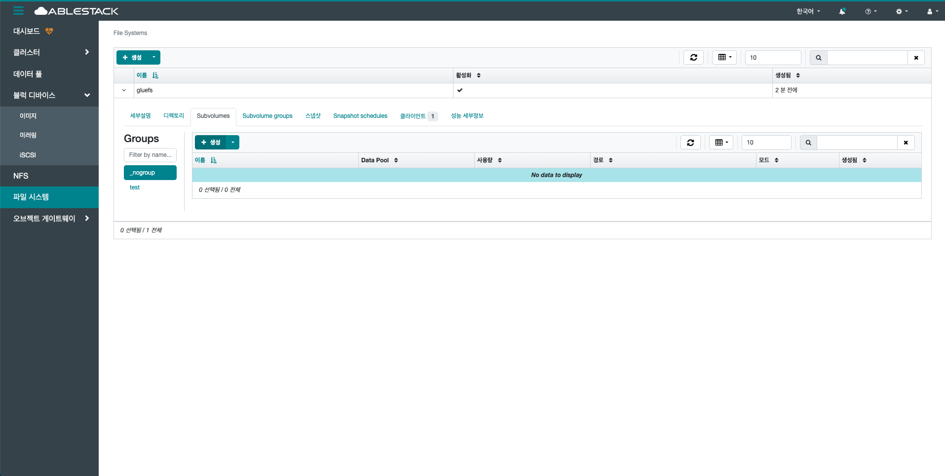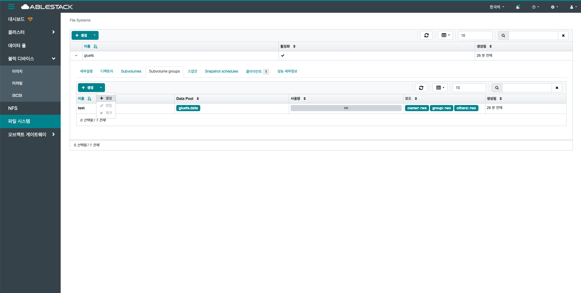 생성 버튼을 클릭 하여 생성 Subvolume group 화면을 호출합니다.