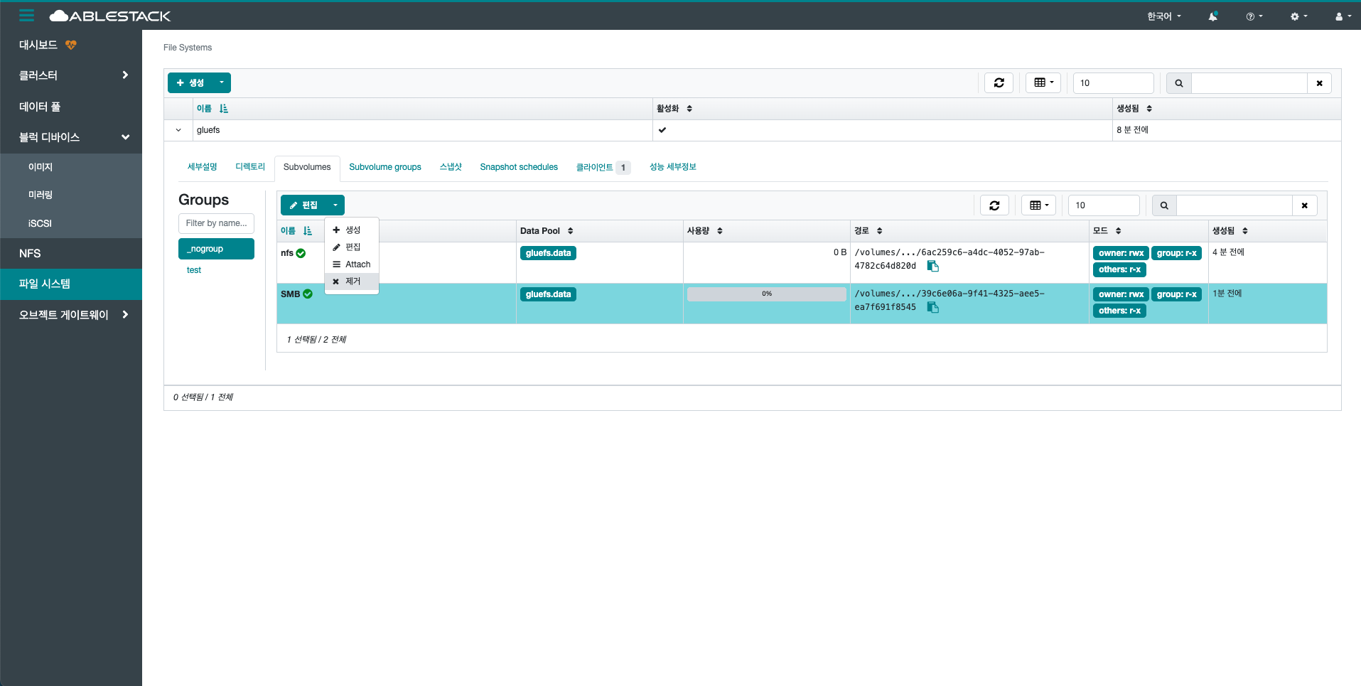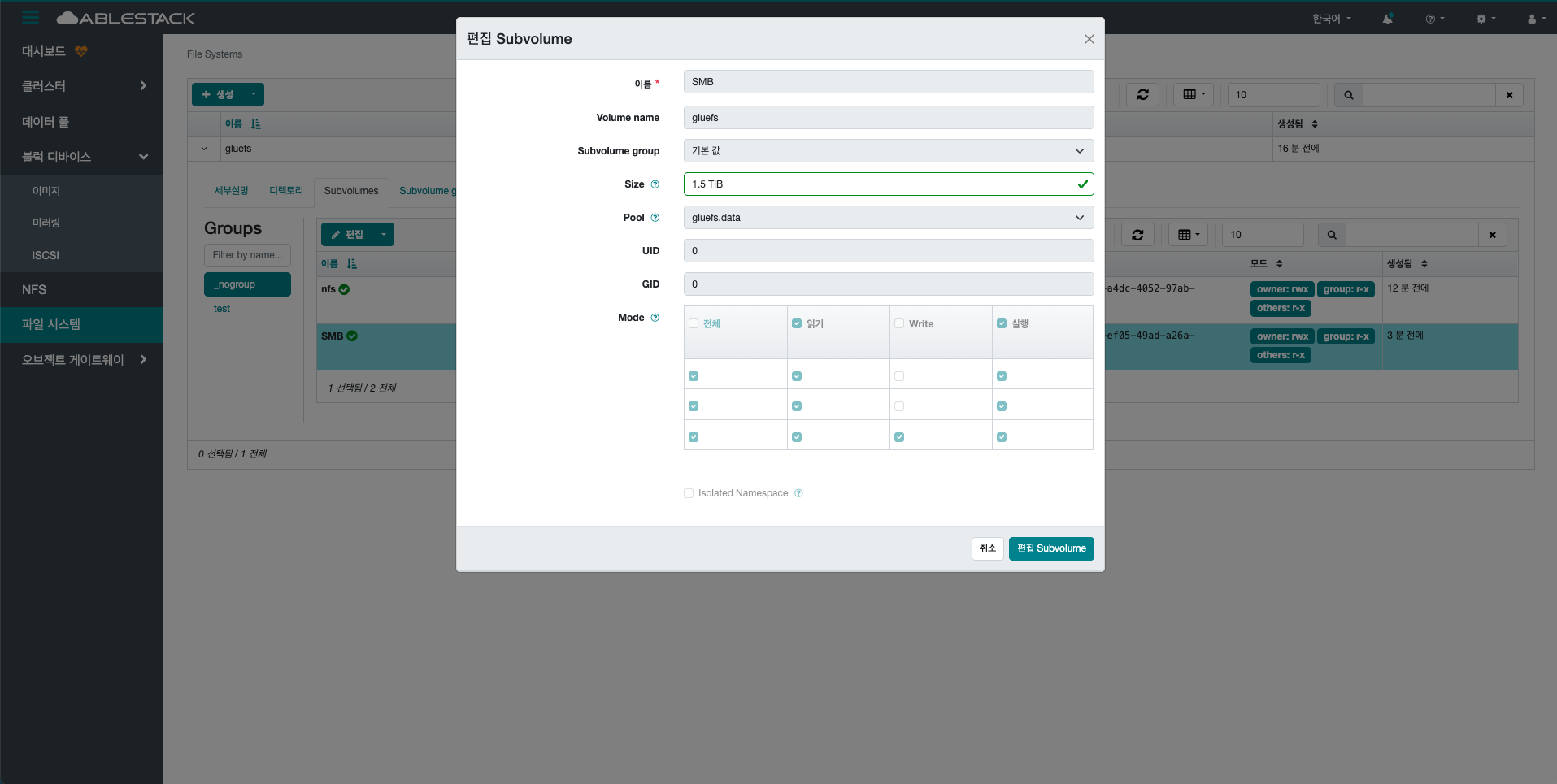 - 편집 Subvolume group 버튼을 클릭하여 Subvolume group을 편집합니다.