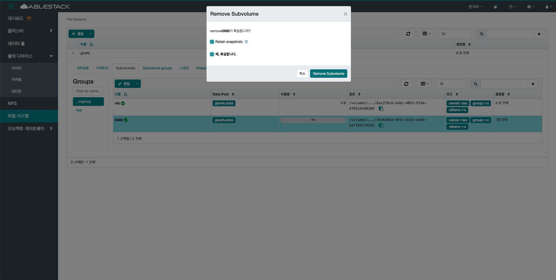 - 제거 버튼을 클릭하여 Remove Subvolume group 화면을 호출합니다.