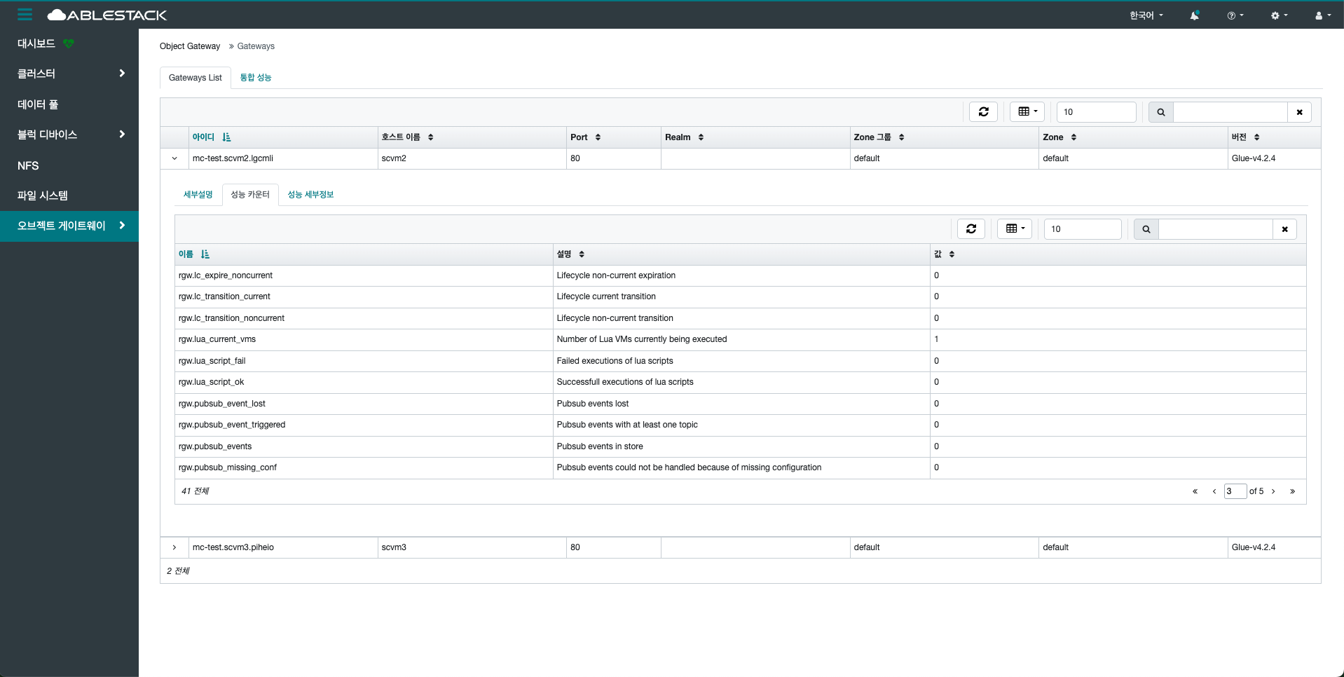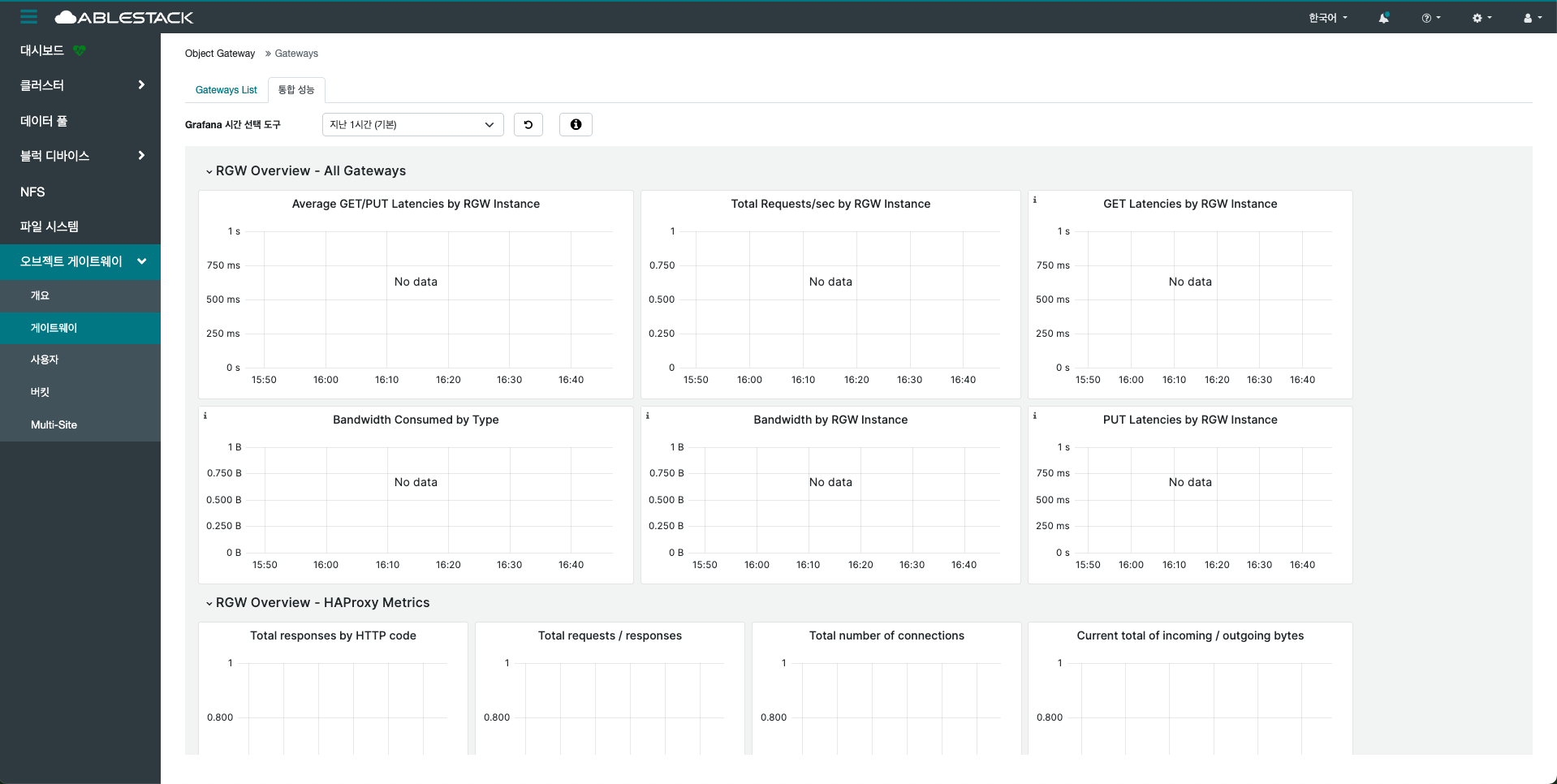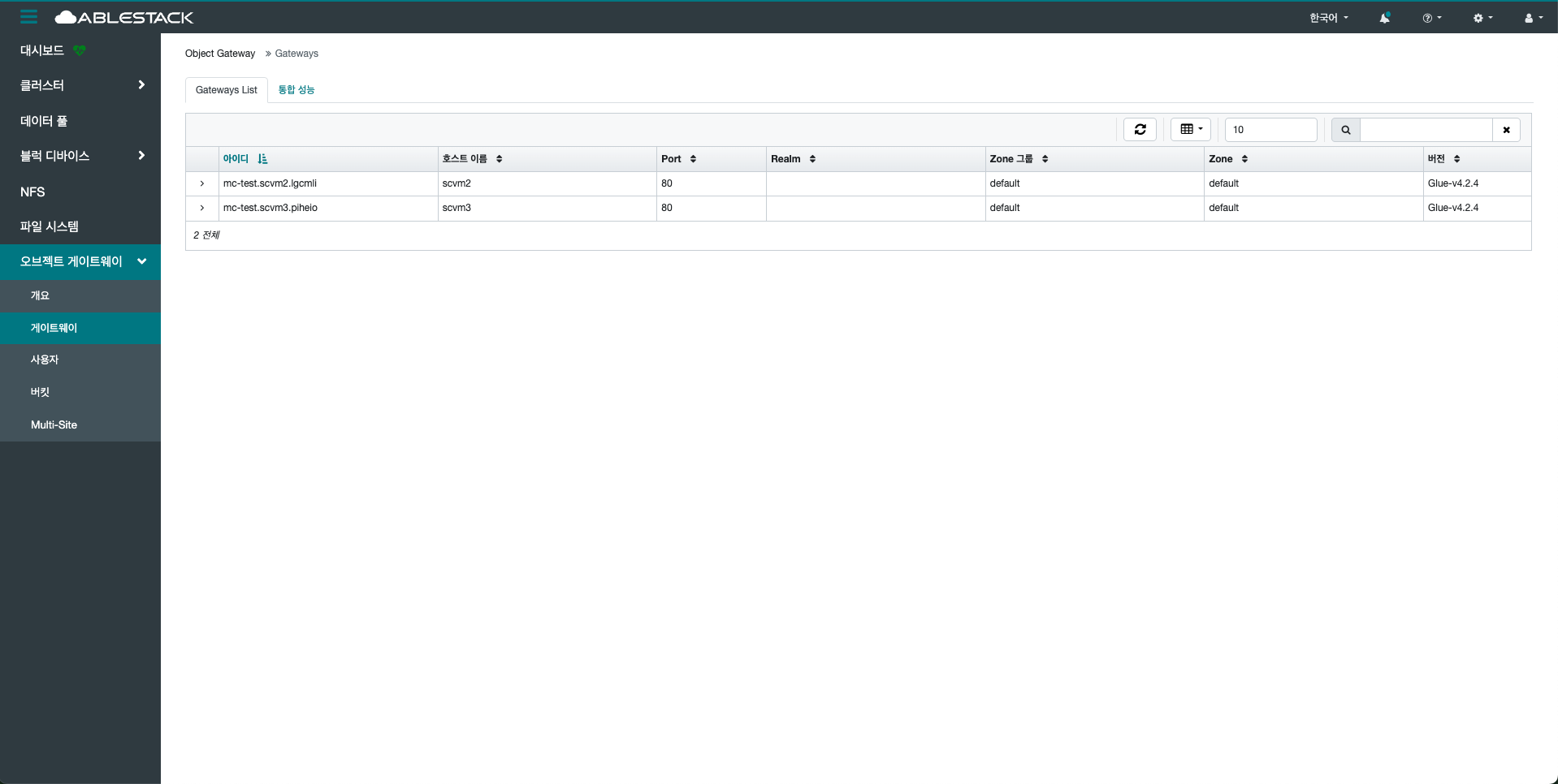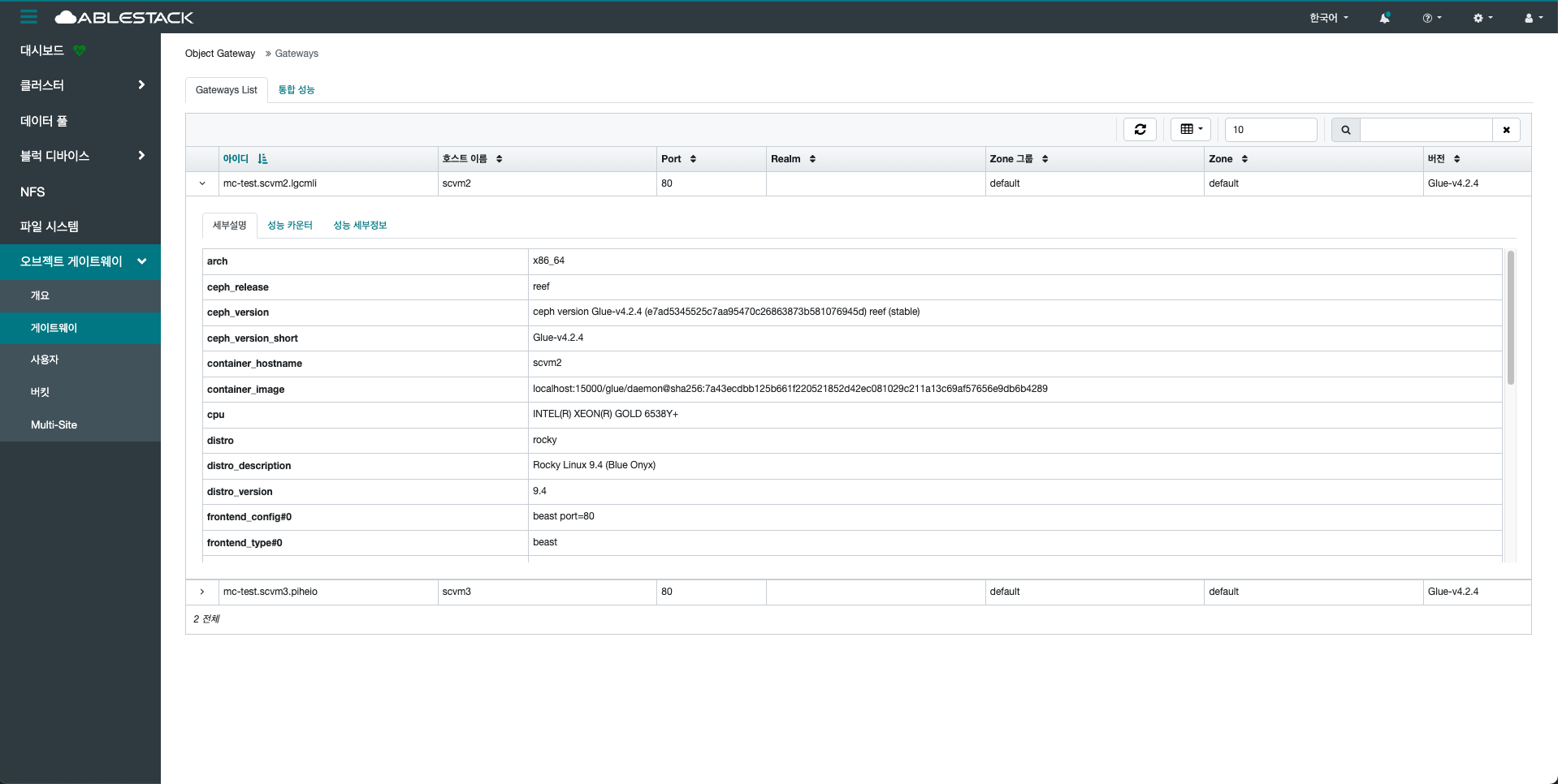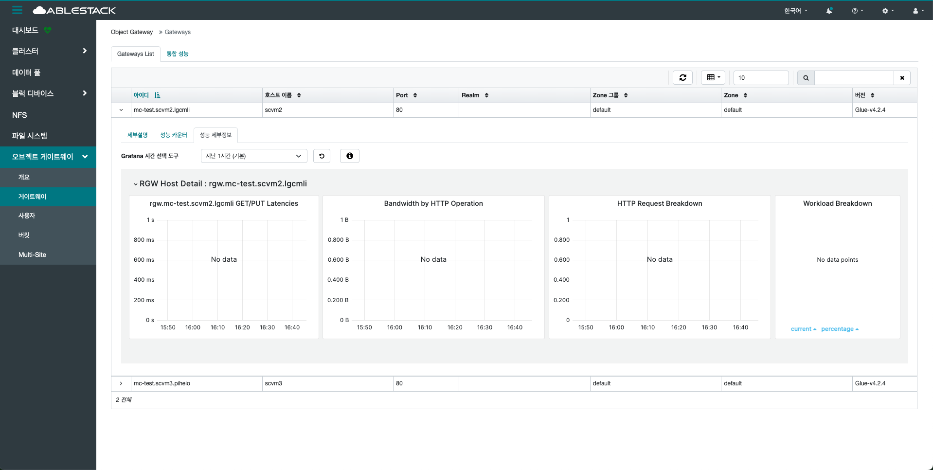 게이트웨이의 상태, 서비스 포트, 바인딩된 인터페이스 정보 등을 확인할 수 있으며, 오류 발생 시 상태 변경이나 재시작 등의 조치가 가능합니다. 또한 RGW 인스턴스 간의 부하 분산, 고가용성 설정 등도 이 메뉴를 통해 조율할 수 있습니다. 특히 멀티 사이트 동기화(Multi-Site Sync)를 사용하는 경우, 각 사이트별 게이트웨이 연동 상태 및 복제 현황도 확인할 수 있습니다.