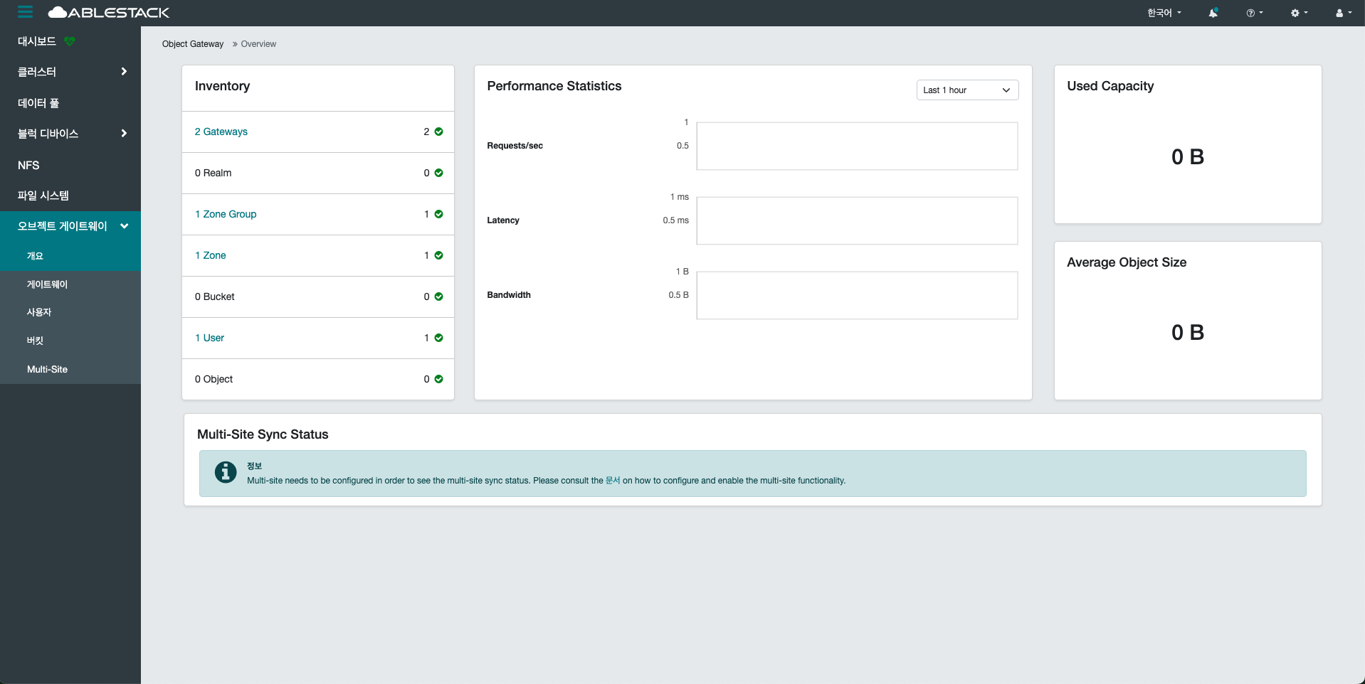 - 현재 구성된 Object Gateway와 사용자 계정, 버킷(Bucket) 등의 전체 개요 정보를 제공합니다.