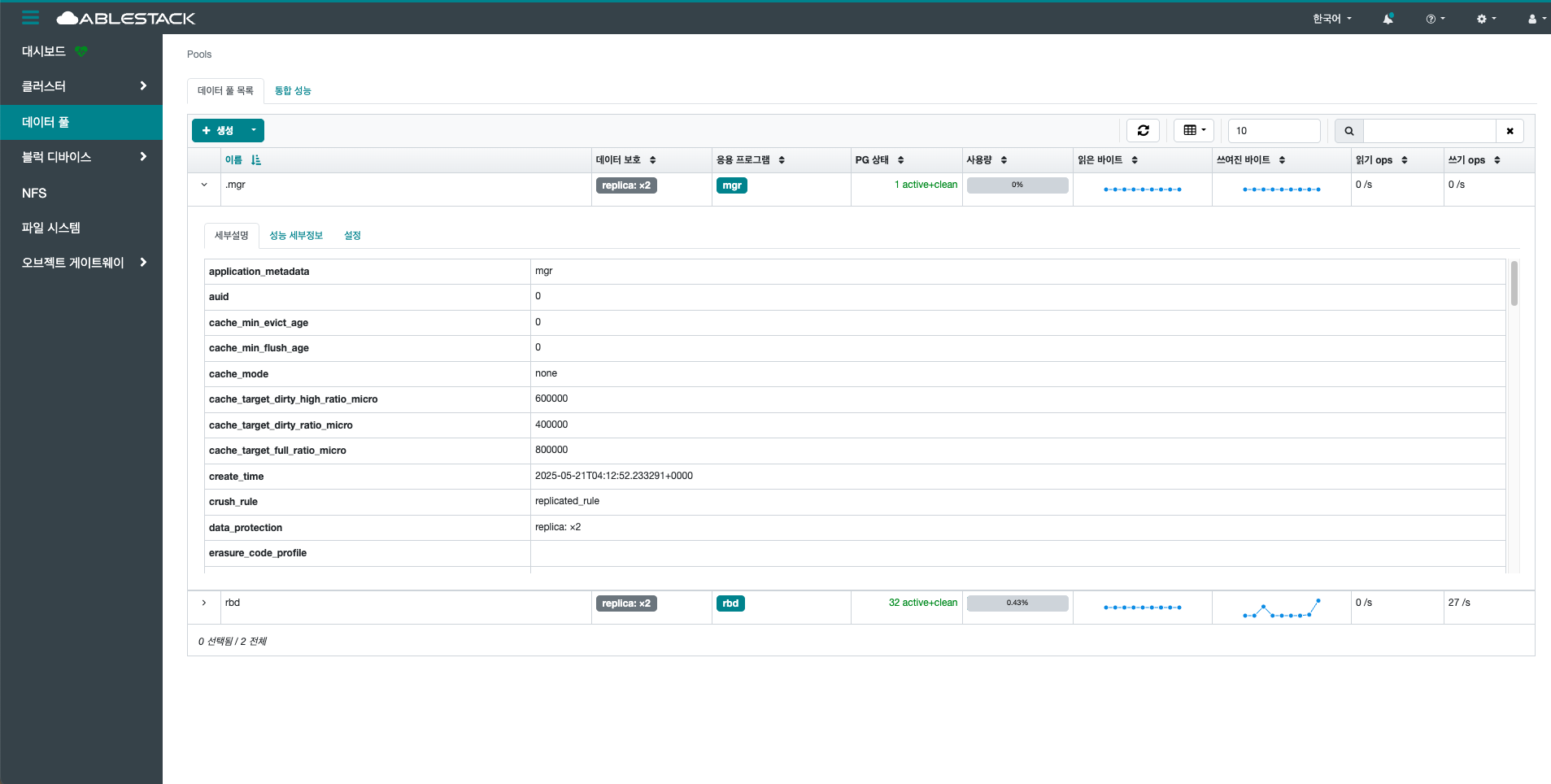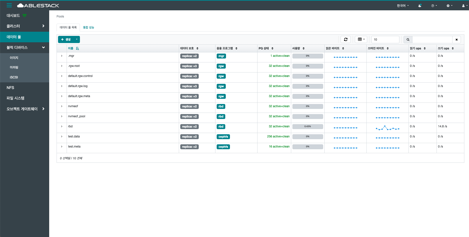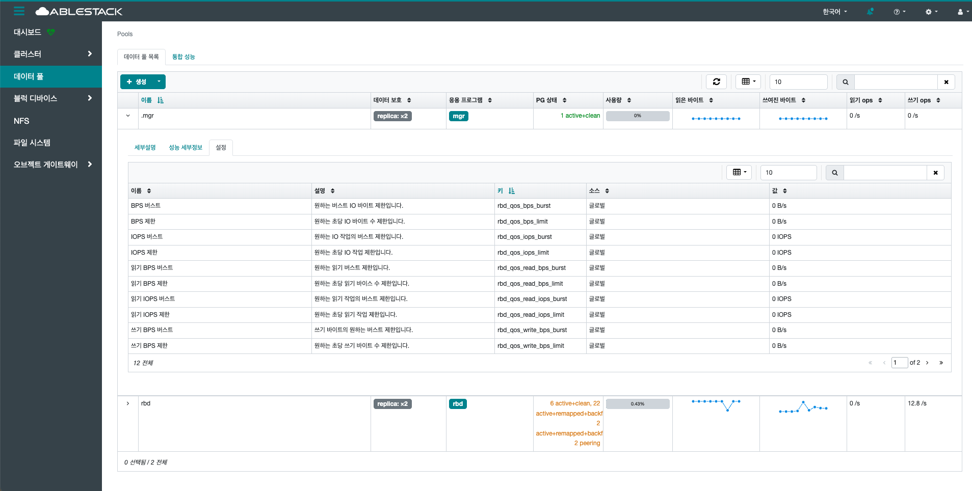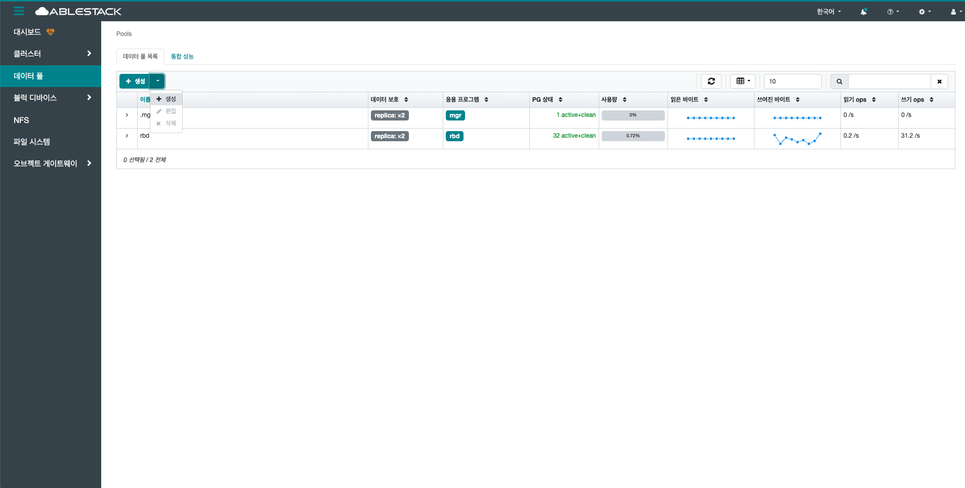 클러스터 내의 풀(Pool) 들에 대한 상태와 세부 정보를 시각적으로 확인하고 관리할 수 있는 기능입니다. Glue의 Pool은 데이터를 저장하기 위한 논리적 공간이며, 각 Pool은 특정한 CRUSH 규칙, 복제 방식, PG 개수 등을 관리할 수 있습니다.