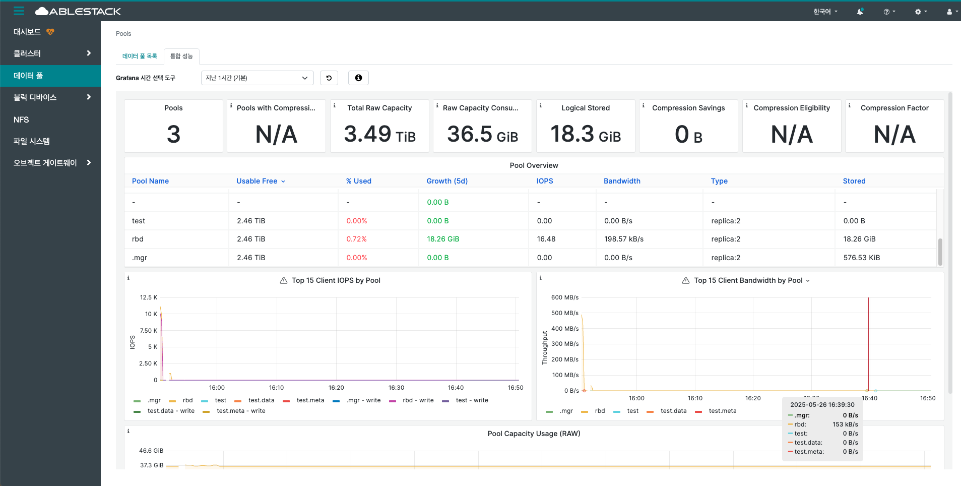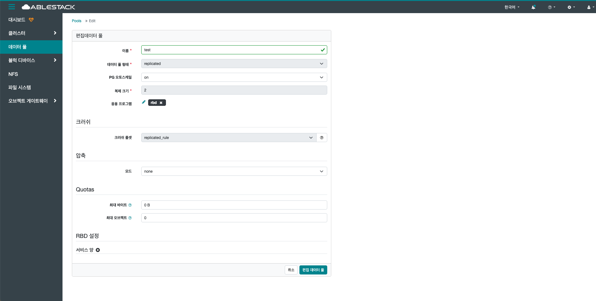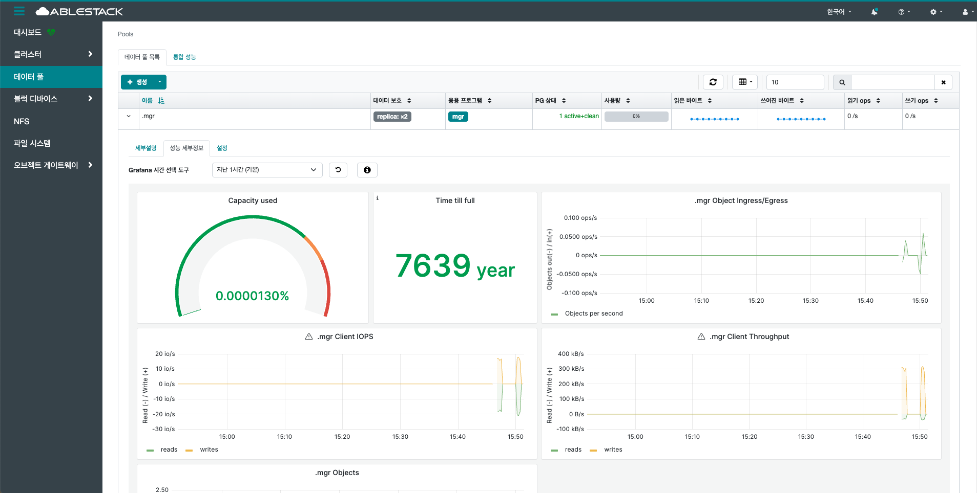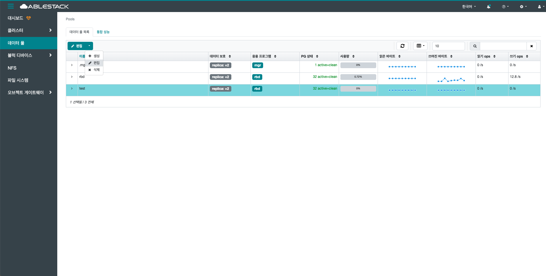 클러스터 내의 풀(Pool) 들에 대한 상태와 세부 정보를 시각적으로 확인하고 관리할 수 있는 기능입니다. Glue의 Pool은 데이터를 저장하기 위한 논리적 공간이며, 각 Pool은 특정한 CRUSH 규칙, 복제 방식, PG 개수 등을 관리할 수 있습니다.