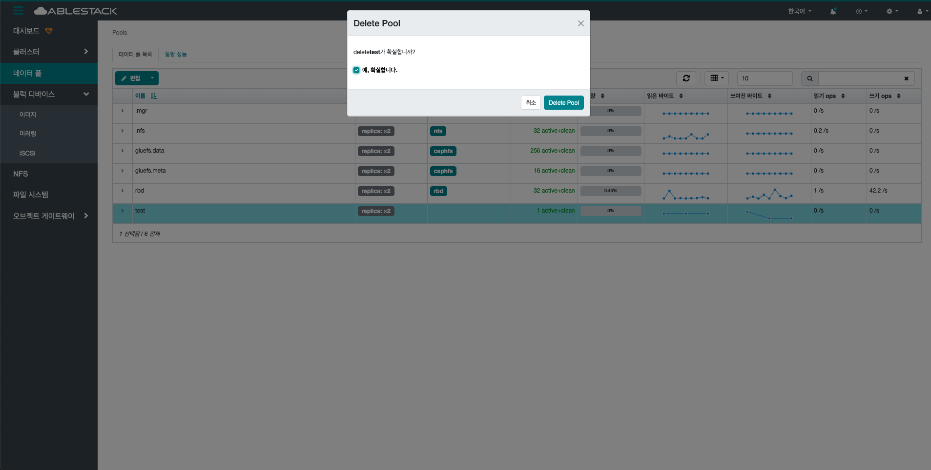 - 삭제 버튼을 클릭하여 Delete Pool 화면을 호출합니다.