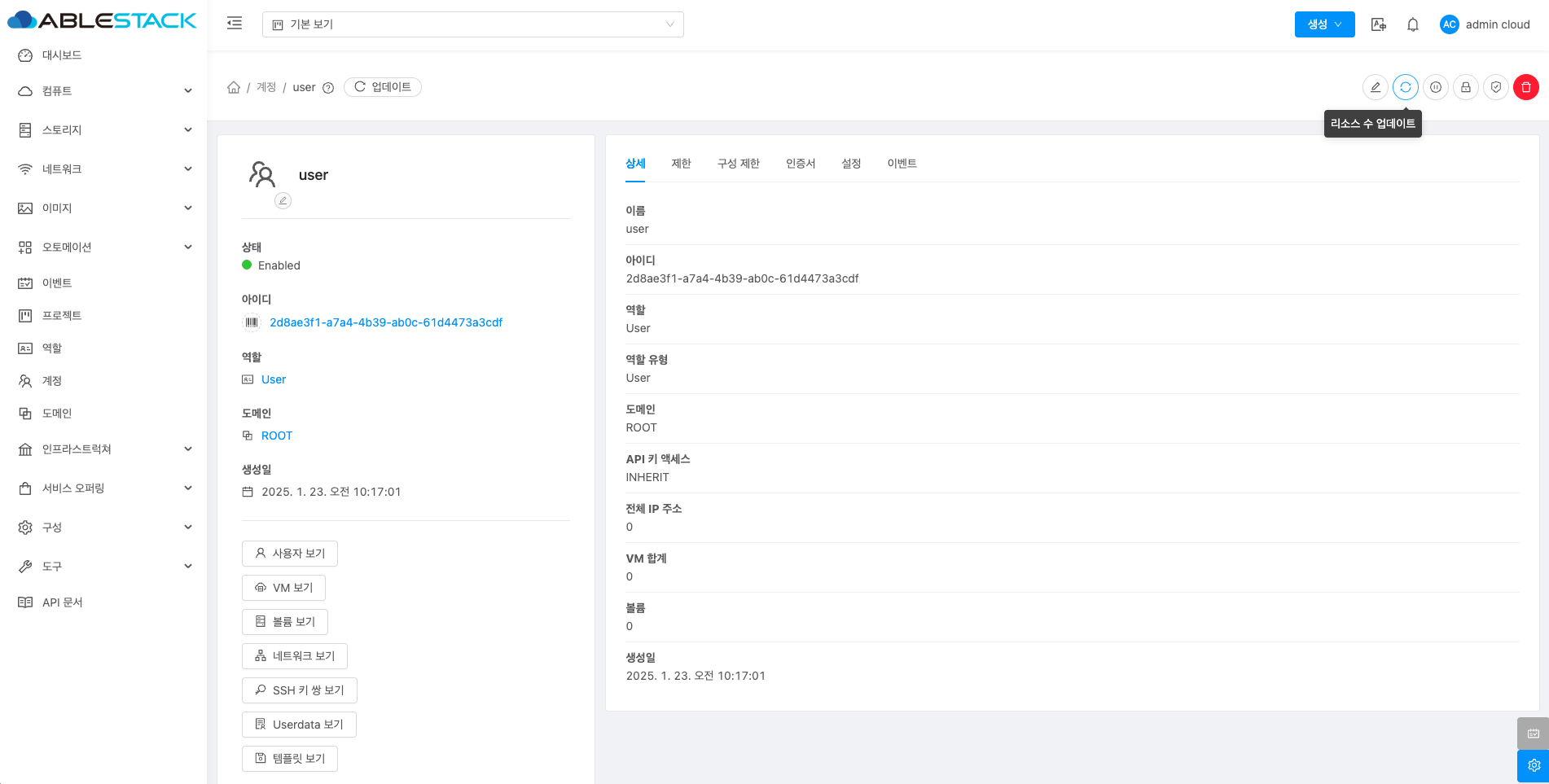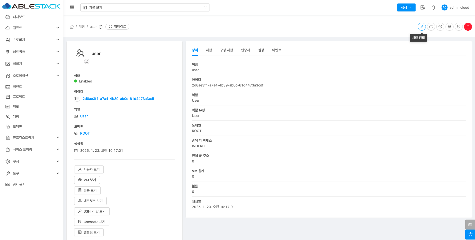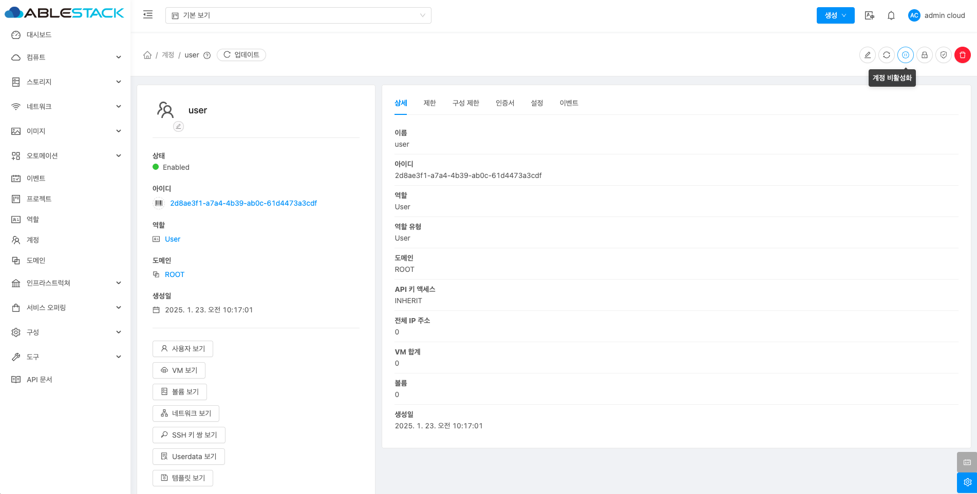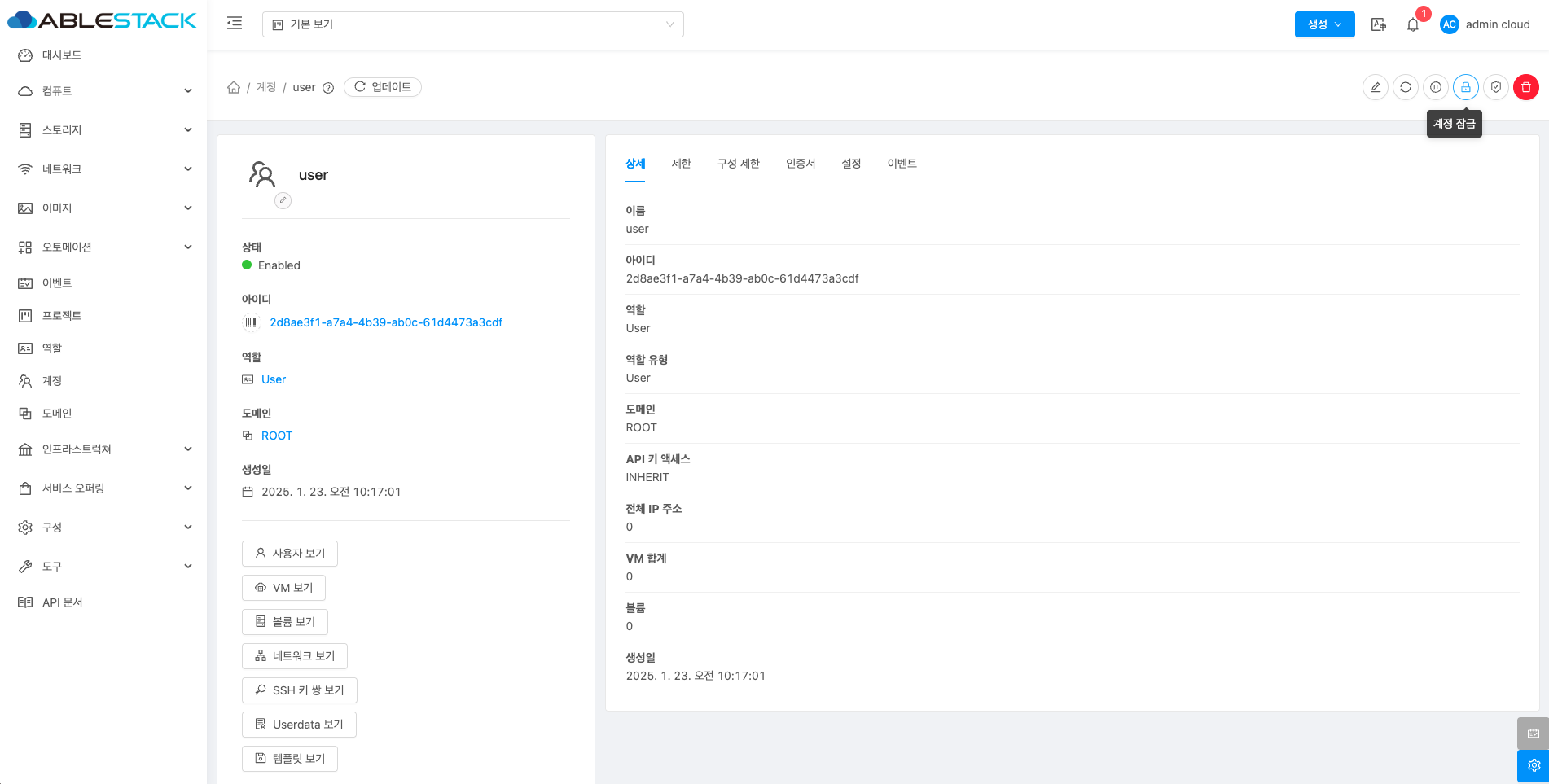 계정에 대한 상세정보를 조회하는 화면입니다. 해당 계정의 이름, 아이디, 역할, 역할 유형, 도메인, API 키 액세스, 전체 IP 주소, VM 합계, 볼륨, 생성일 등의 정보를 확인할 수 있습니다.