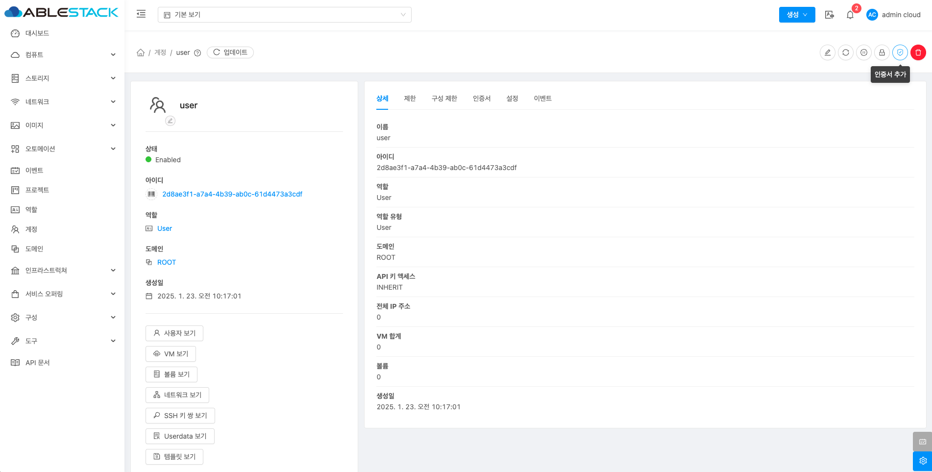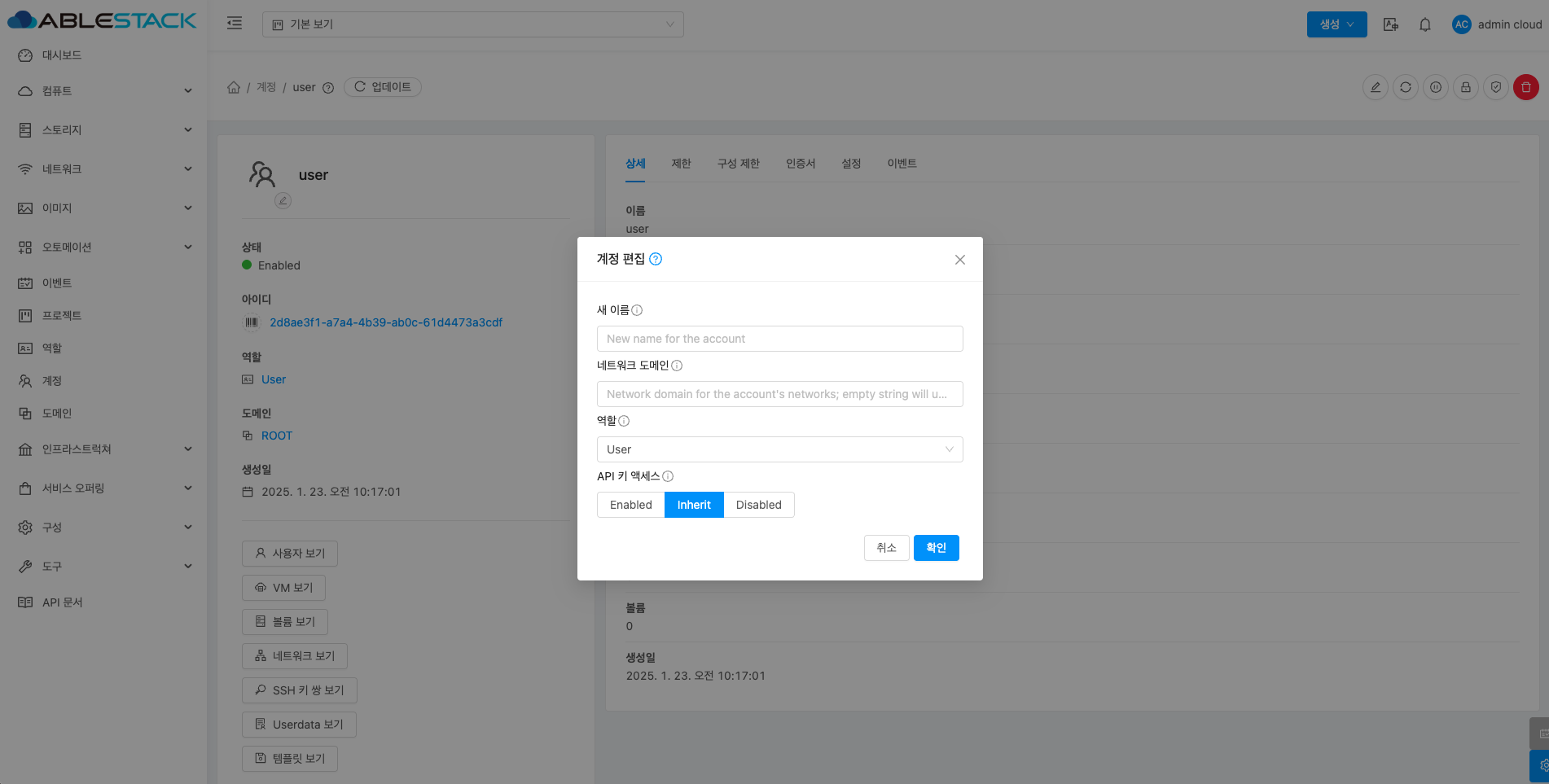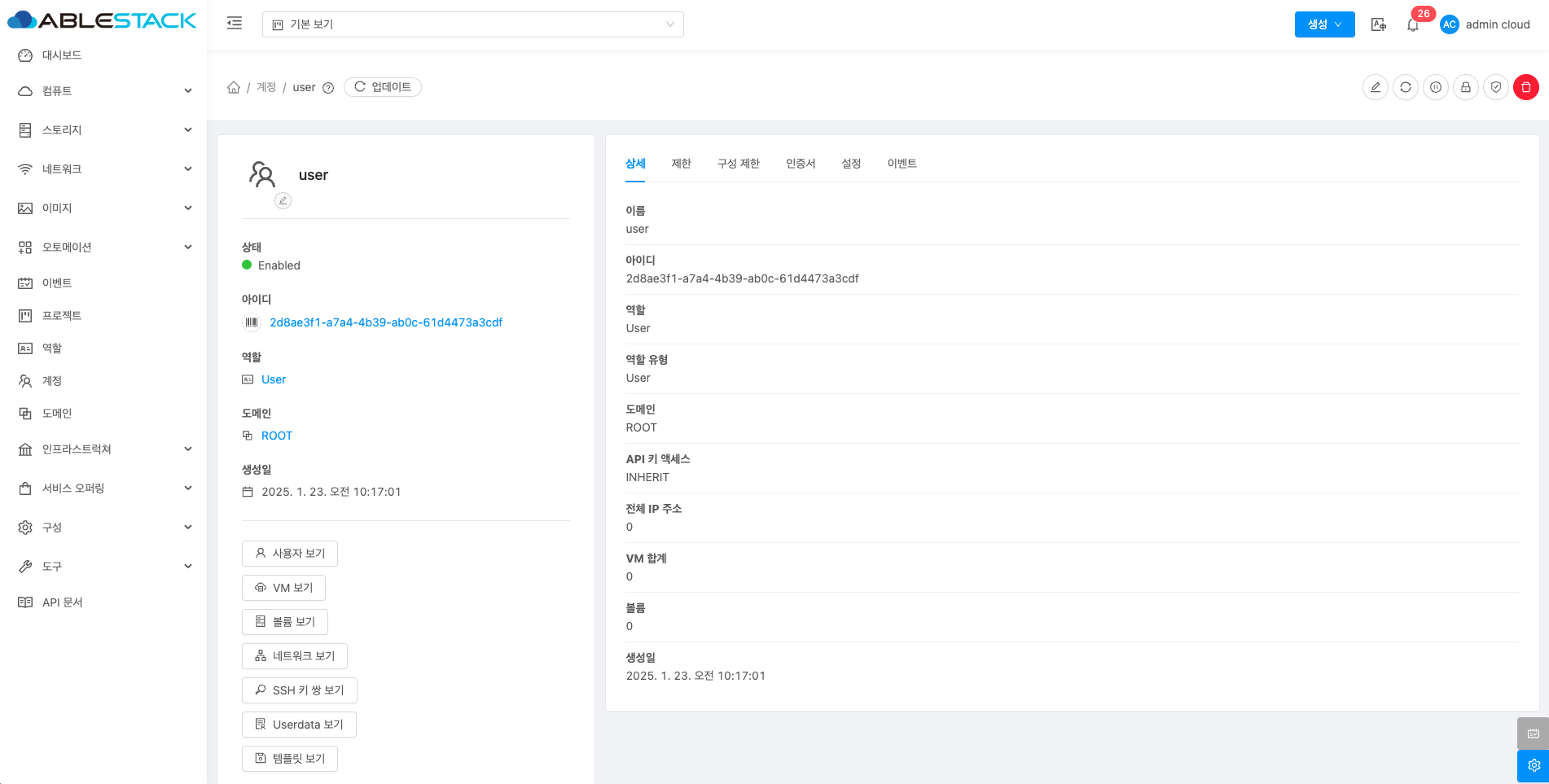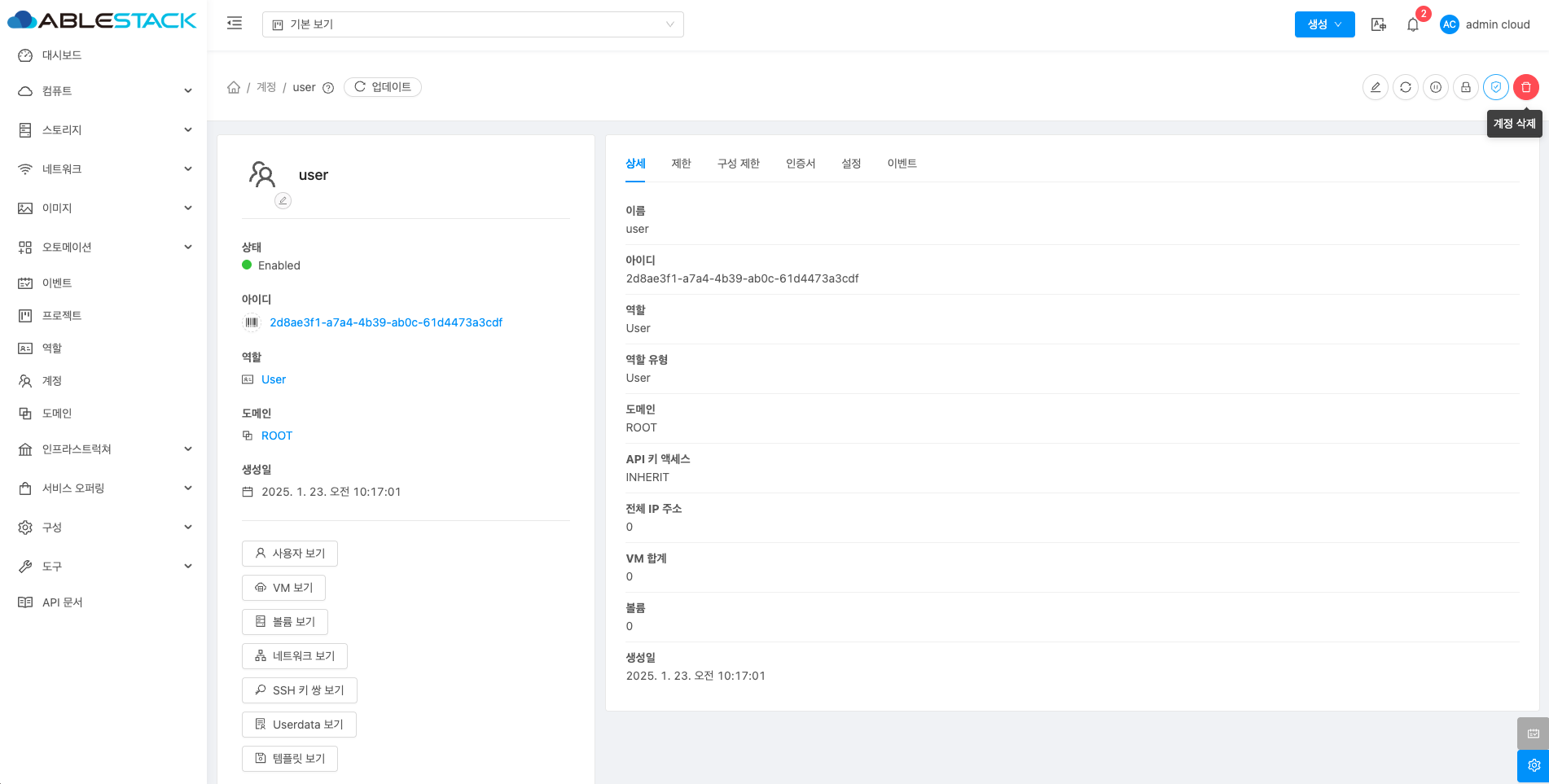 계정에 대한 상세정보를 조회하는 화면입니다. 해당 계정의 이름, 아이디, 역할, 역할 유형, 도메인, API 키 액세스, 전체 IP 주소, VM 합계, 볼륨, 생성일 등의 정보를 확인할 수 있습니다.