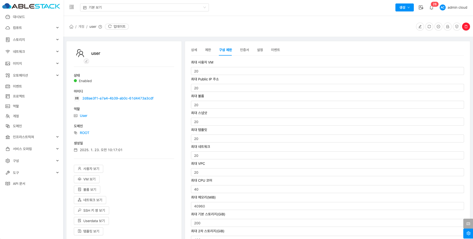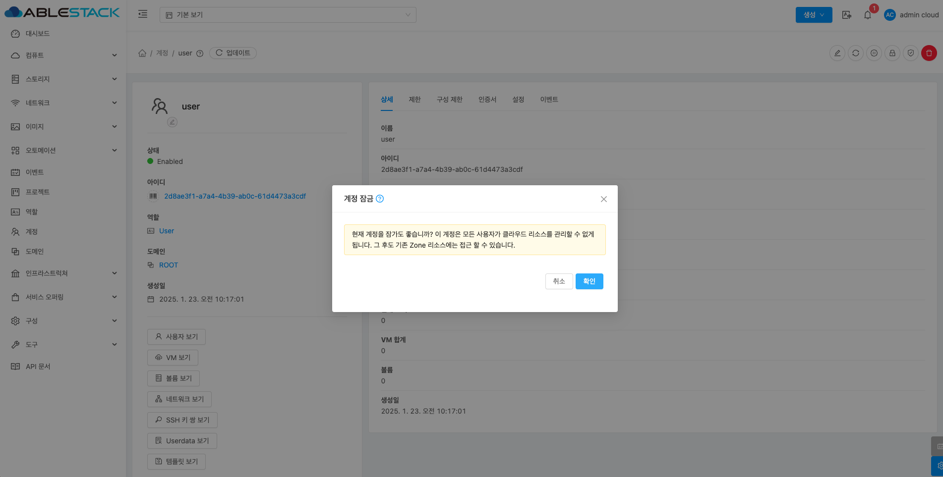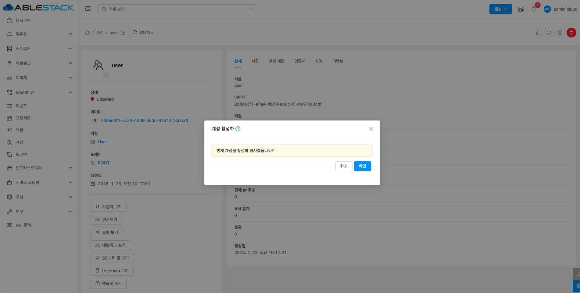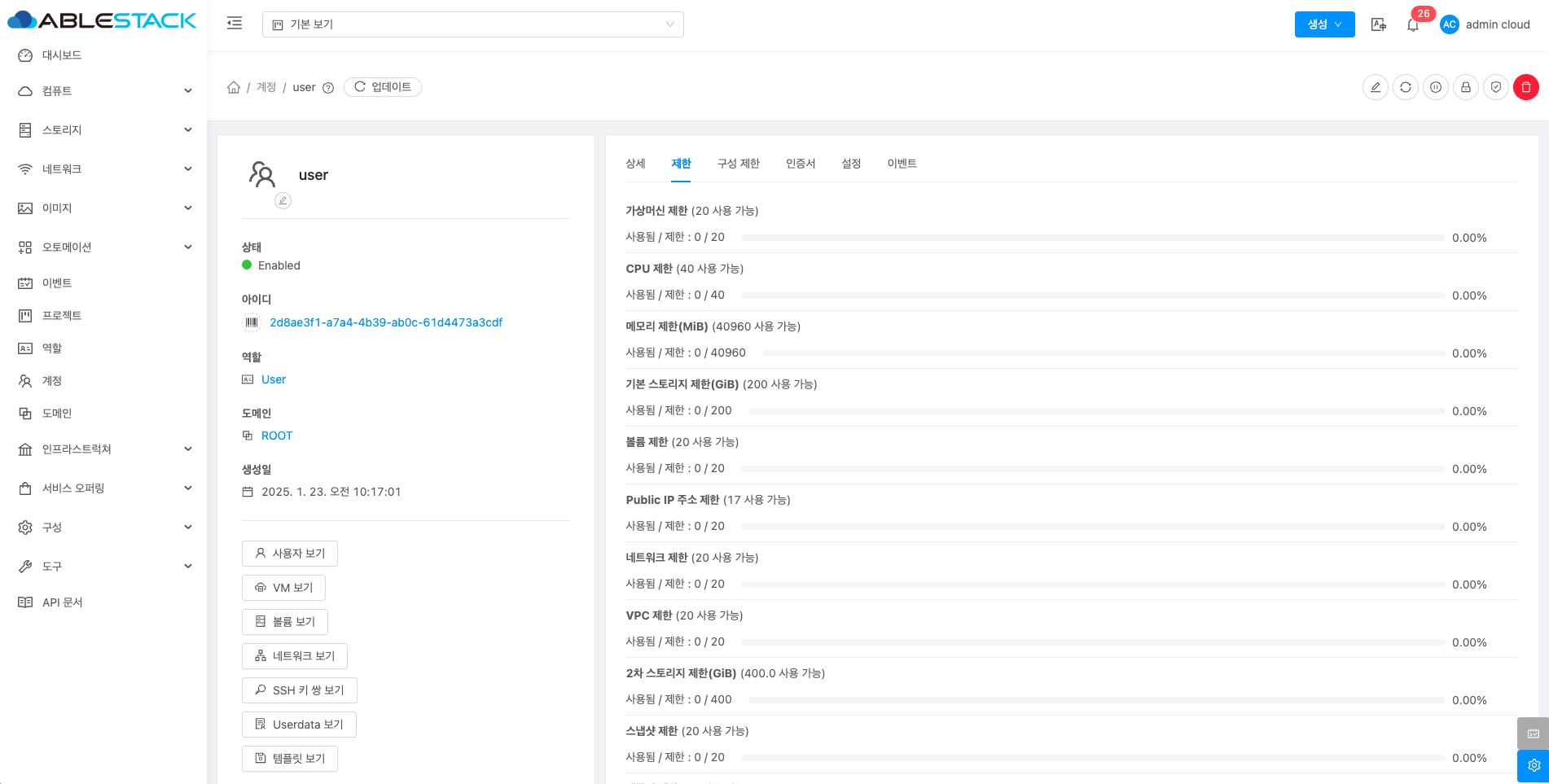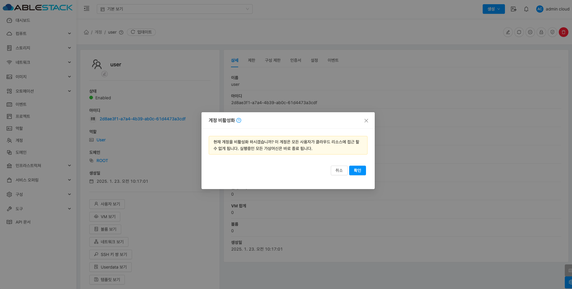 계정에 대한 상세정보를 조회하는 화면입니다. 해당 계정의 이름, 아이디, 역할, 역할 유형, 도메인, API 키 액세스, 전체 IP 주소, VM 합계, 볼륨, 생성일 등의 정보를 확인할 수 있습니다.