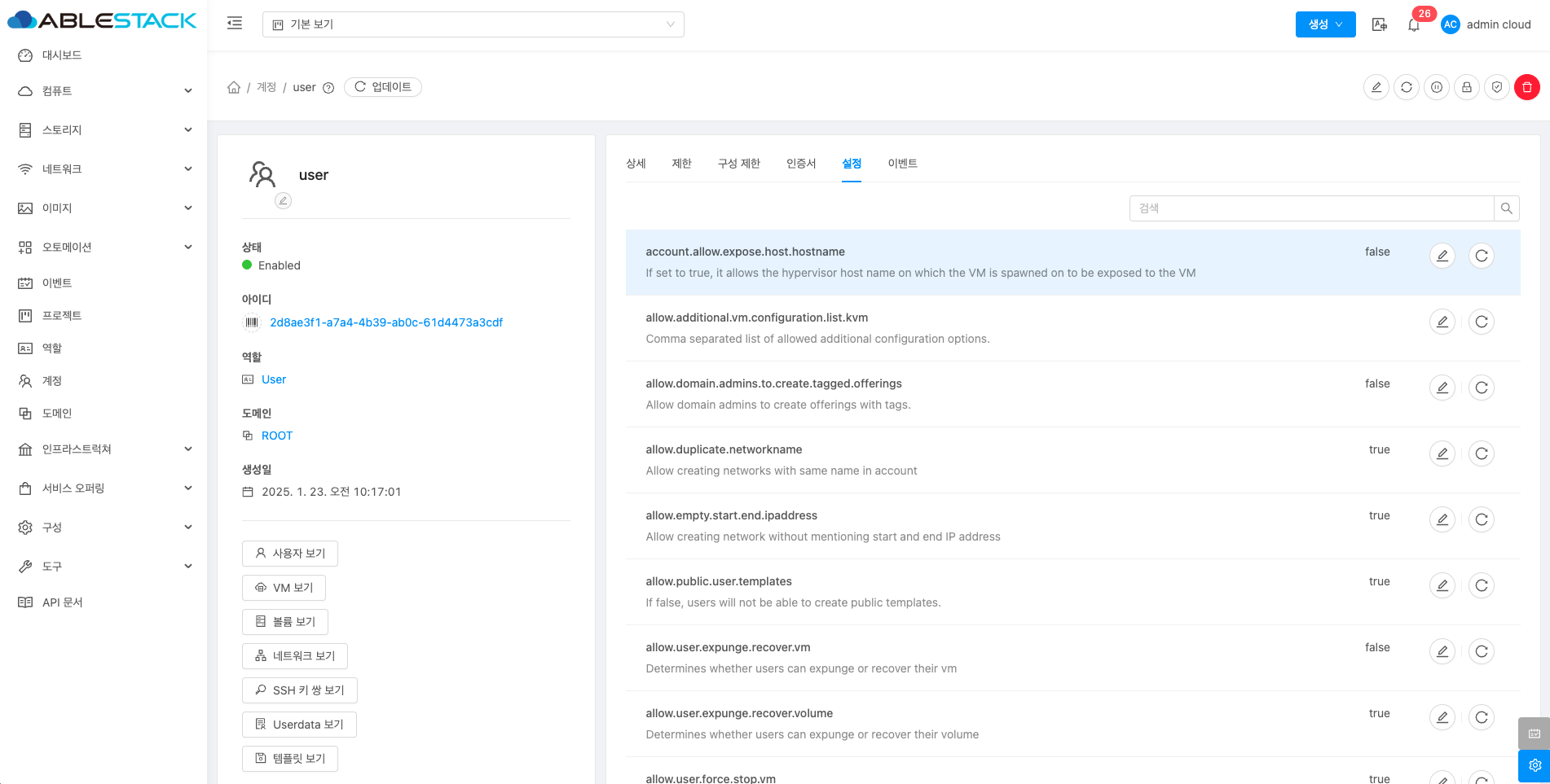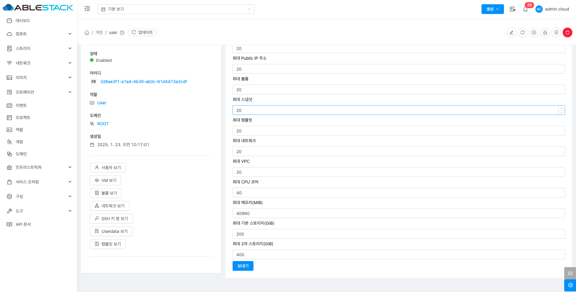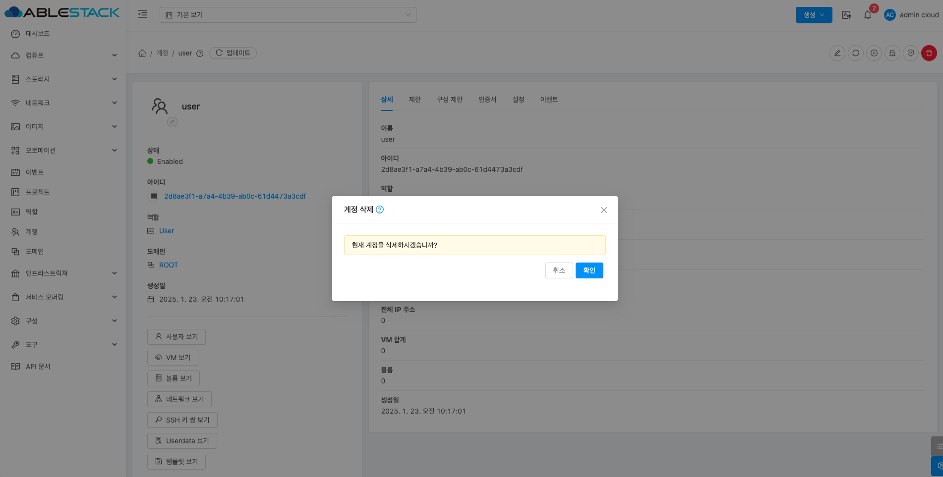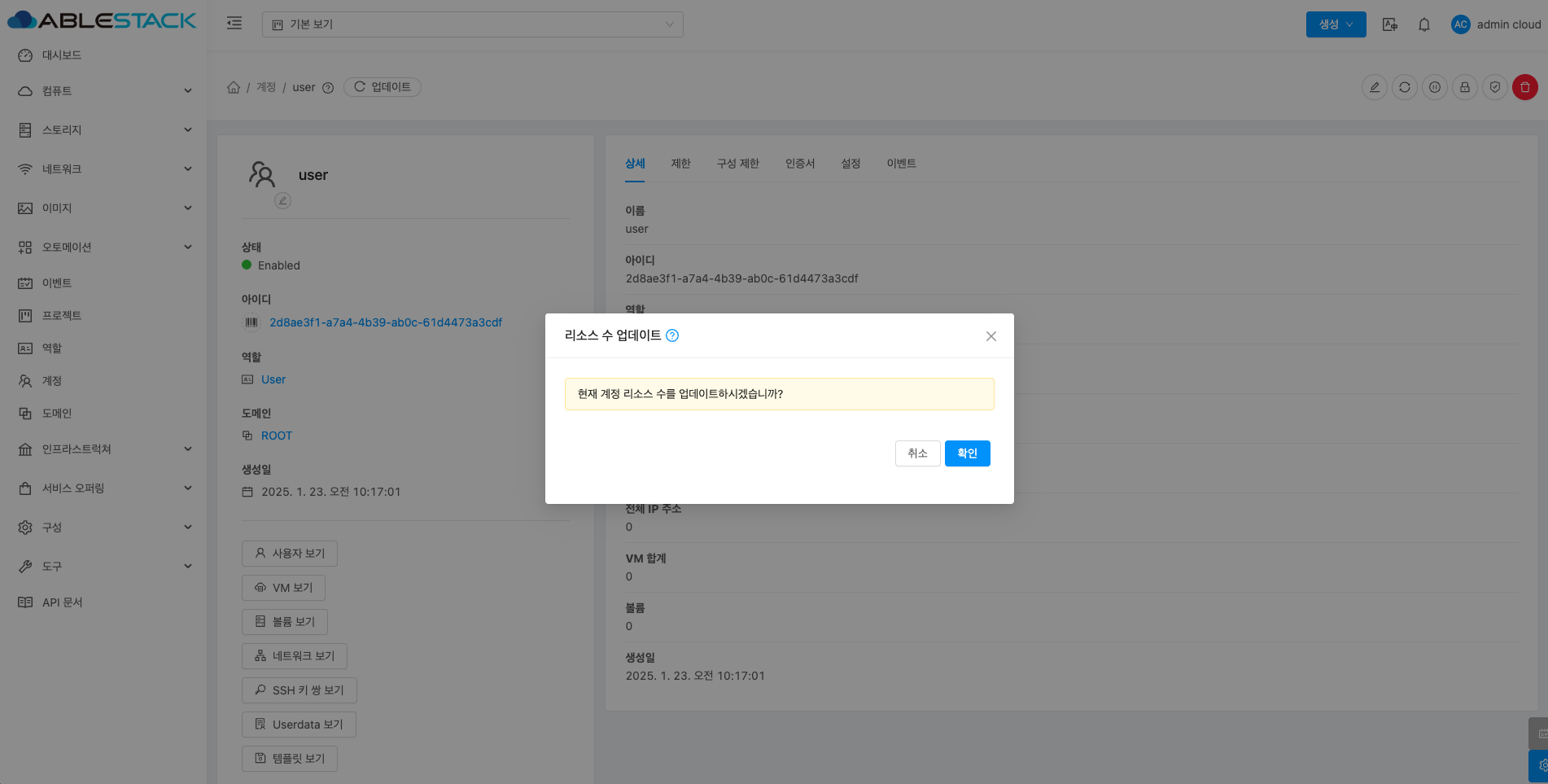 계정에 대한 상세정보를 조회하는 화면입니다. 해당 계정의 이름, 아이디, 역할, 역할 유형, 도메인, API 키 액세스, 전체 IP 주소, VM 합계, 볼륨, 생성일 등의 정보를 확인할 수 있습니다.