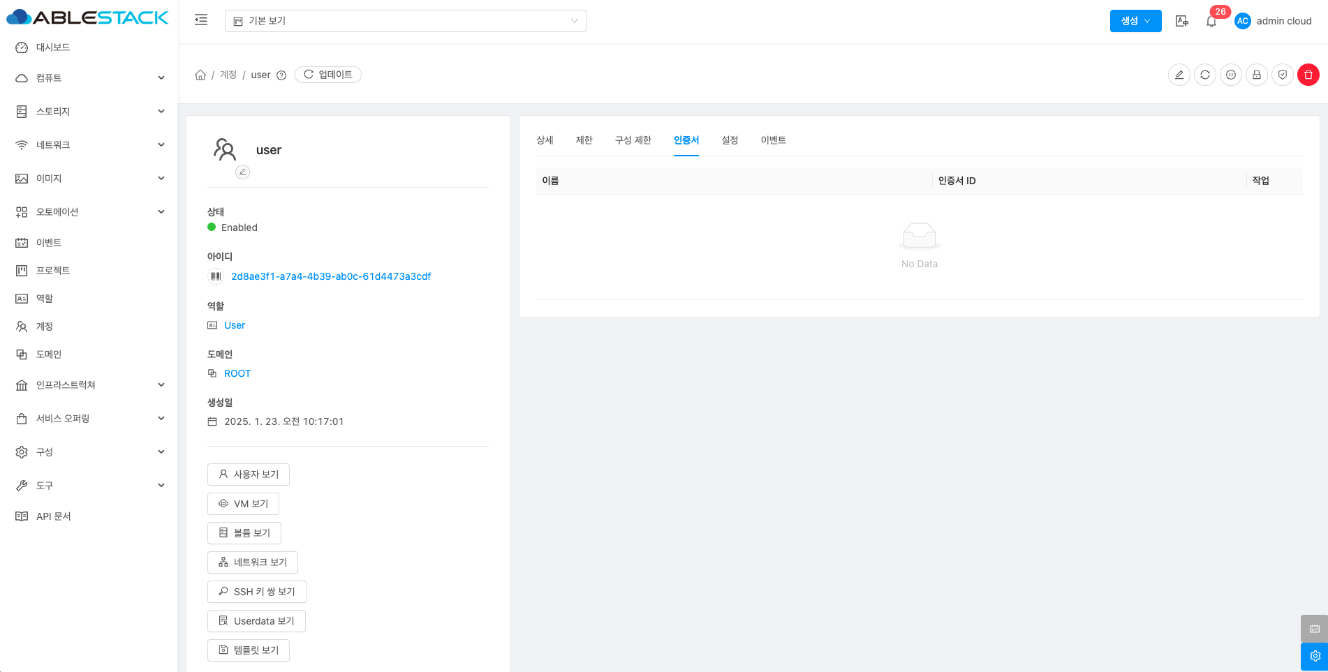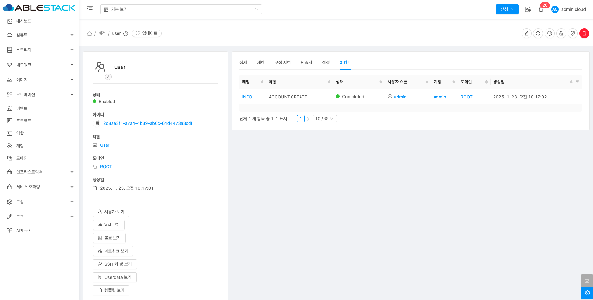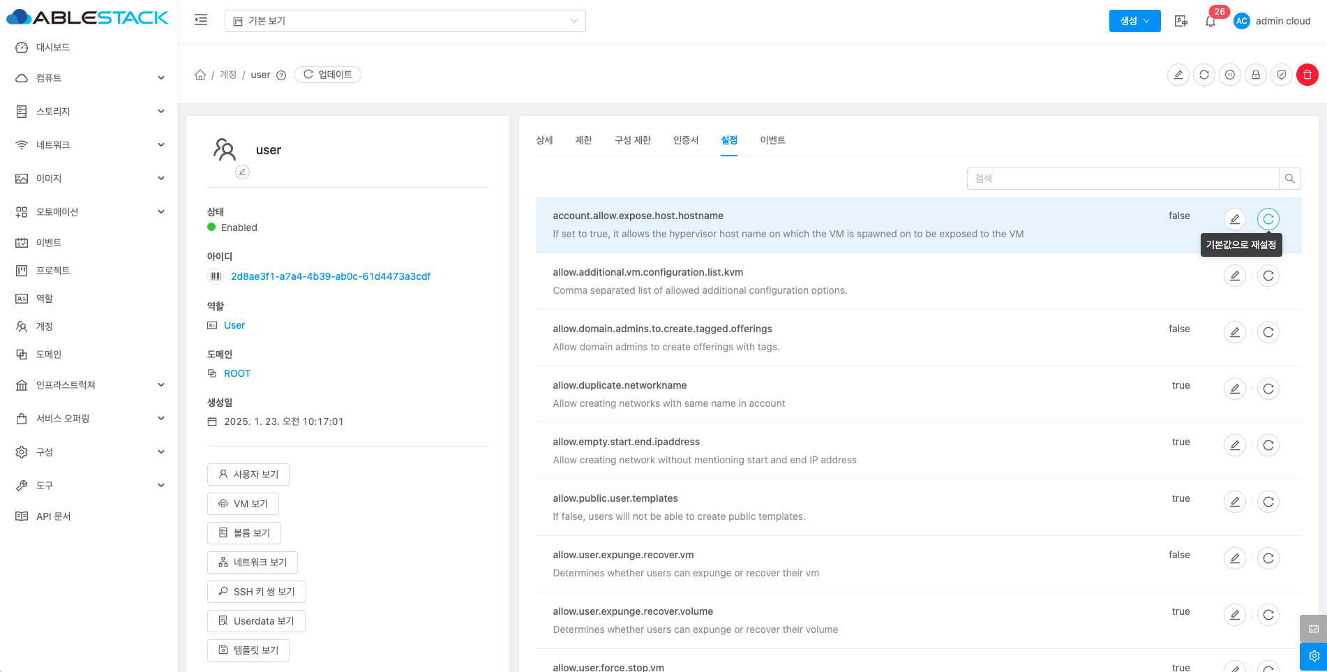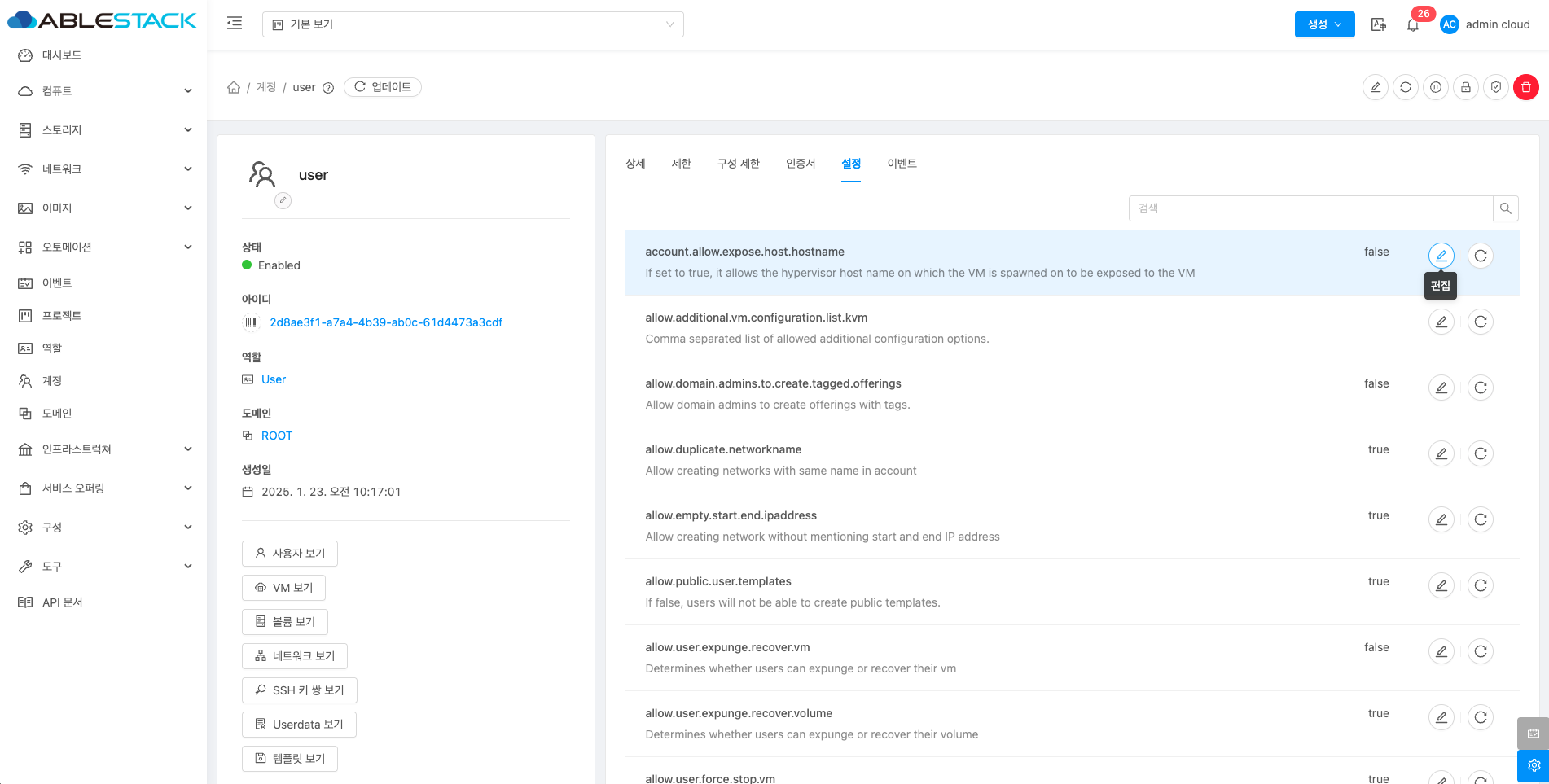 계정에 대한 상세정보를 조회하는 화면입니다. 해당 계정의 이름, 아이디, 역할, 역할 유형, 도메인, API 키 액세스, 전체 IP 주소, VM 합계, 볼륨, 생성일 등의 정보를 확인할 수 있습니다.