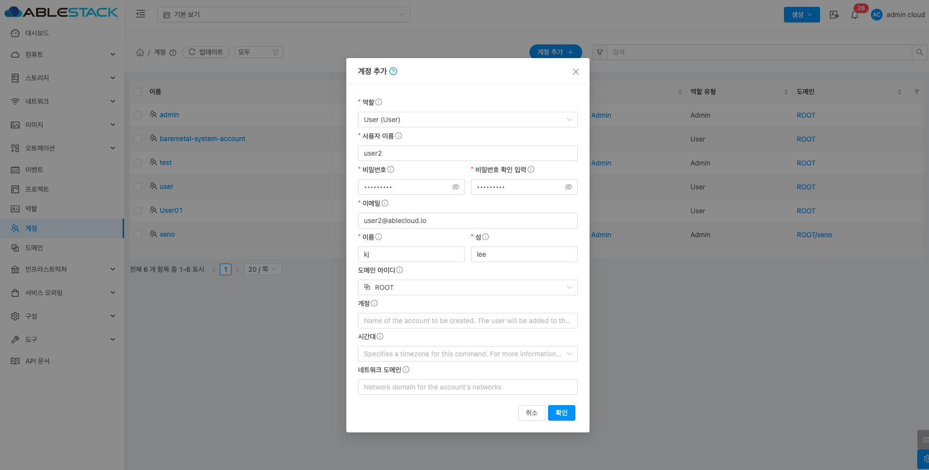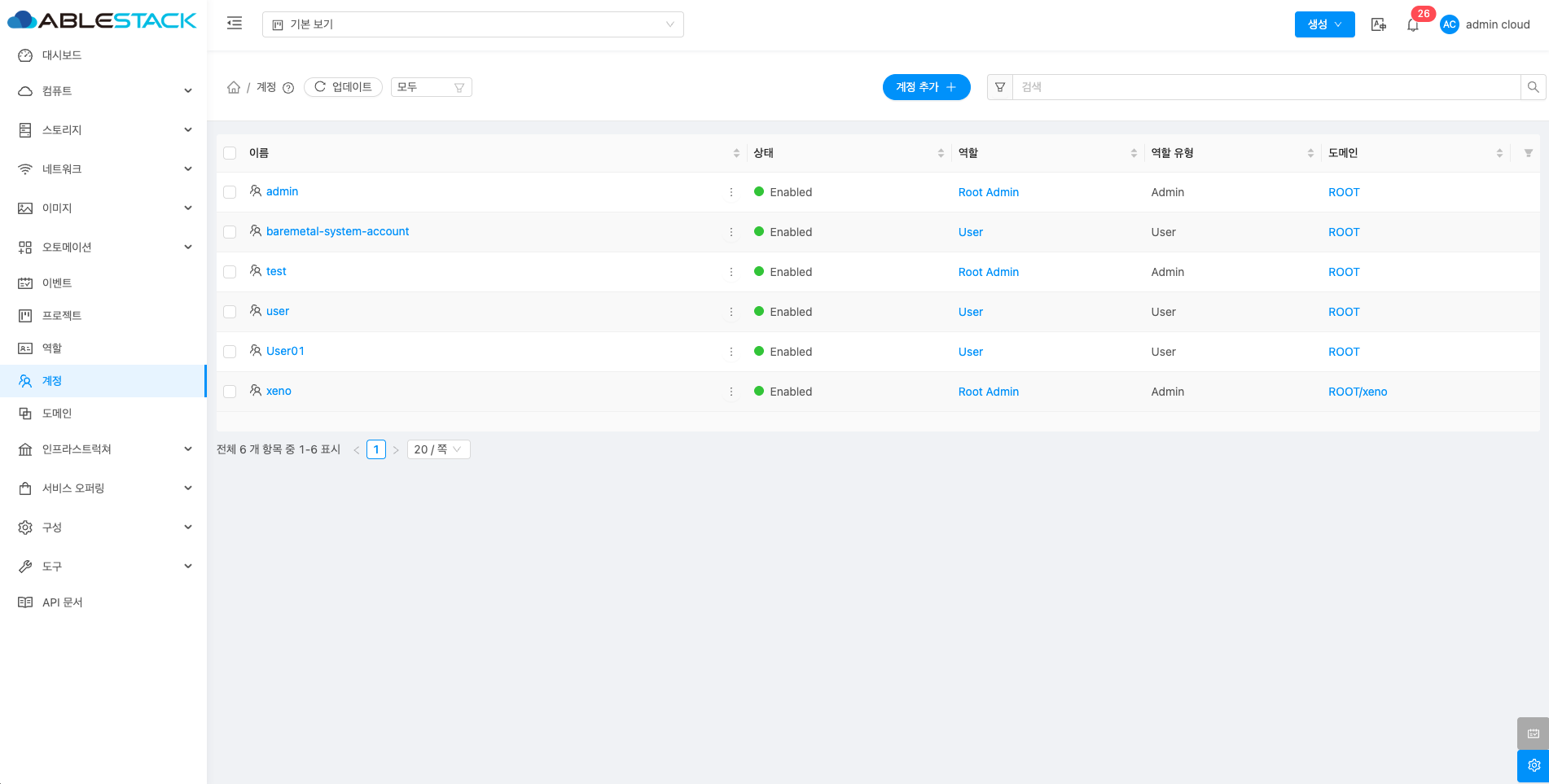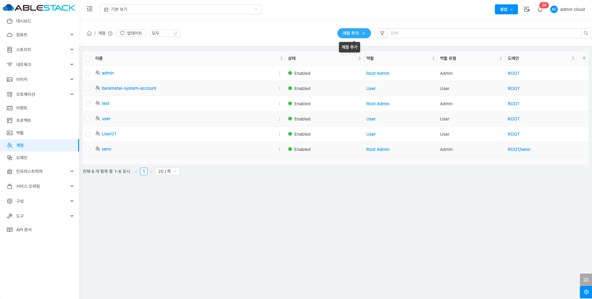 계정은 ABLESTACK 클라우드 리소스를 관리하고 사용하는 기본 단위입니다. 각 계정은 가상 머신, 스토리지, 네트워크 등 리소스를 소유하고 관리할 수 있으며, 리소스 사용에 대한 과금도 계정 단위로 이루어집니다. 계정 내에는 여러 사용자를 생성하고, 리소스에 대한 구성을 제한할 수 있습니다. 계정은 조직이나 개인이 리소스를 효율적으로 관리하고 협업하며 시스템을 안전하게 운영할 수 있도록 도와줍니다.