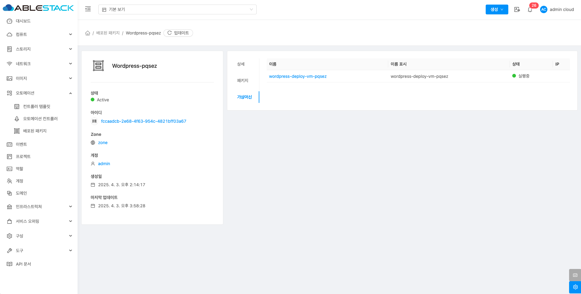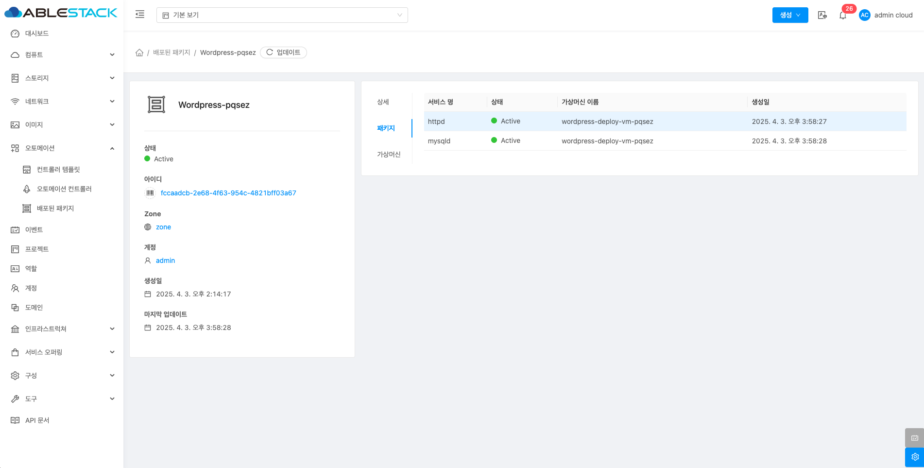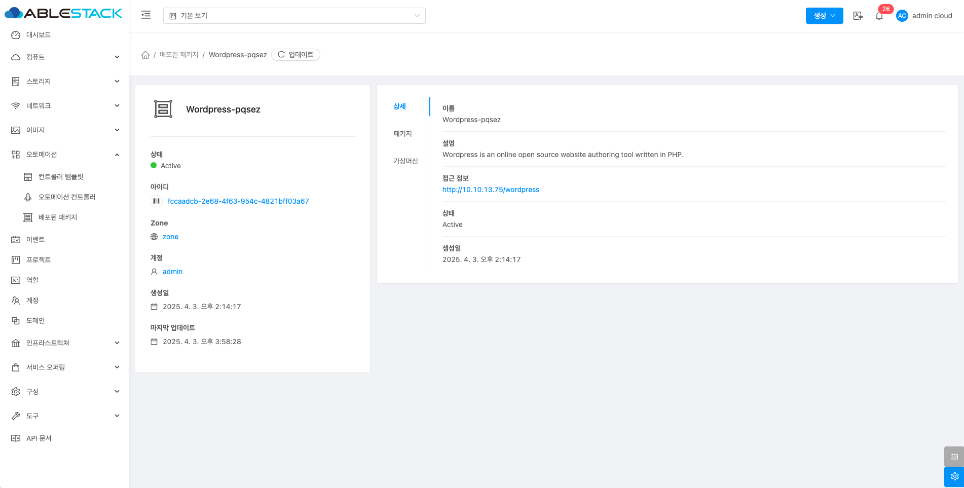 배포된 패키지에 대한 상세정보를 조회하는 화면입니다. 해당 배포된 패키지의 이름, 설명, 접근 정보, 상태, 생성일 등의 정보를 확인할 수 있습니다.
