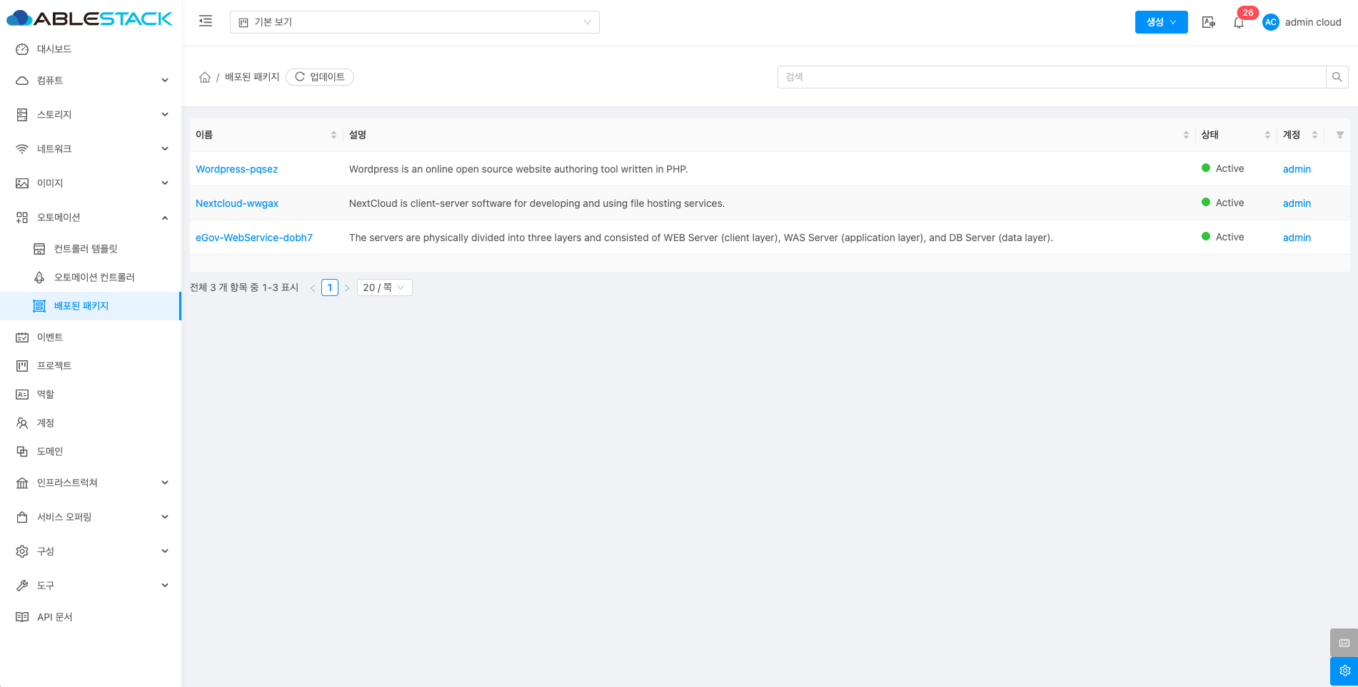 배포된 패키지 목록을 확인하는 화면입니다. 생성된 배포된 패키지 목록을 확인할 수 있습니다.