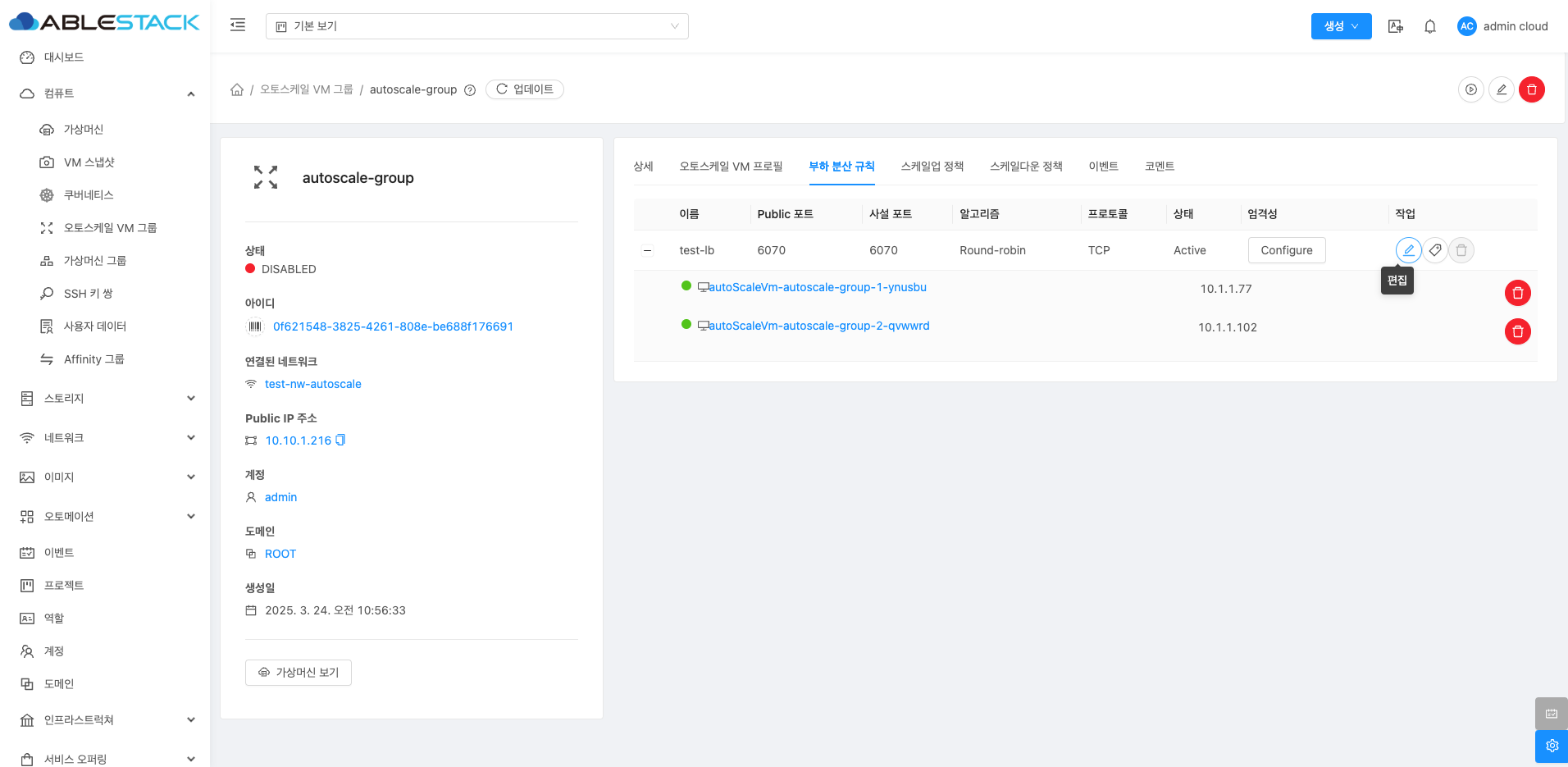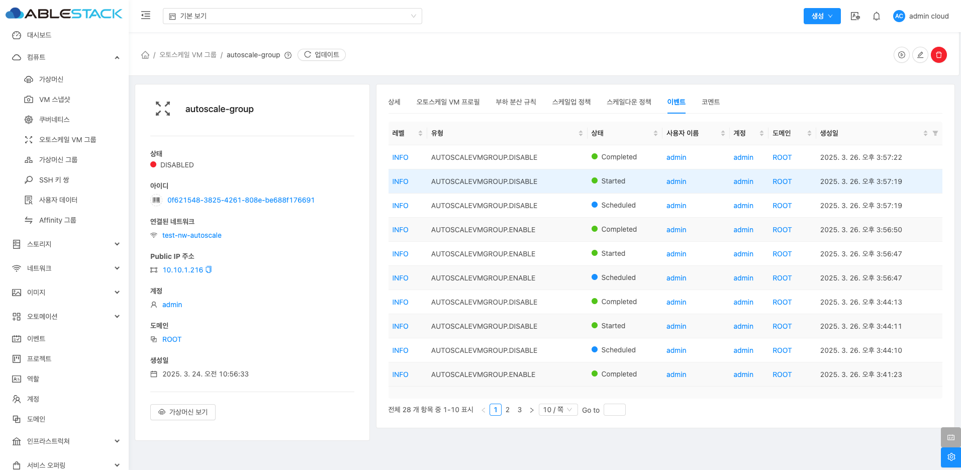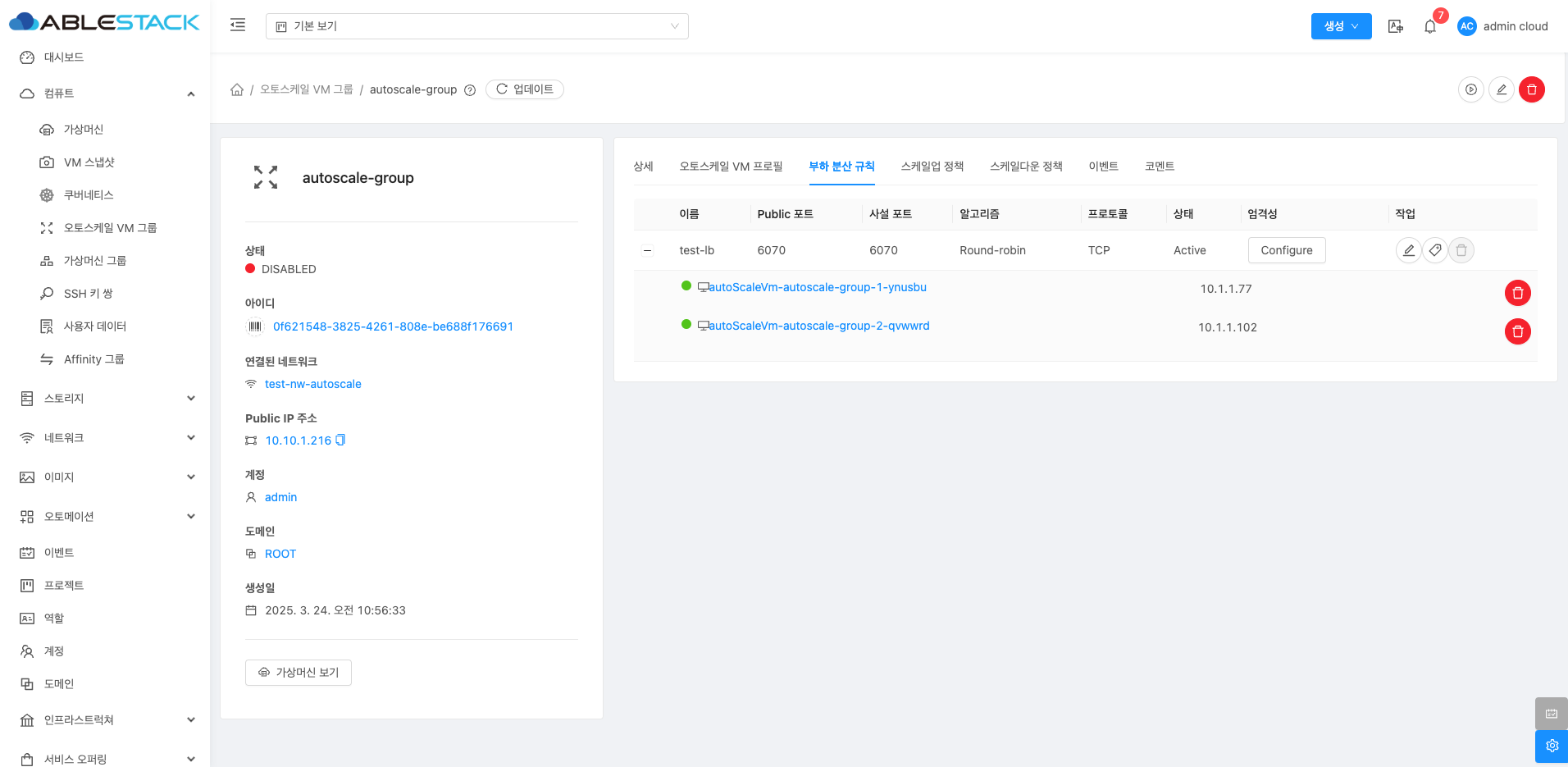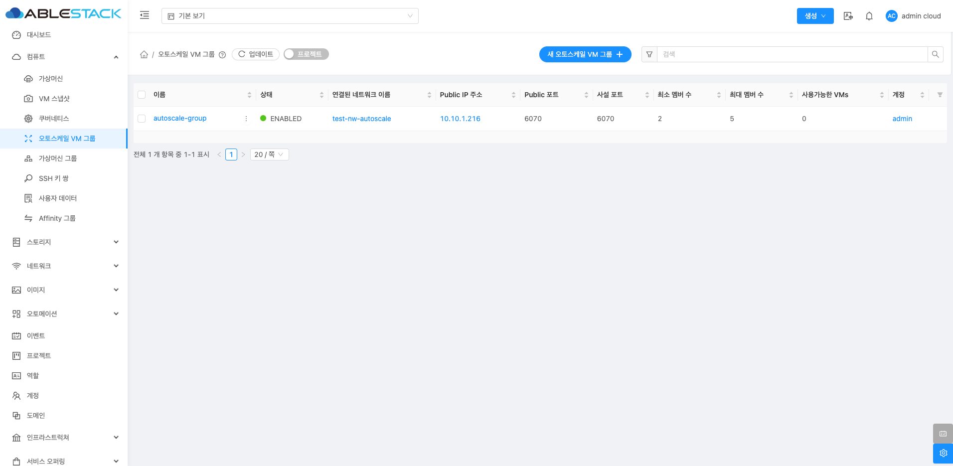 오토스케일 VM 그룹 목록을 조회할 수 있습니다. 등록된 인스턴스 그룹의 이름, 계정, 도메인 등을 확인할 수 있습니다.