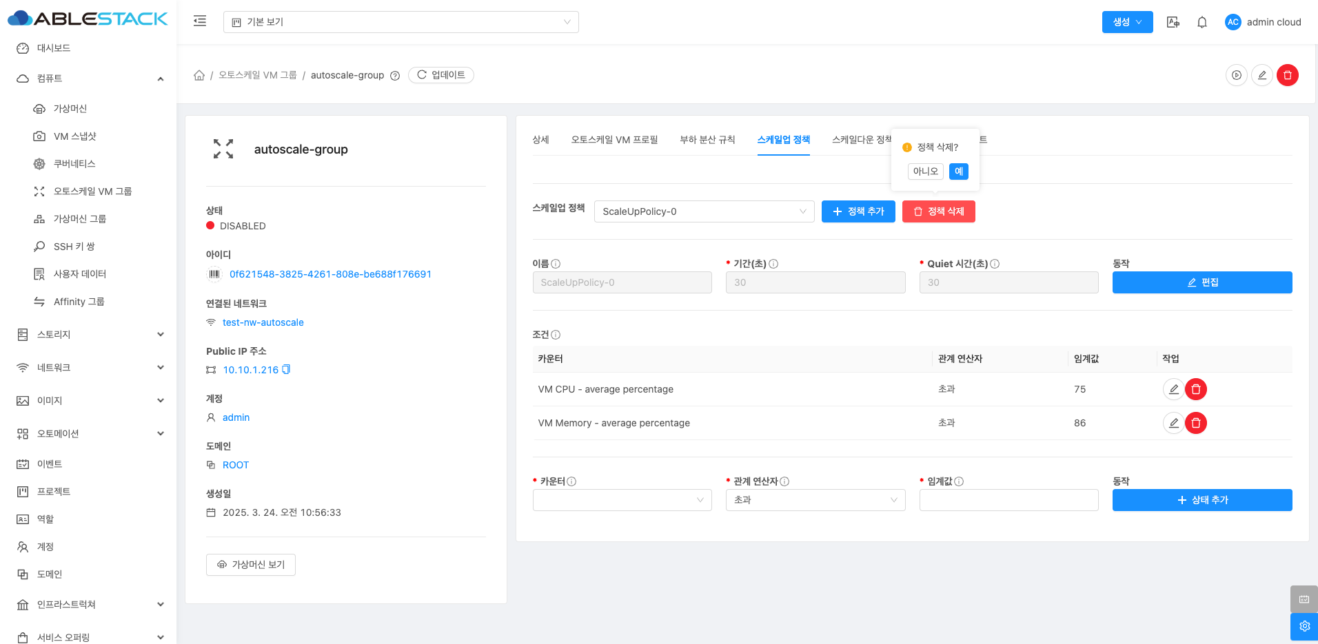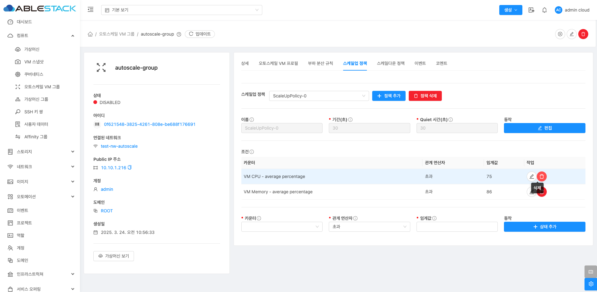 정책 삭제: 생성된 스케일업 정책을 삭제합니다.