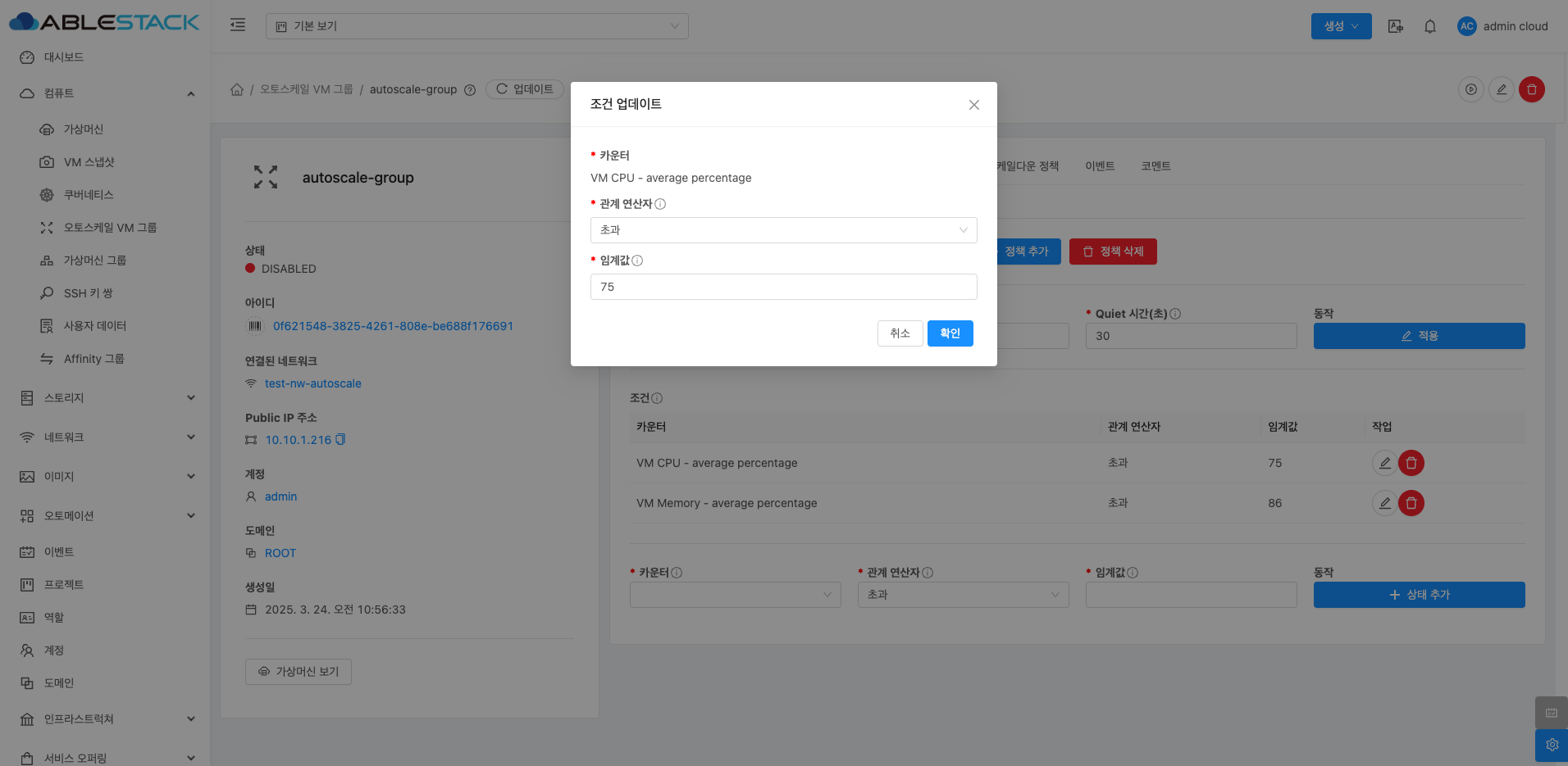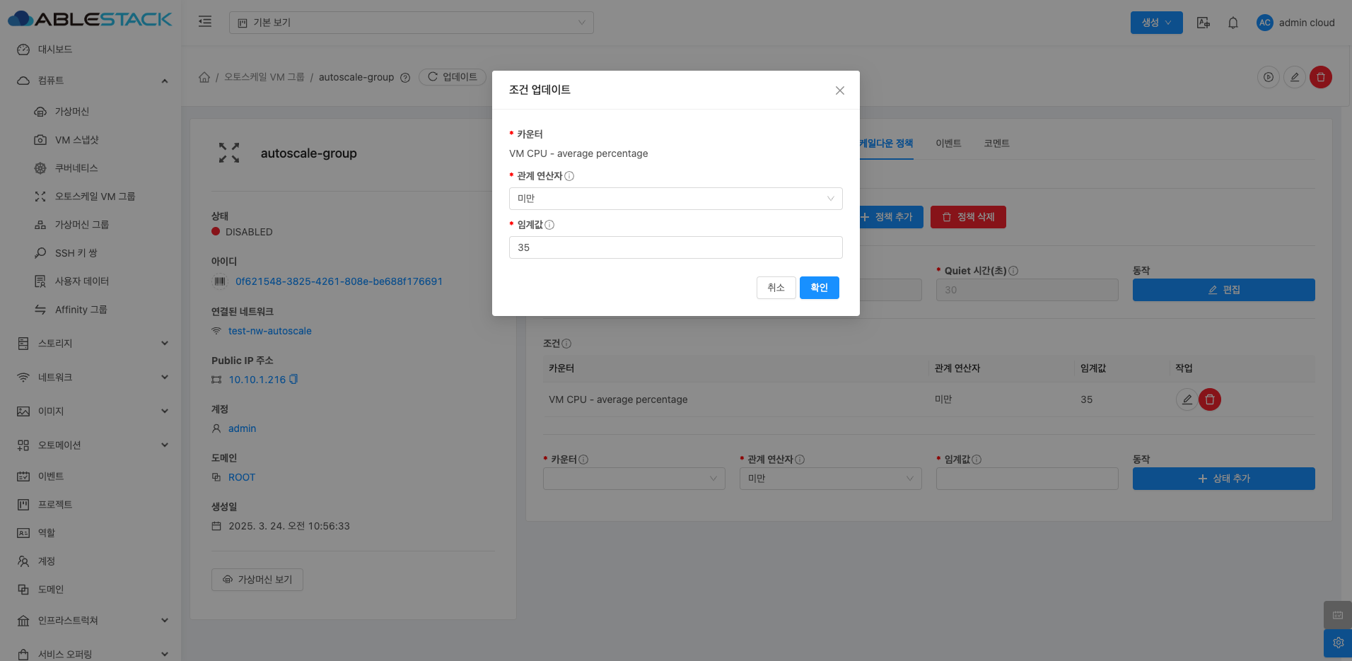 오토스케일 VM 그룹 상세 화면 오른쪽 상단의 오토스케일 VM 그룹 업데이트 버튼을 클릭하여 오토스케일 VM 그룹을 비활성화하면 설정된 스케일업(Scale-Up) 및 스케일다운(Scale-Down) 정책이 일시적으로 중지되어, VM 인스턴스의 자동 조정을 멈출 수 있습니다.