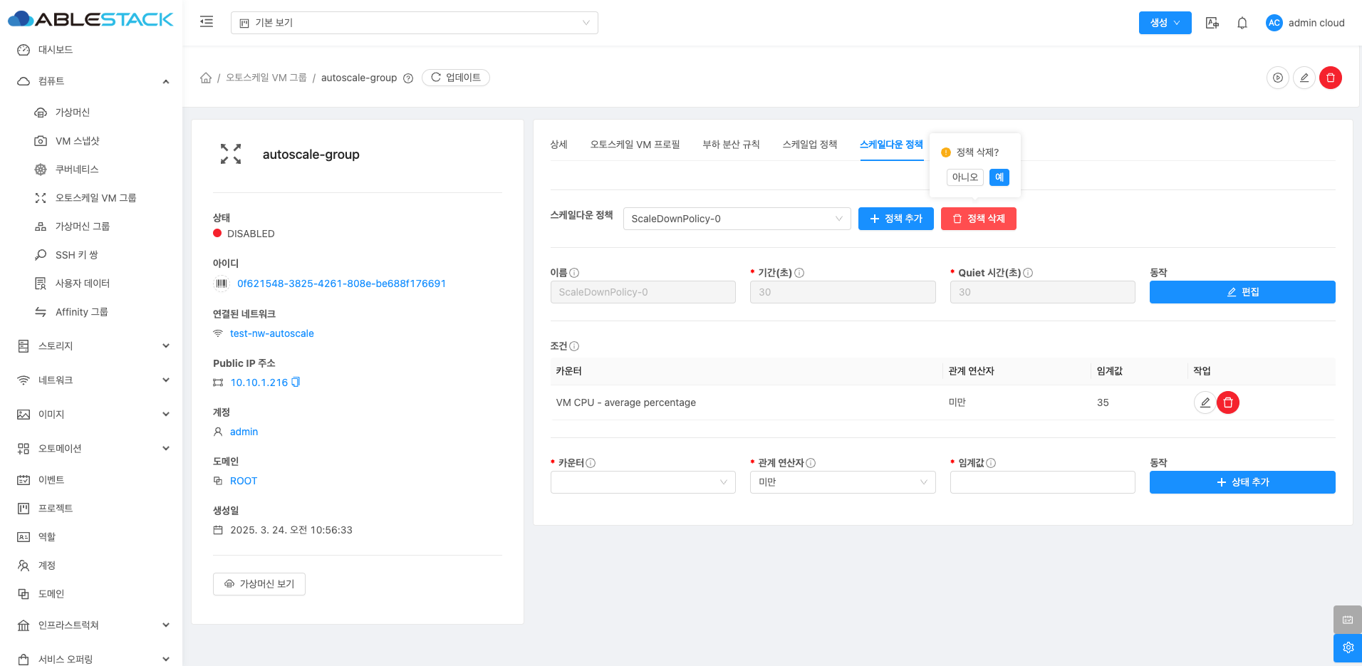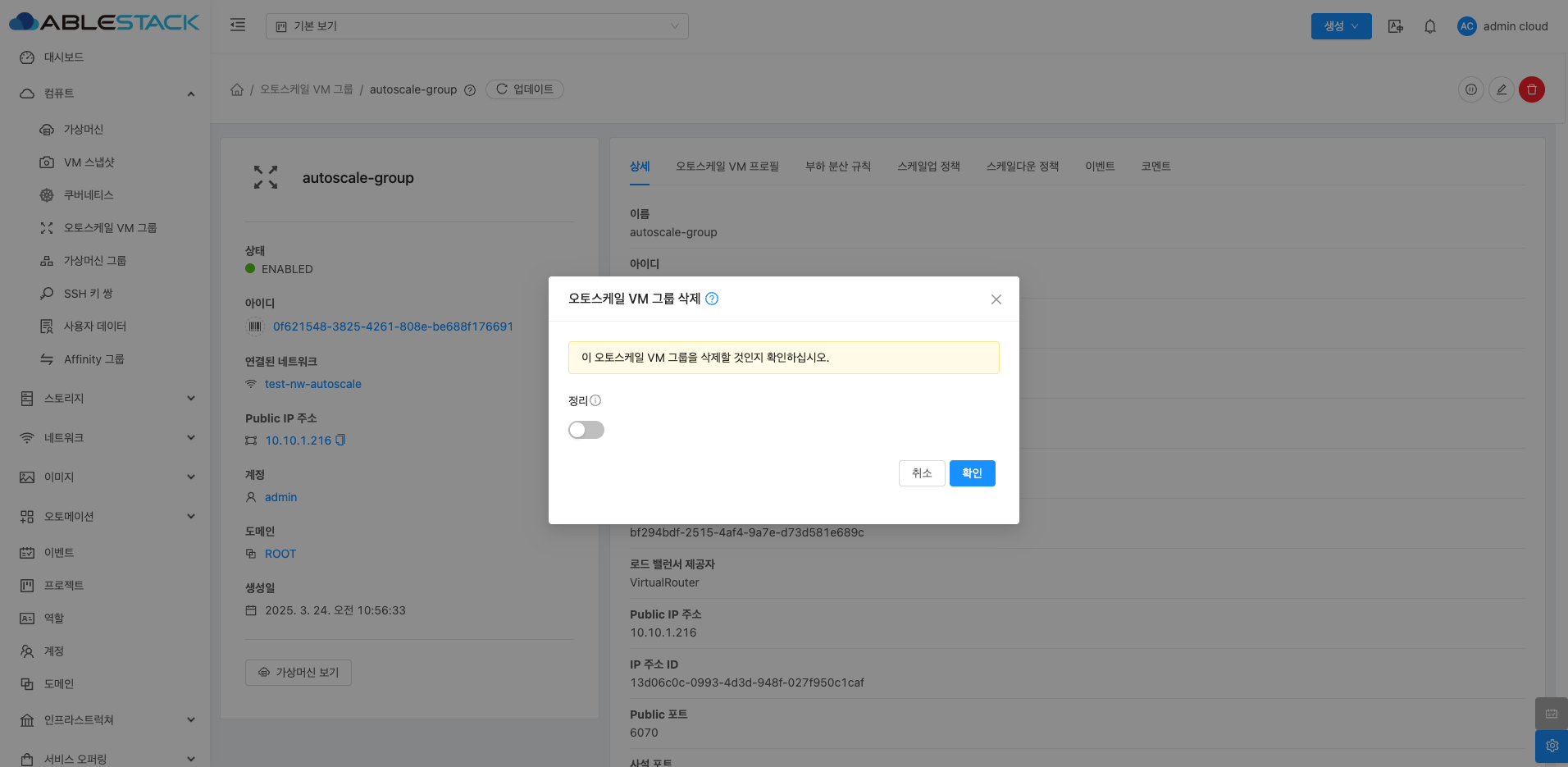 - "정리" 스위치를 비활성화 :오토스케일 VM 그룹만 삭제되고, 기존 VM 인스턴스는 그대로 유지됩니다.