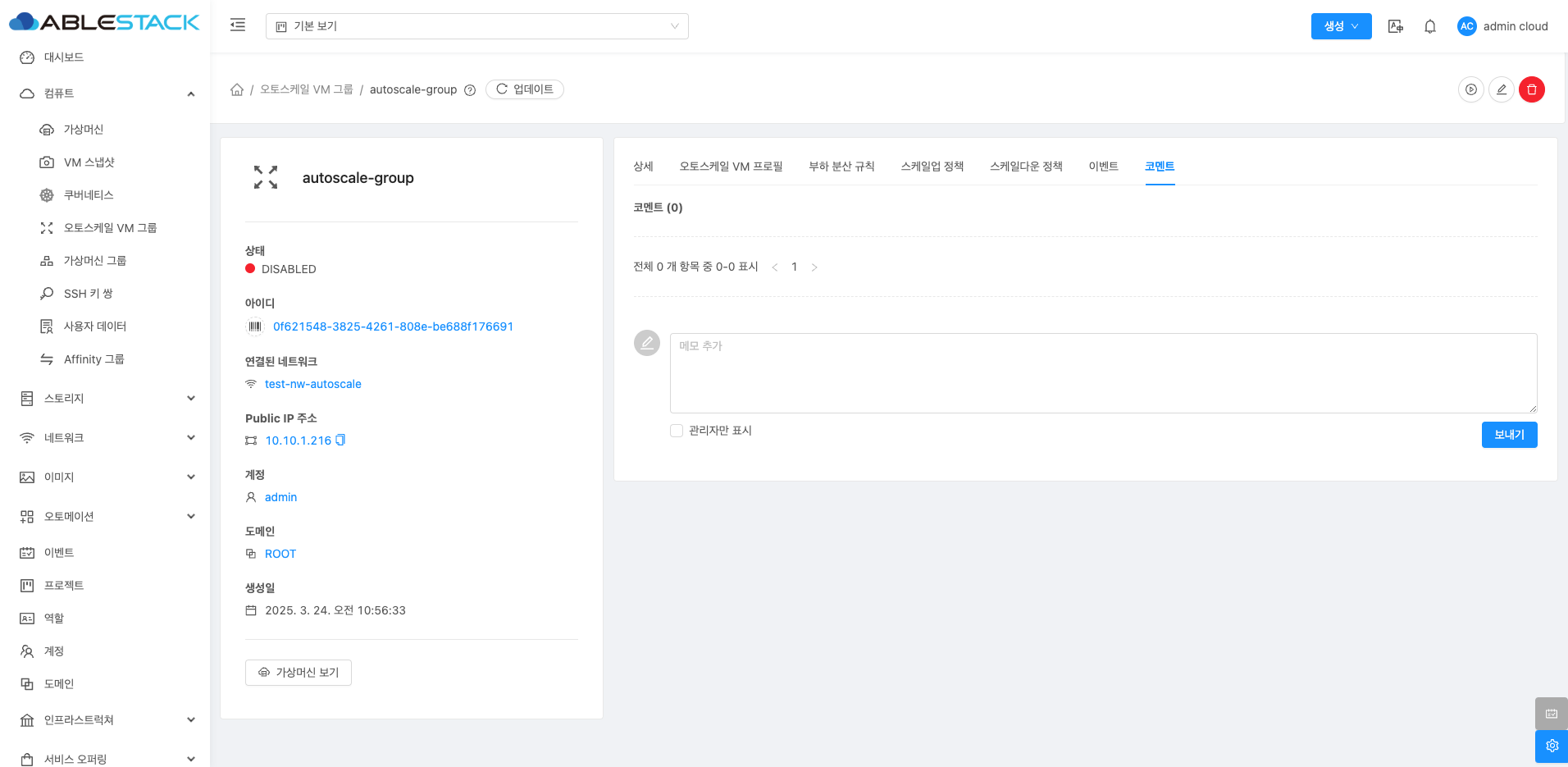 인스턴스 그룹에 대한 코멘트를 확인하는 화면입니다. 오토스케일 VM 프로필은 오토스케일 VM 그룹 내에서 실행되는 가상 머신(VM)의 구체적인 설정을 정의하는 구성 요소입니다. 이 프로필을 통해 각 VM 인스턴스에 필요한 리소스를 정밀하게 설정하고, 스케일링 동작을 최적화할 수 있습니다.