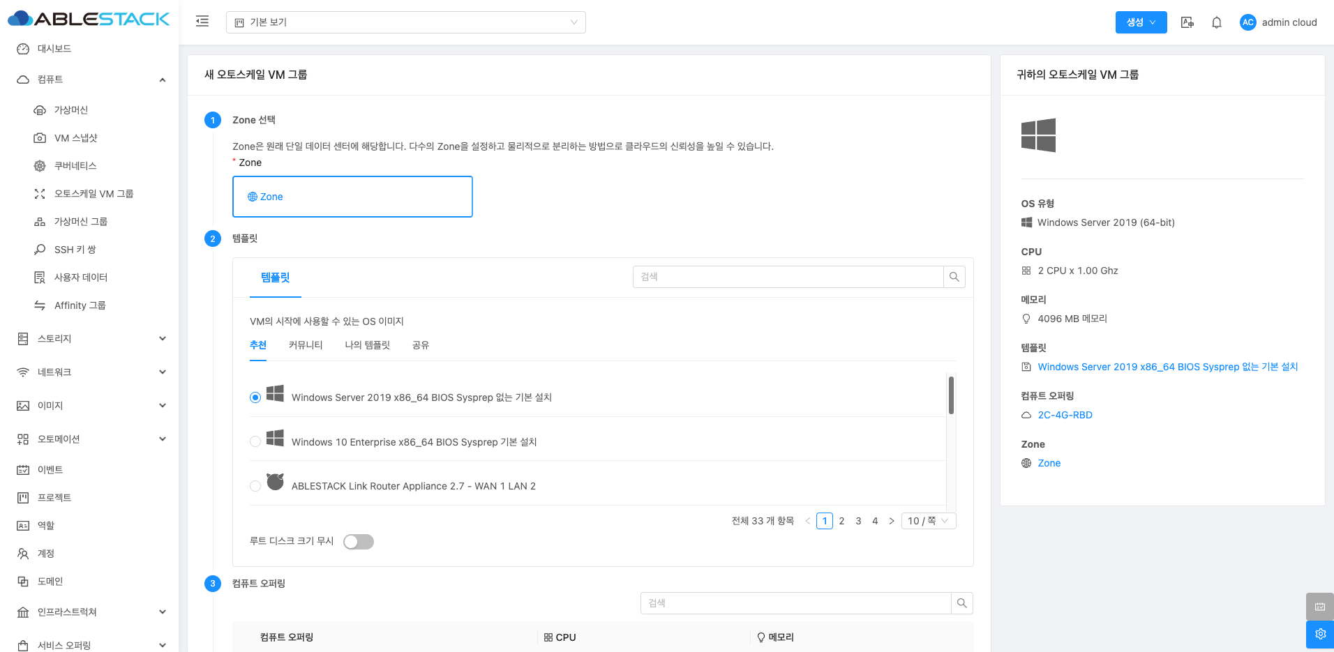오토스케일 VM 그룹의 VM이 사용할 템플릿을 선택합니다.