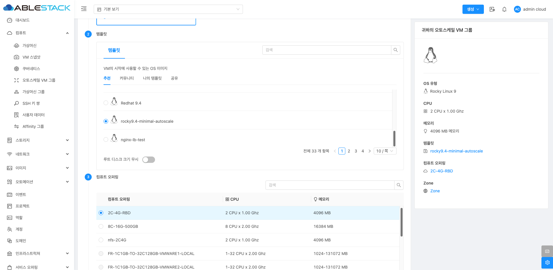- 템플릿 :VM을 생성할 때 사용할 운영 체제 이미지 또는 가상 머신의 기본 이미지를 변경합니다.