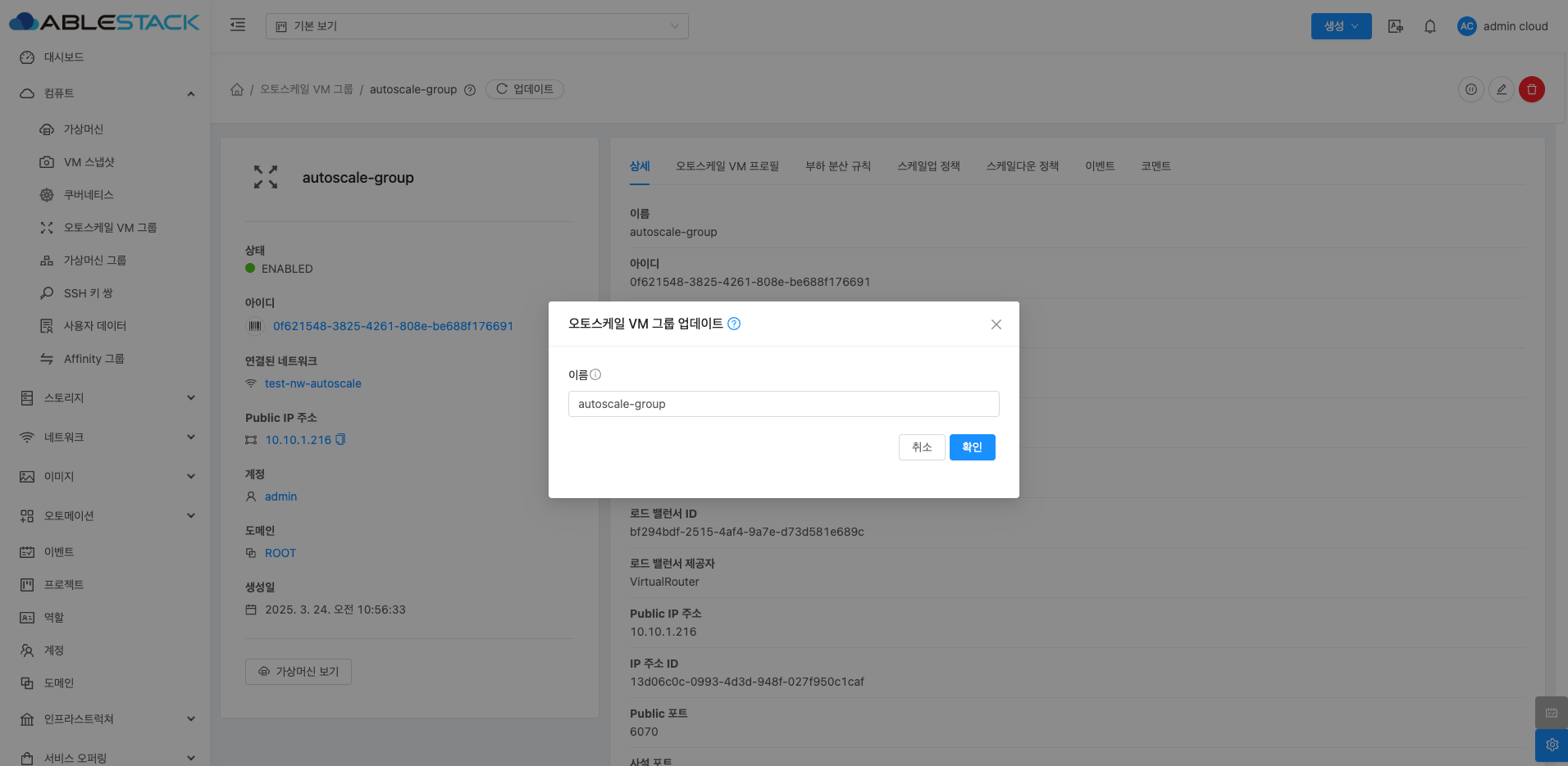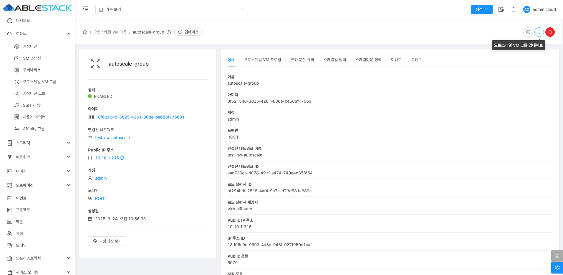 오토스케일 VM 그룹 상세 화면 오른쪽 상단의 오토스케일 VM 그룹 업데이트 버튼을 클릭하여 오토스케일 VM 그룹을 활성화하면 설정된 스케일업(Scale-Up) 및 스케일다운(Scale-Down) 정책이 다시 시작되어, VM 인스턴스의 자동 조정을 시작할 수 있습니다.