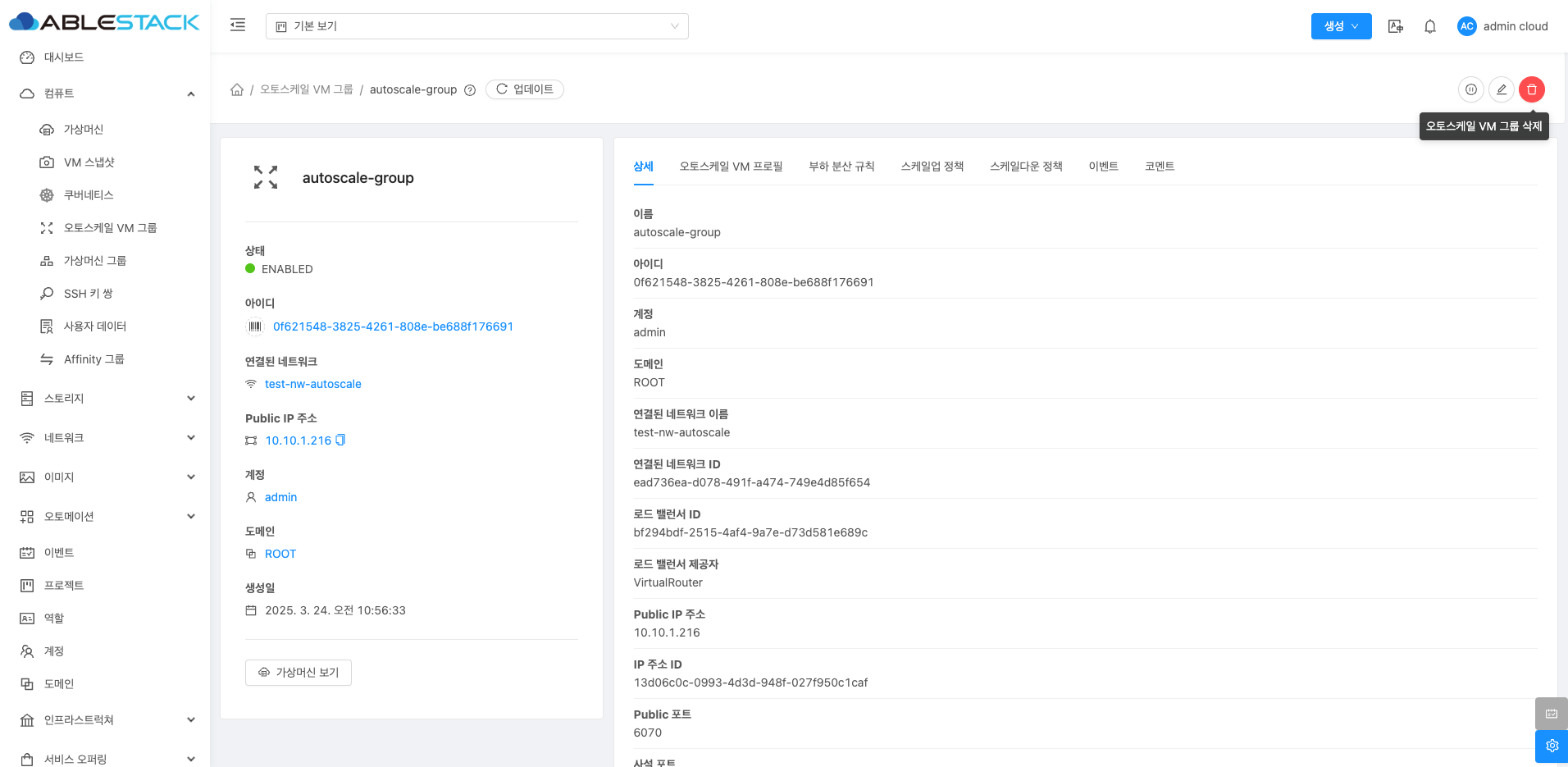 오토스케일 VM 그룹 상세 화면 오른쪽 상단의 오토스케일 VM 그룹 삭제 버튼을 클릭하여 오토스케일 VM 그룹을 삭제할 수 있습니다.