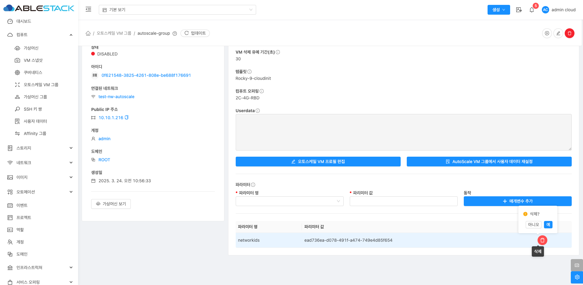 파라미터 삭제 기능은 특정 파라미터를 제거하여 가상 머신 또는 오토스케일 VM 그룹의 설정에서 해당 파라미터를 더 이상 사용하지 않도록 하는 기능입니다.