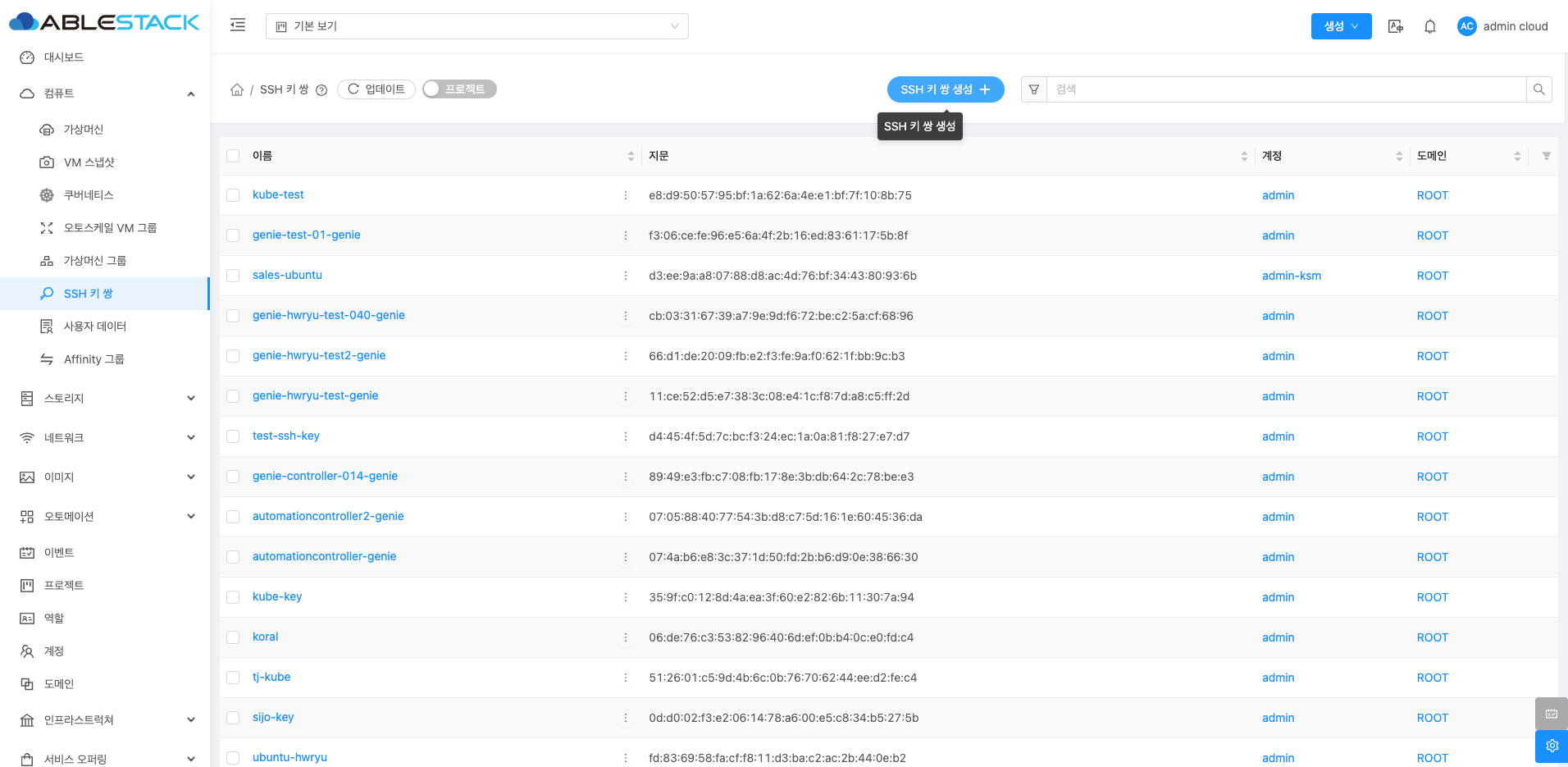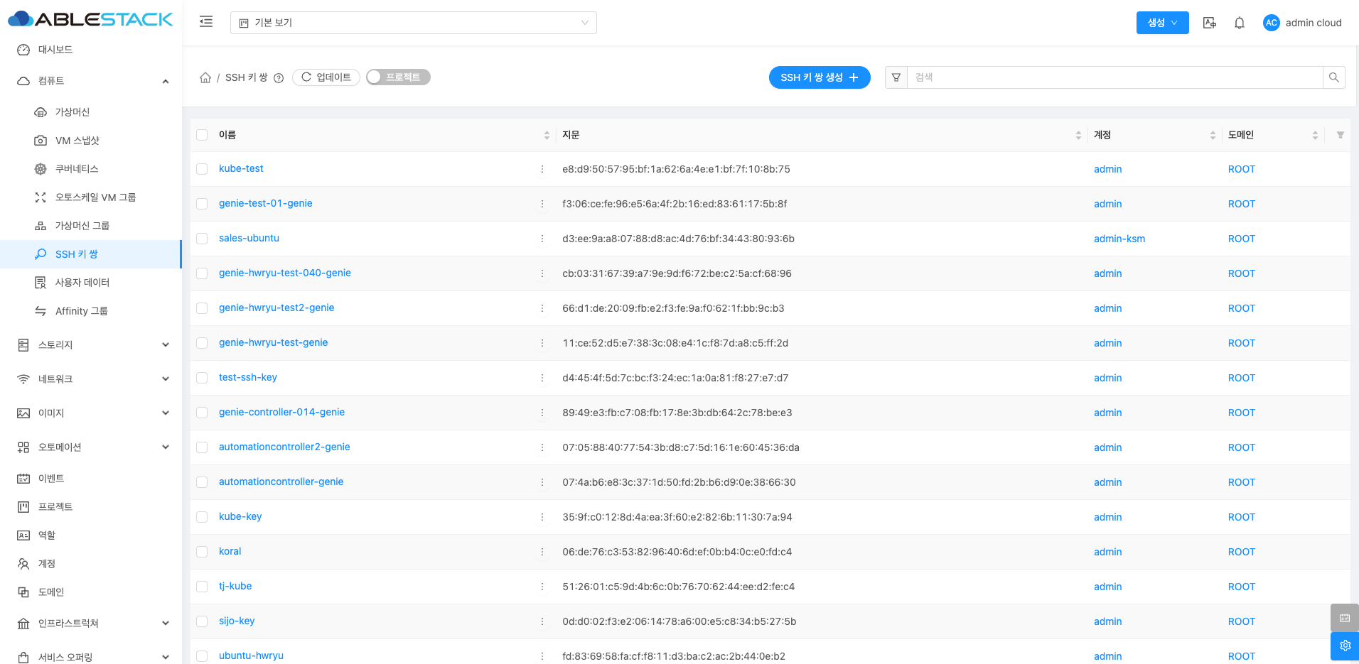 SSH 키 쌍 목록을 확인하는 화면입니다. 생성된 SSH 키 쌍 목록을 확인하거나 이름, 지문, 계정, 도메인 등의 정보를 조회할 수 있습니다.