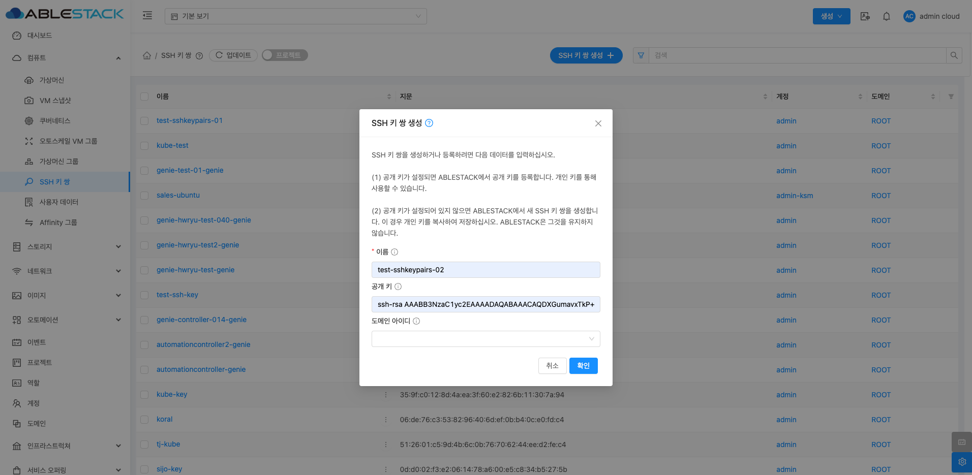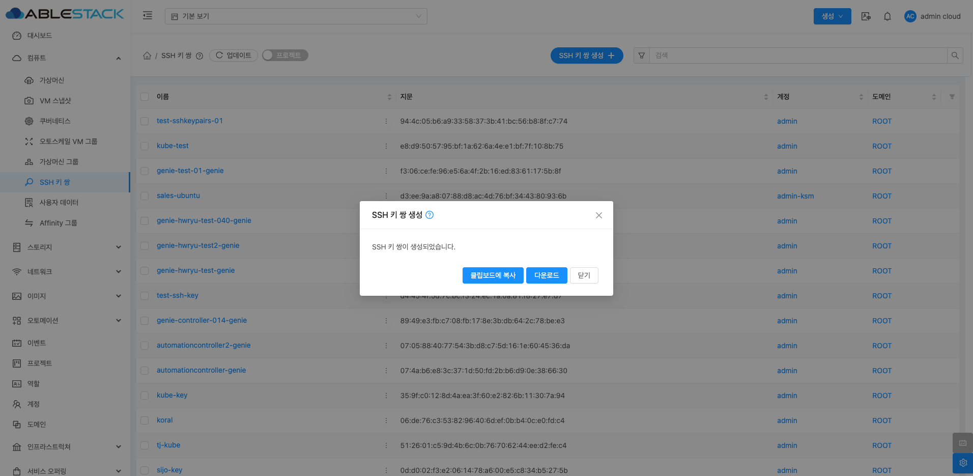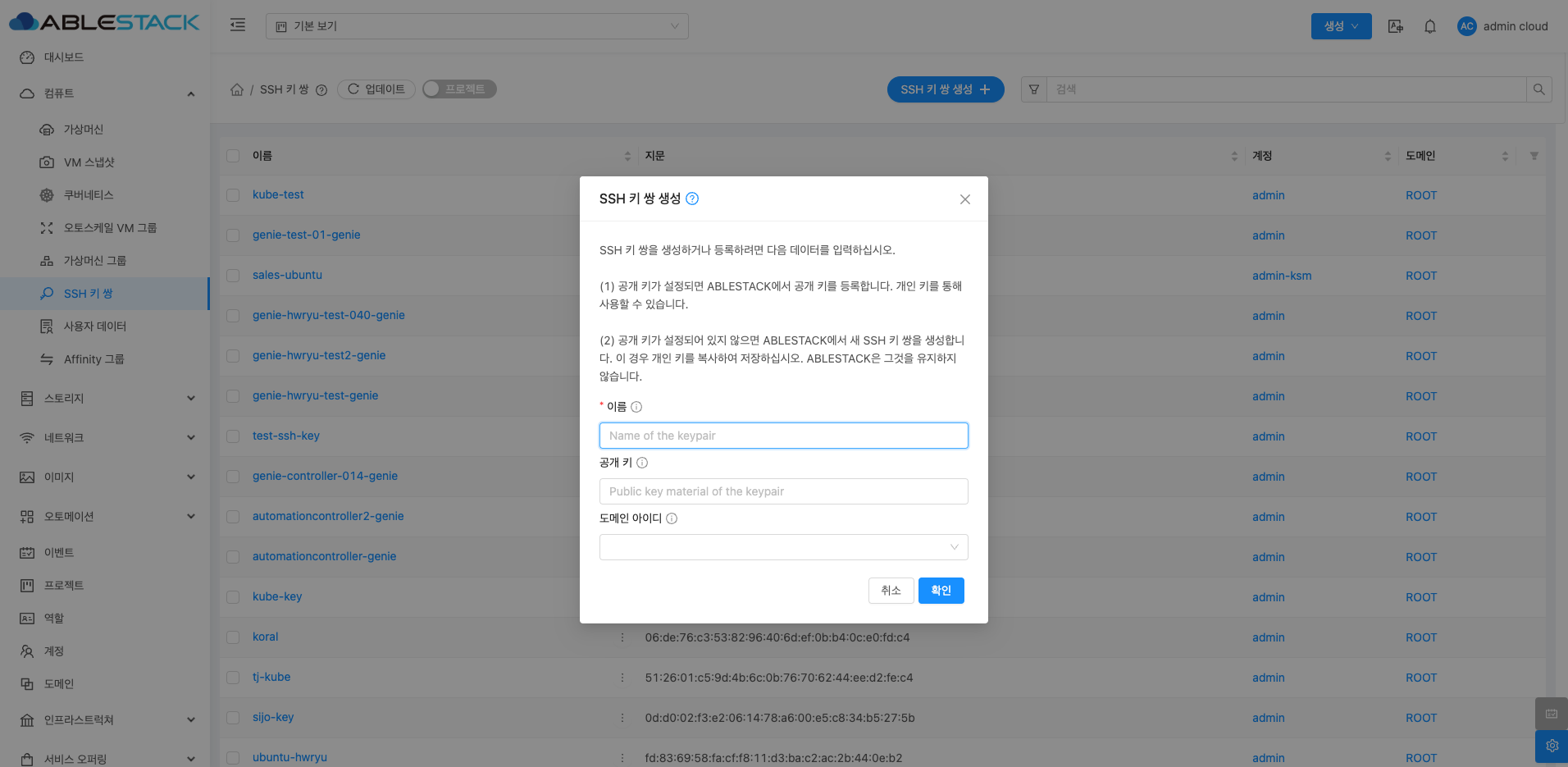 공개 키가 설정되어 있지 않으면 ABLESTACK에서 새 SSH 키 쌍을 생성합니다. 이 경우 개인 키를 복사하여 저장하십시오. ABLESTACK은 그것을 유지하지 않습니다.
