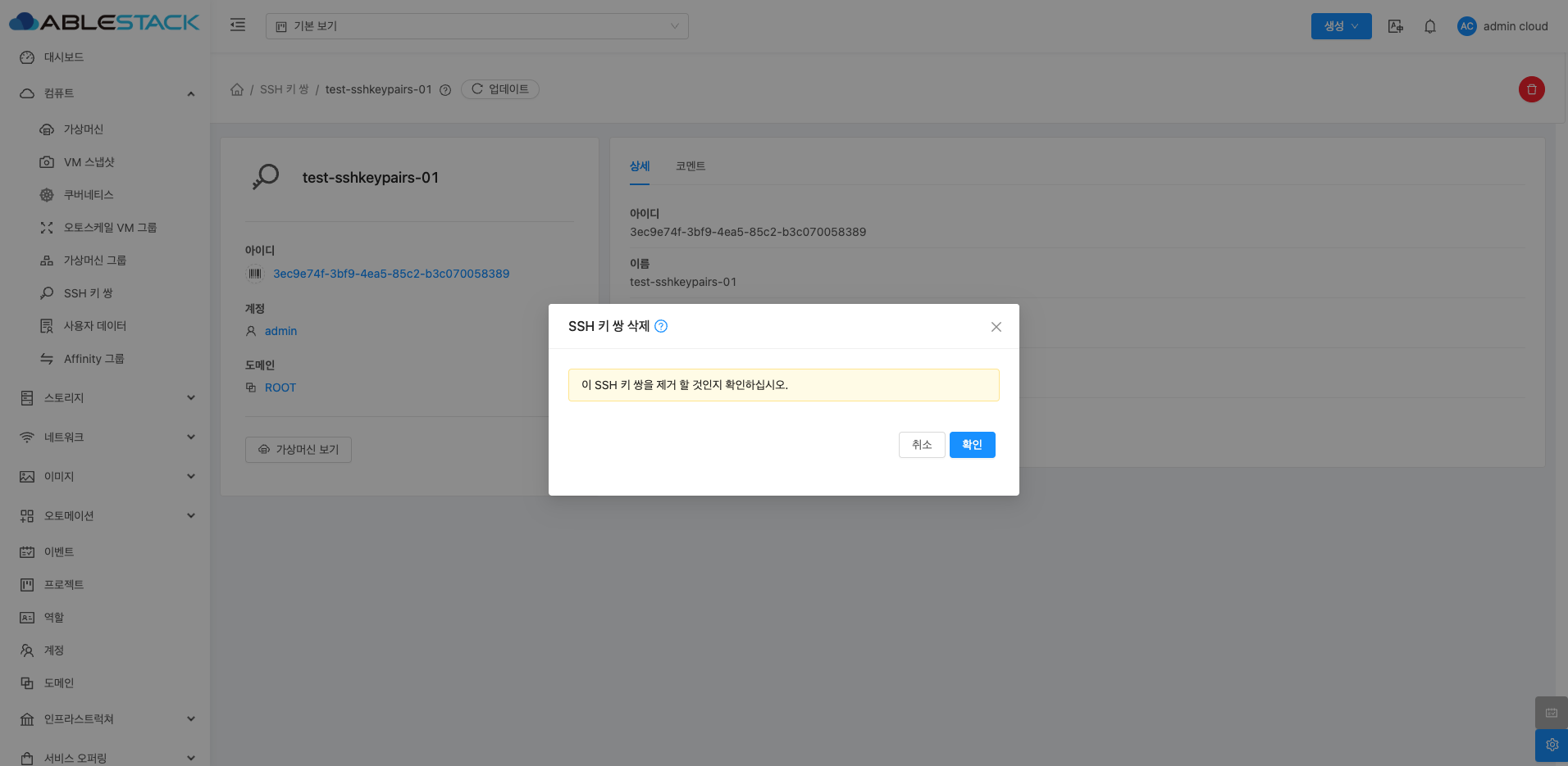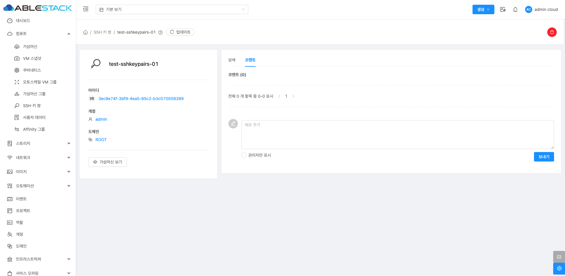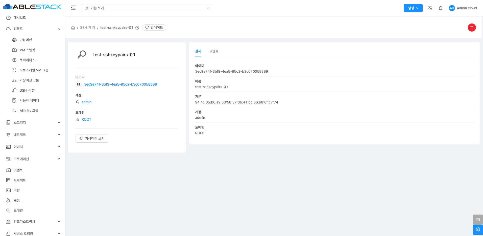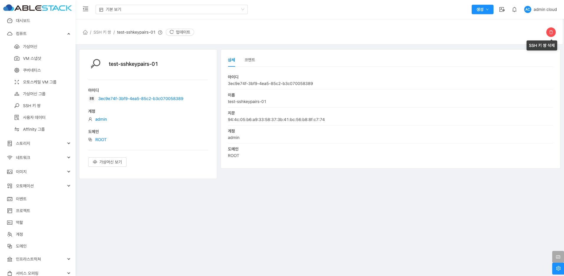 SSH 키 쌍에 대한 상세 정보를 확인하는 화면입니다. 좌측 화면의 "가상머신 보기" 버튼을 통해 해당 SSH 키 쌍을 사용중인 가상머신들을 확인할 수 있으며 우측 화면에서는 이름, UUID, 지문, 계정, 도메인등 상세 정보를 확인할 수 있습니다.