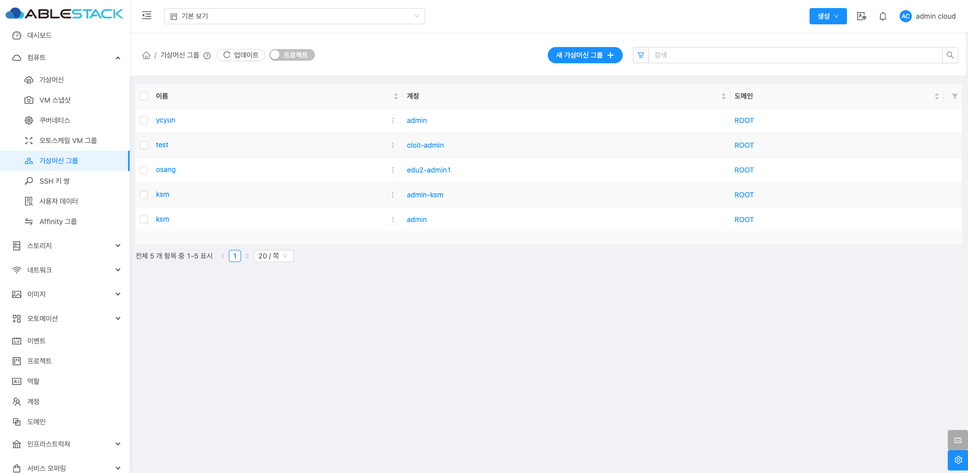 인스턴스 그룹 목록을 조회할 수 있습니다. 등록된 인스턴스 그룹의 이름, 계정, 도메인 등을 확인할 수 있습니다.
