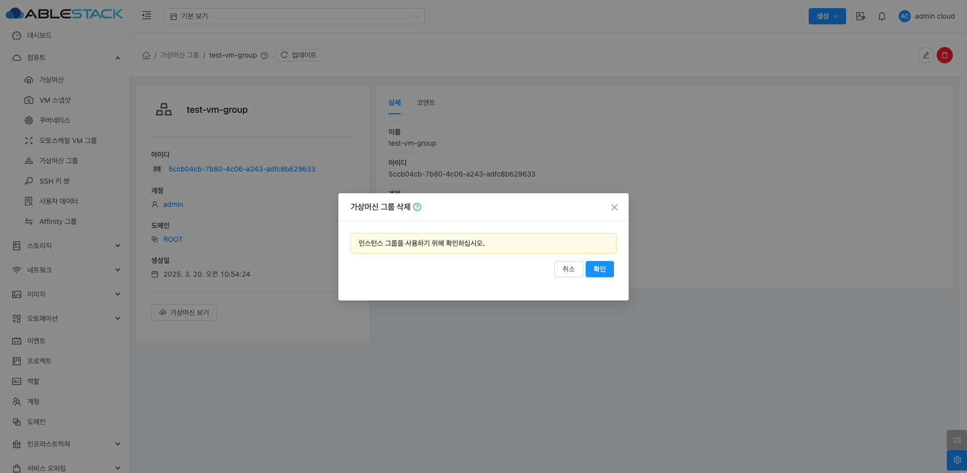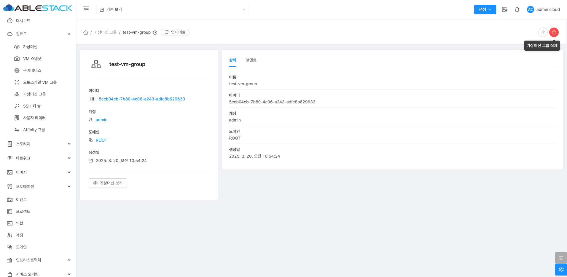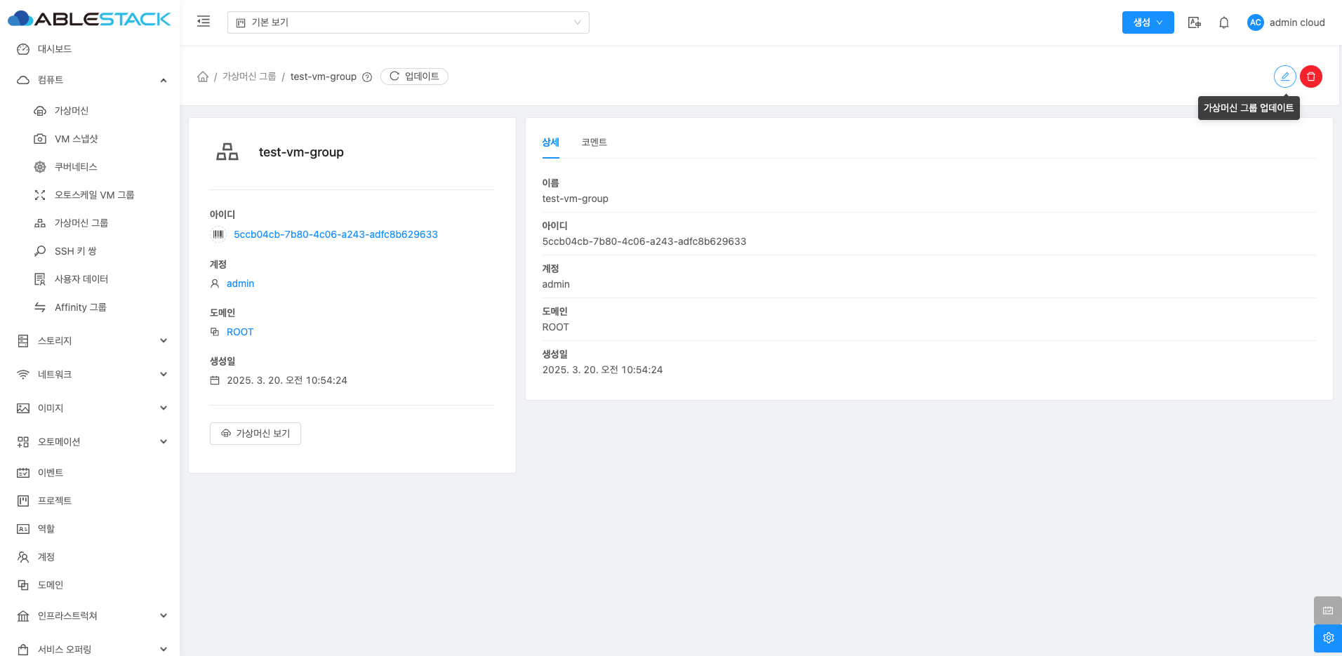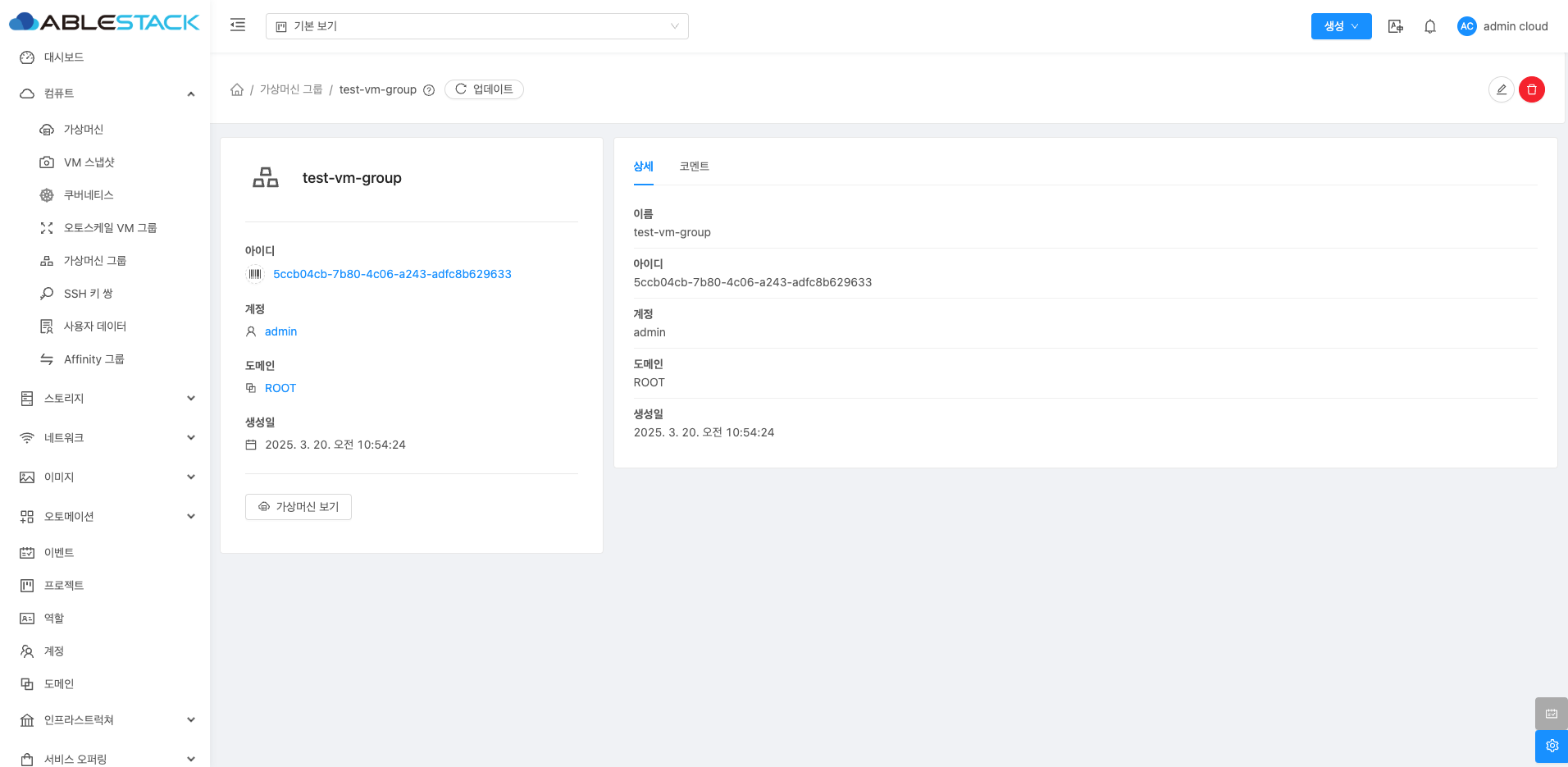 인스턴스 그룹에 대한 상세 정보를 확인하는 화면입니다. 좌측 화면의 "가상머신 보기" 버튼을 통해 해당 인스턴스 그룹을 적용중인 가상머신들을 확인할 수 있으며 우측 화면에서는 이름, UUID, 계정, 도메인, 생성일 등 상세 정보를 확인할 수 있습니다.