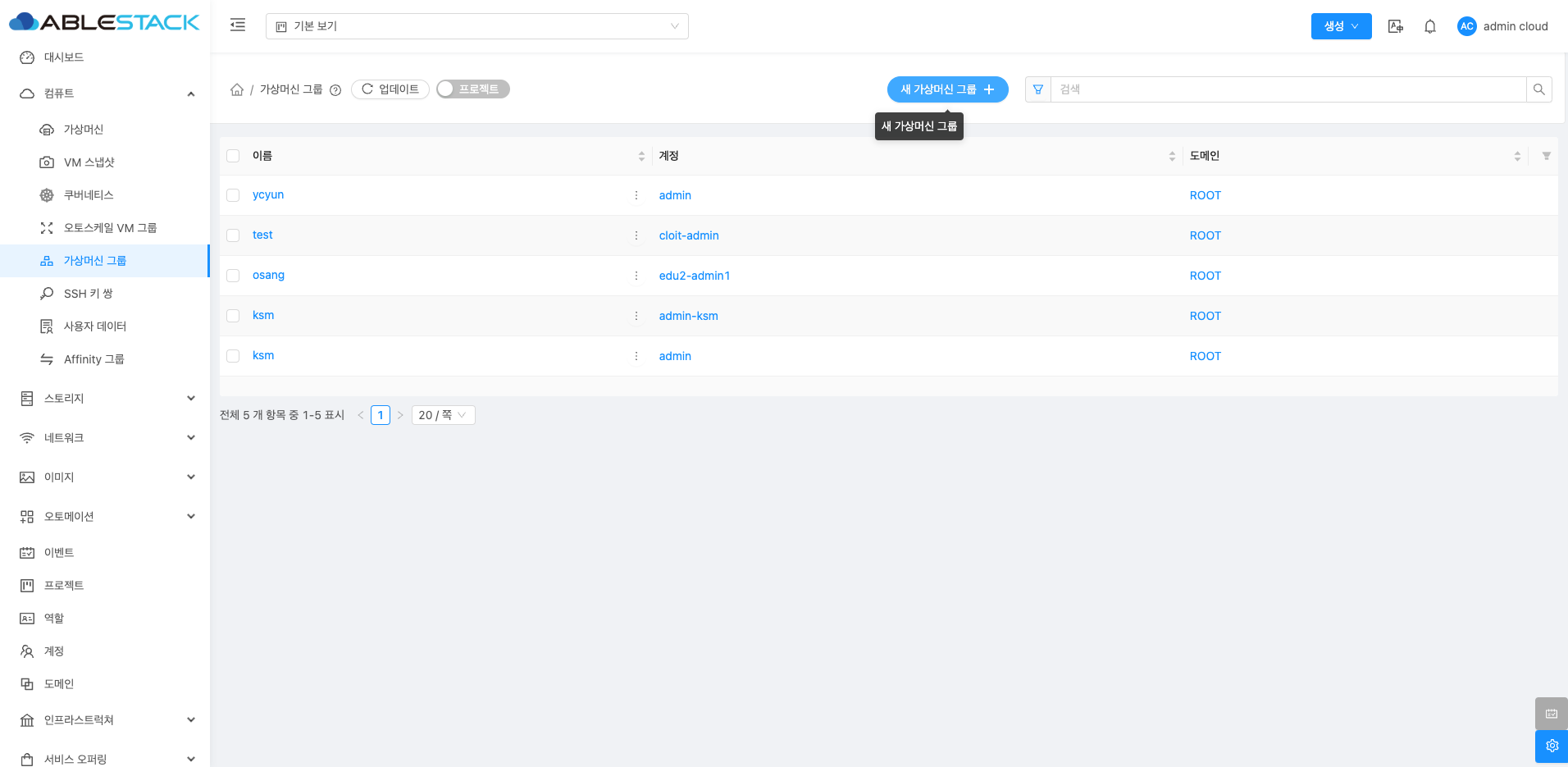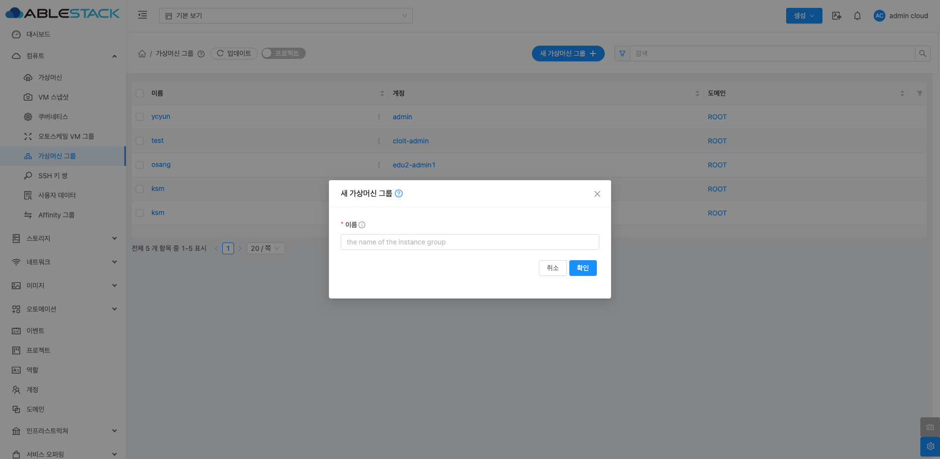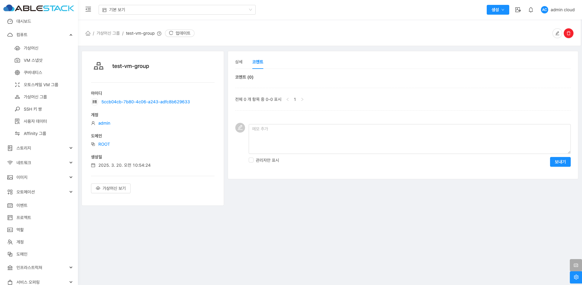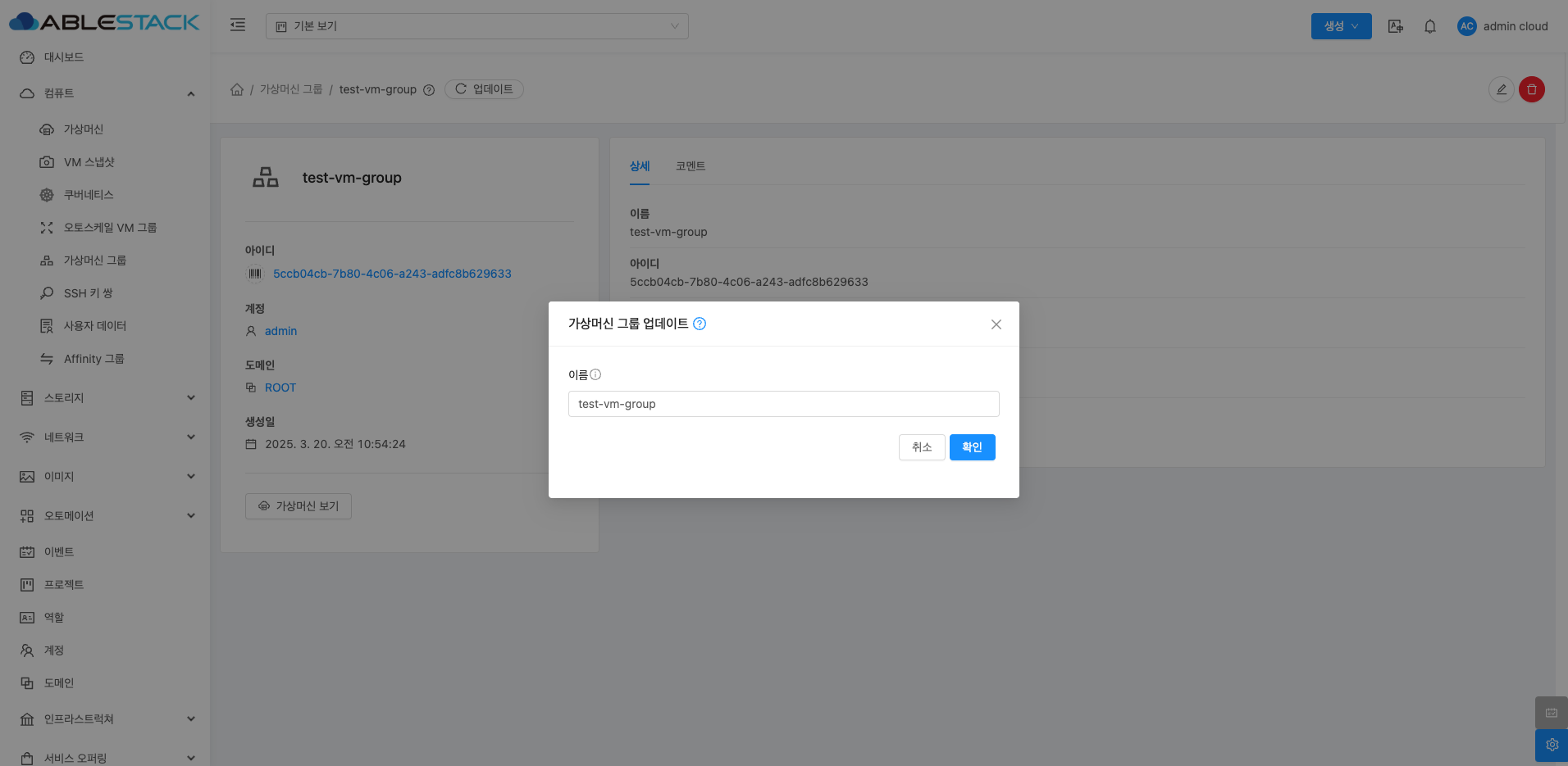 인스턴스 그룹에 대한 상세 정보를 확인하는 화면입니다. 좌측 화면의 "가상머신 보기" 버튼을 통해 해당 인스턴스 그룹을 적용중인 가상머신들을 확인할 수 있으며 우측 화면에서는 이름, UUID, 계정, 도메인, 생성일 등 상세 정보를 확인할 수 있습니다.